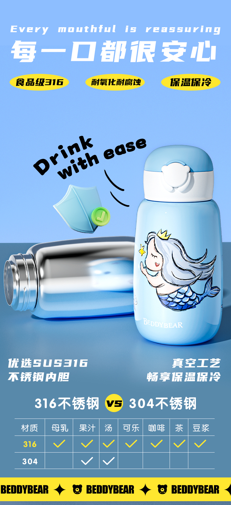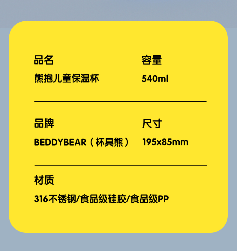 杯具熊熊抱儿童保温壶保温效果:55℃以上(8小时) 保冷效果:8℃以下(4小时)