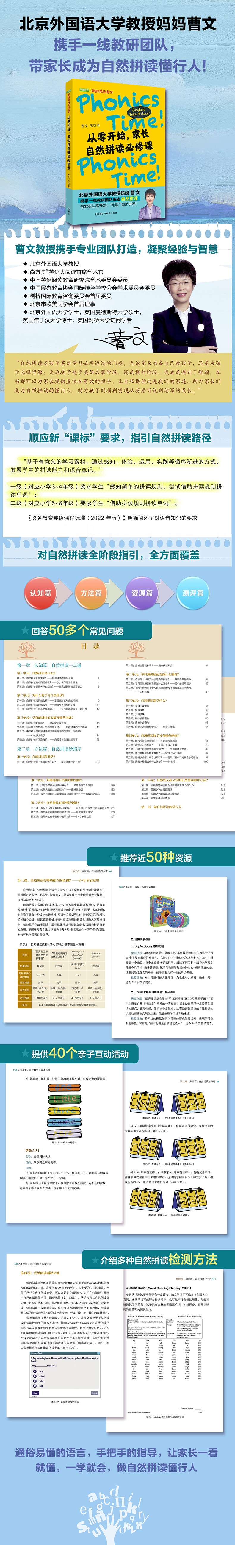 本书以来自一线的自然拼读相关的问题和案例为切入点,分为“认知篇”“方法篇”“资源篇”和“测评篇”四大篇章,带领家长从零开始,了解自然拼读的理念、作用、方法、资源和测评的全流程,与家长一起探索自然拼读的神奇,做自然拼读的懂行人。无论您是想自己了解自然拼读,还是为孩子选择学习资源:无论孩子是处于英语启蒙阶段,还是在提升阶段遇到了瓶颈,本书都可以为您提供直接和有效的指导,助力您成为自然拼读的懂行人,助力孩子顺利实现英语从听说到读写的成长。