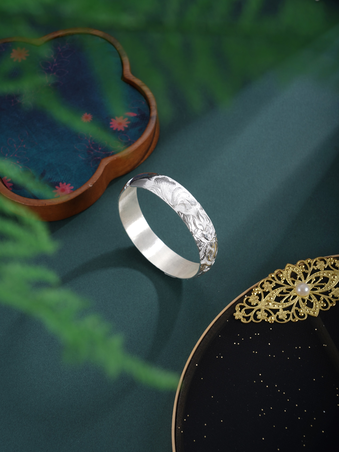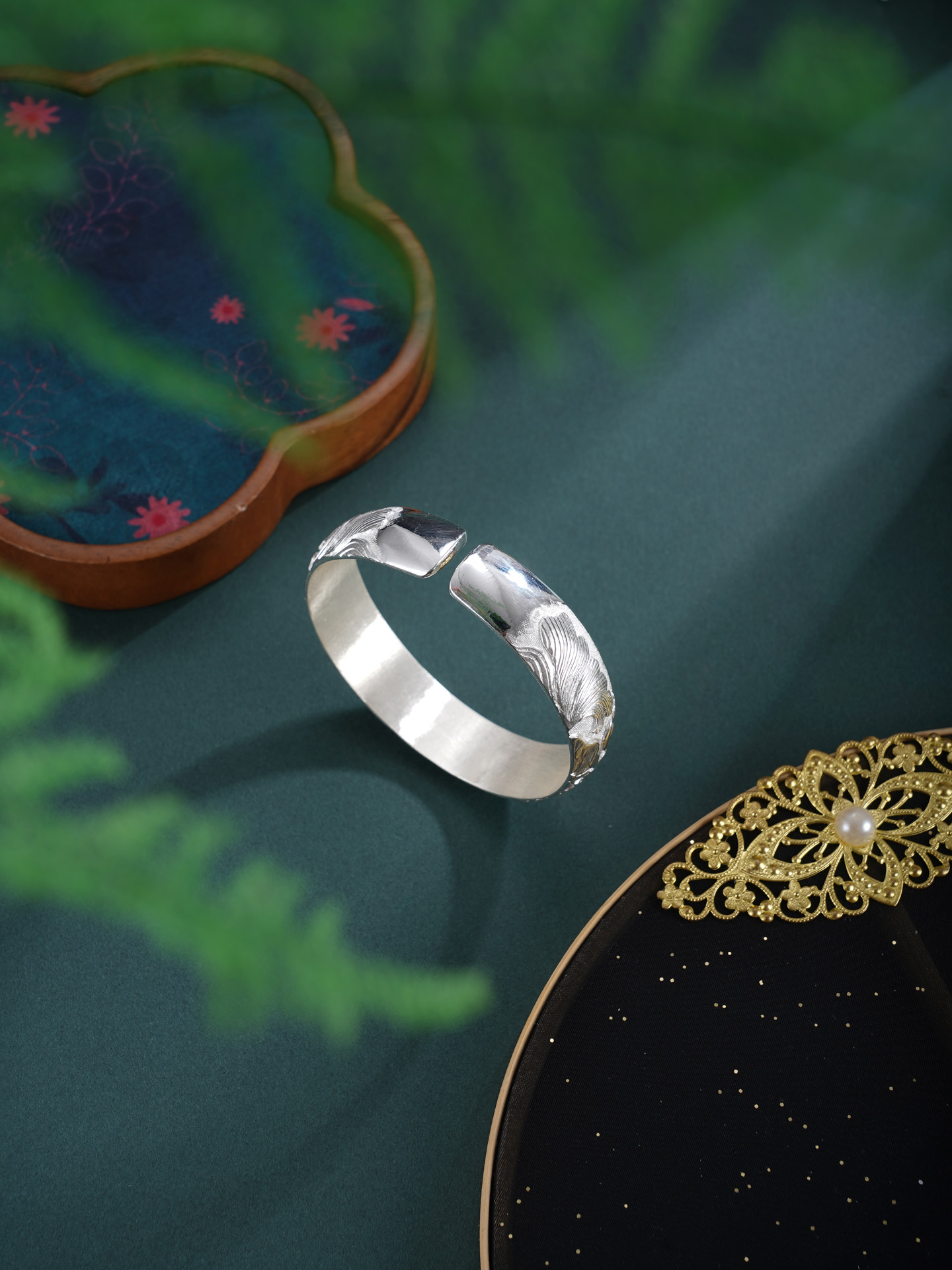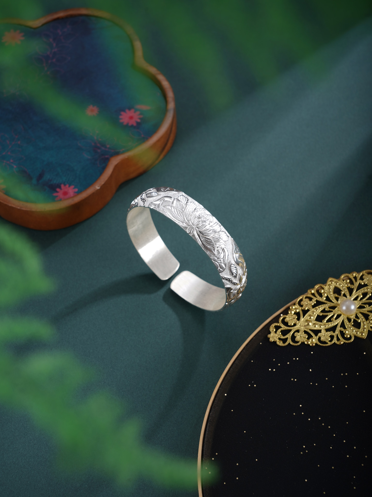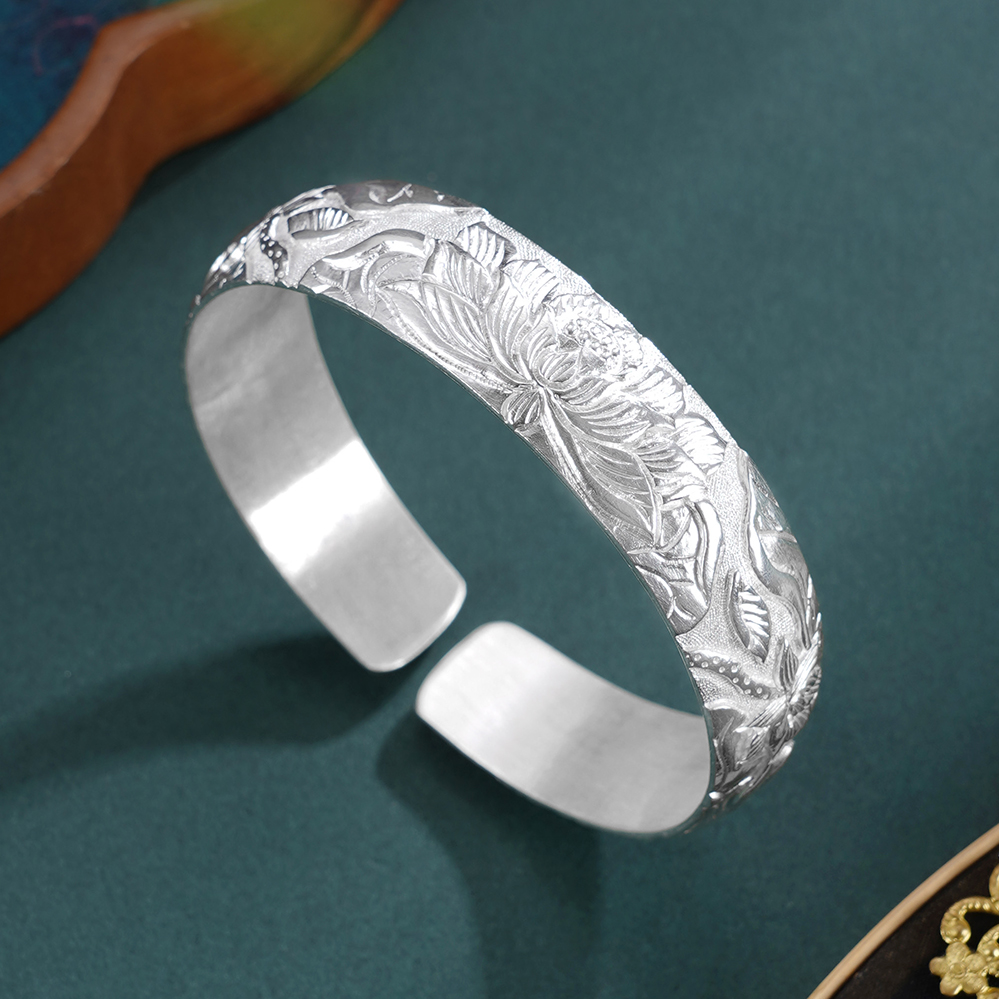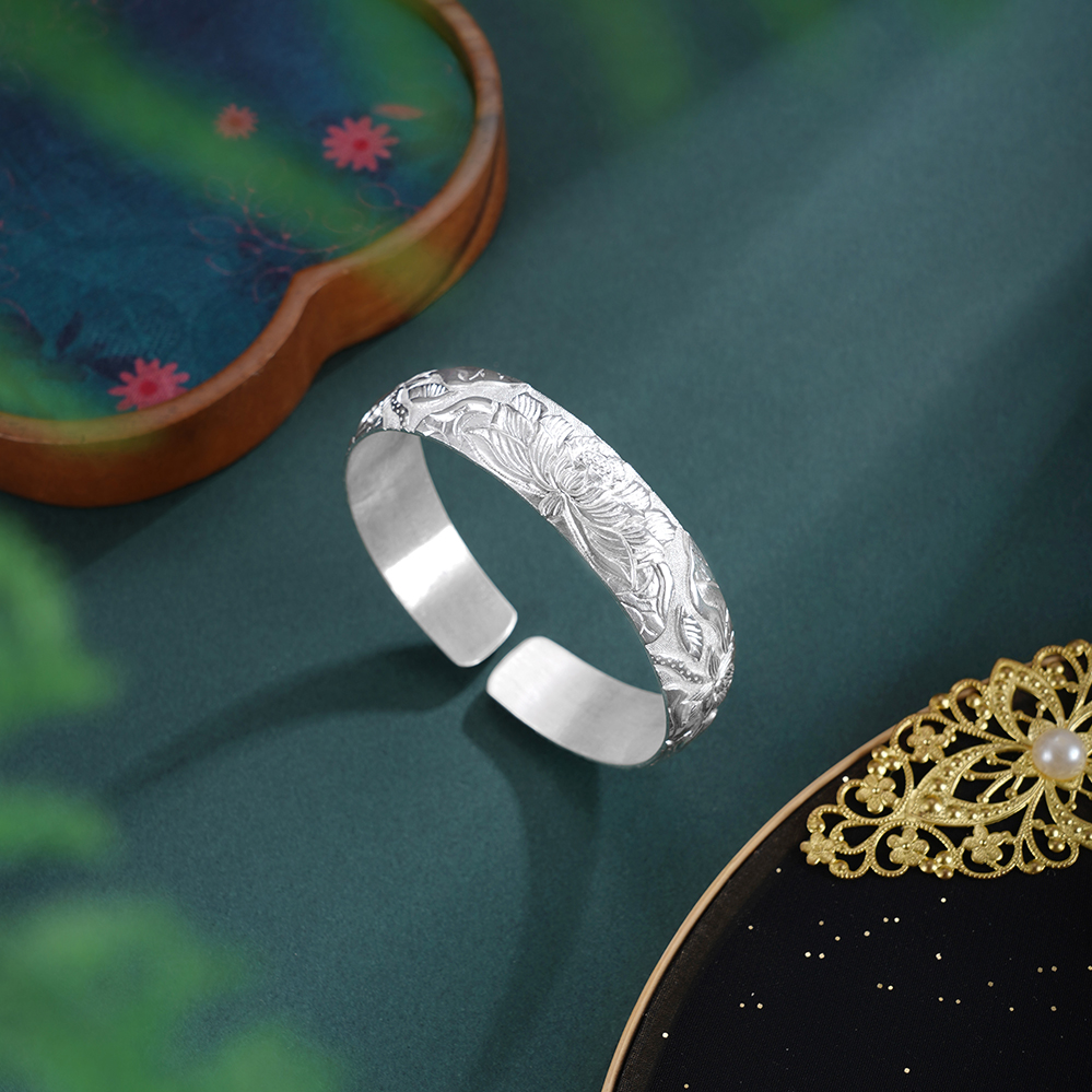 【寓意】:“水面清圆,一一风荷举”。手镯采纯银材质,将此诗意境化为莲花纹样,应用浮雕錾刻工艺,构筑灵动画境。寓意好运连连,清福无限。