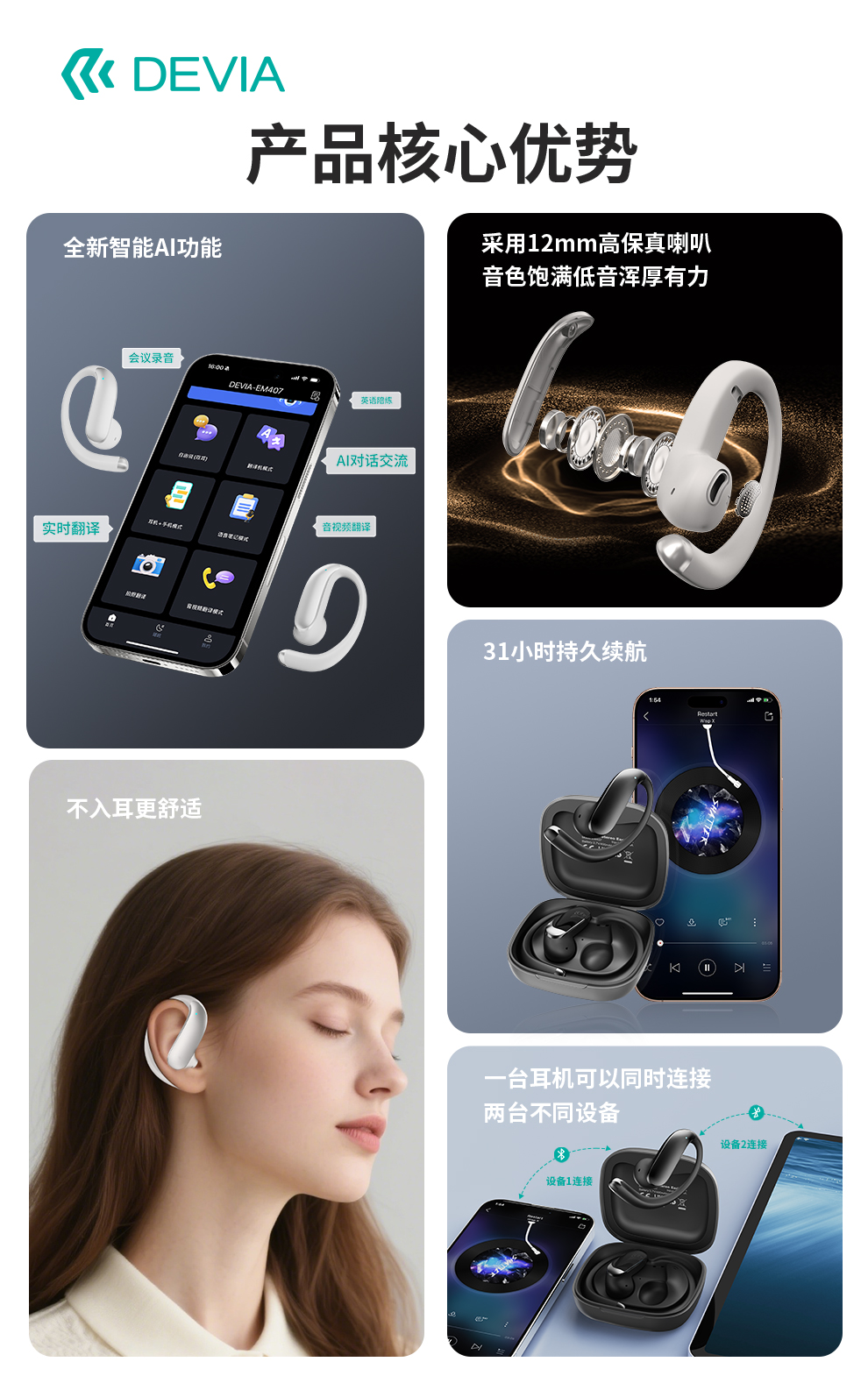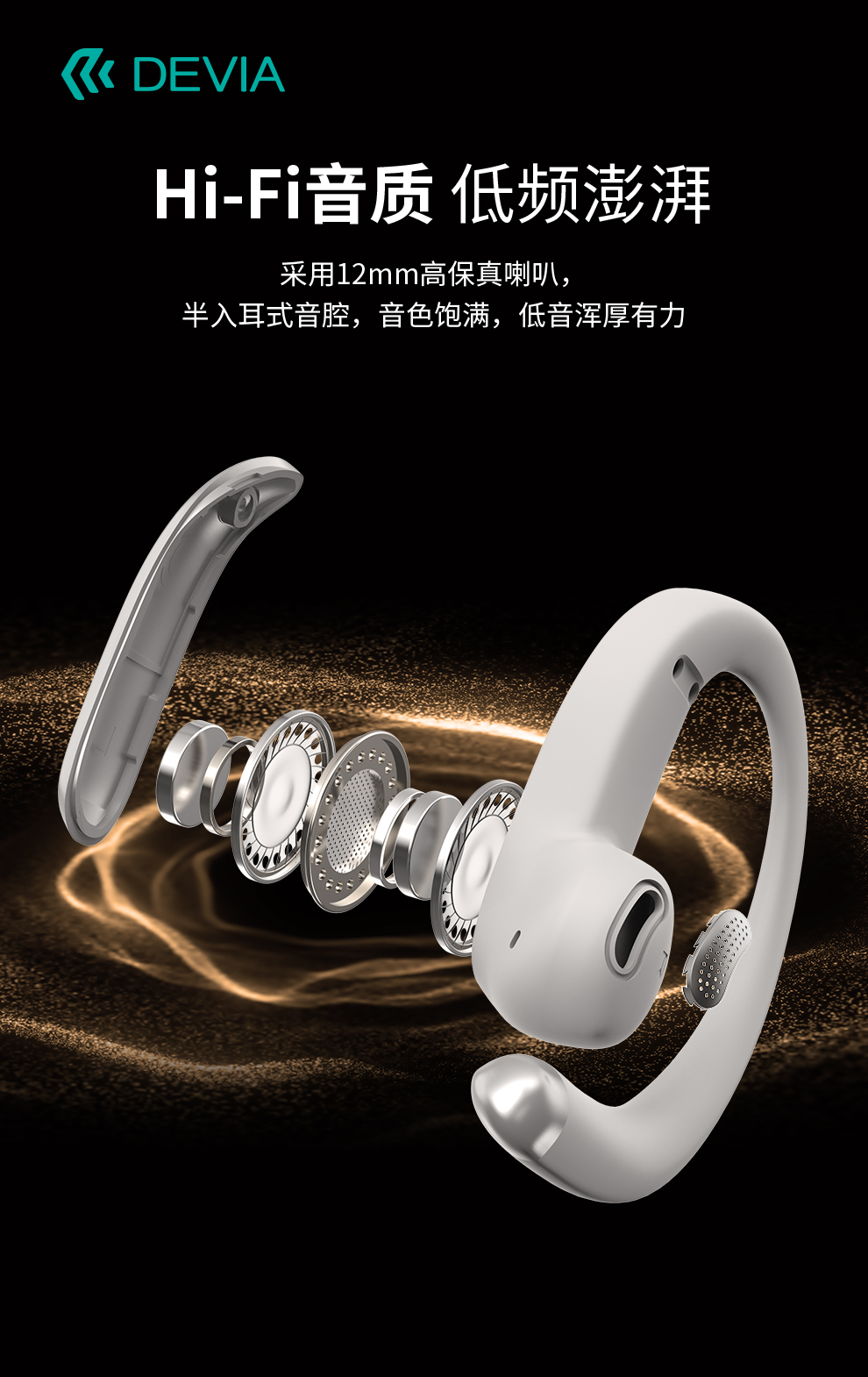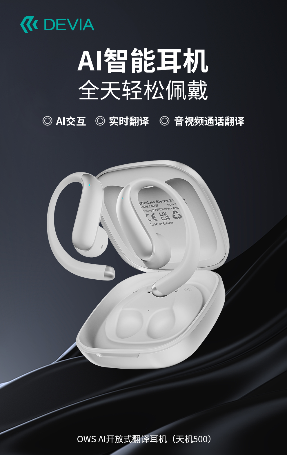 迪沃DEVIA蓝牙耳机OWS AI开放式翻译耳机天机500挂耳式无线长续航