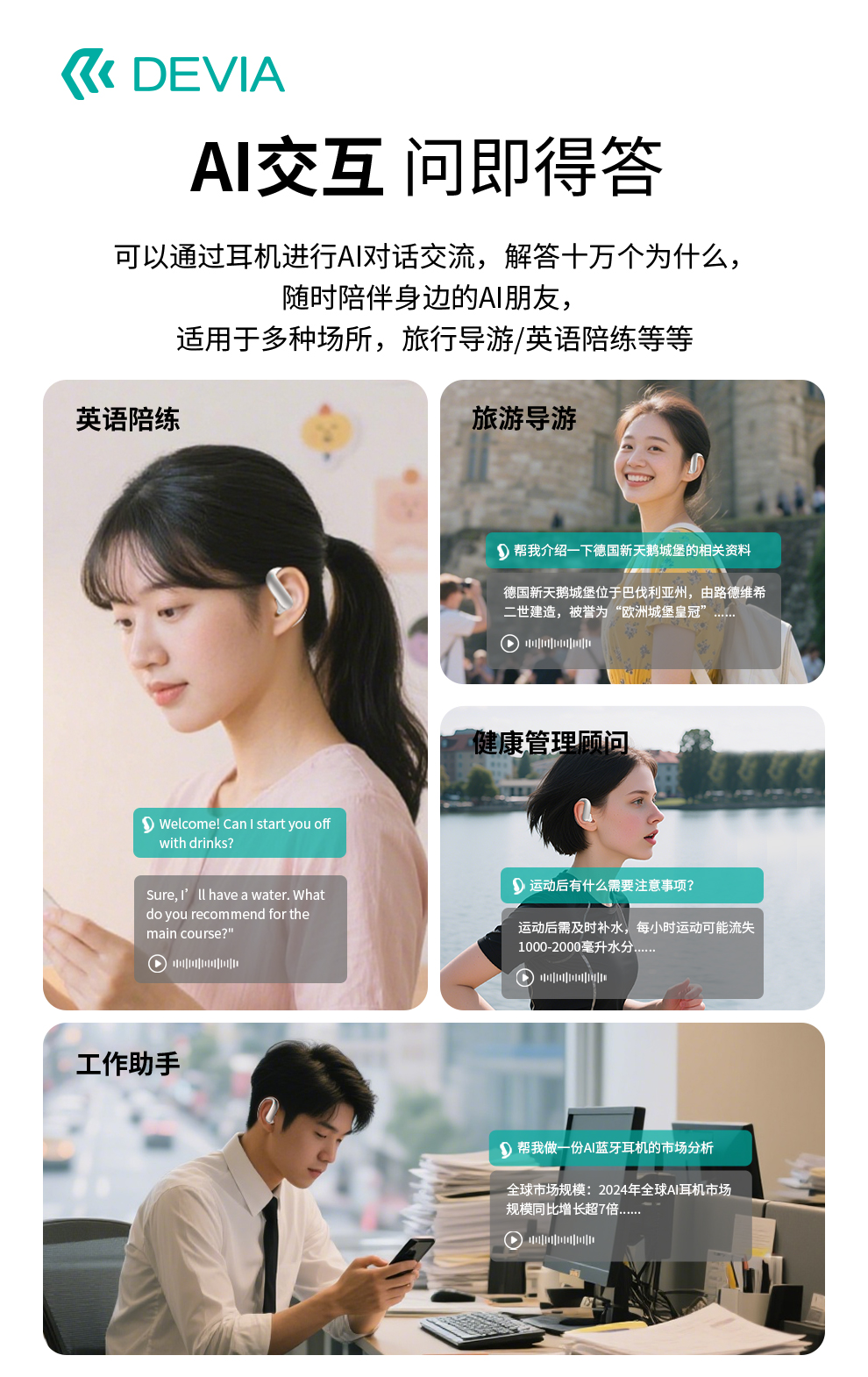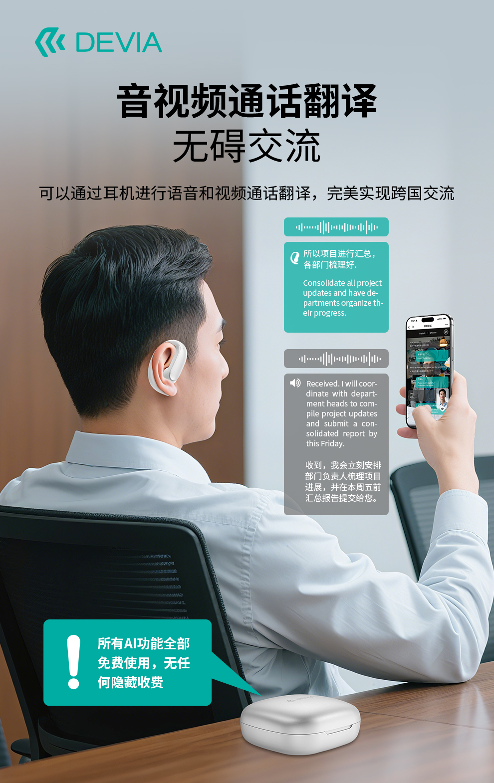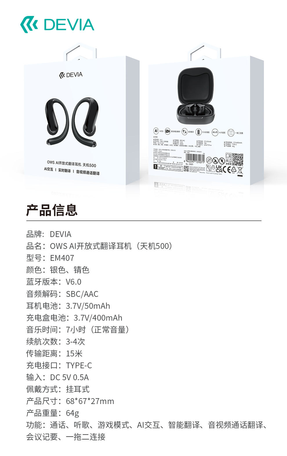 迪沃DEVIA蓝牙耳机OWS AI开放式翻译耳机天机500挂耳式无线长续航