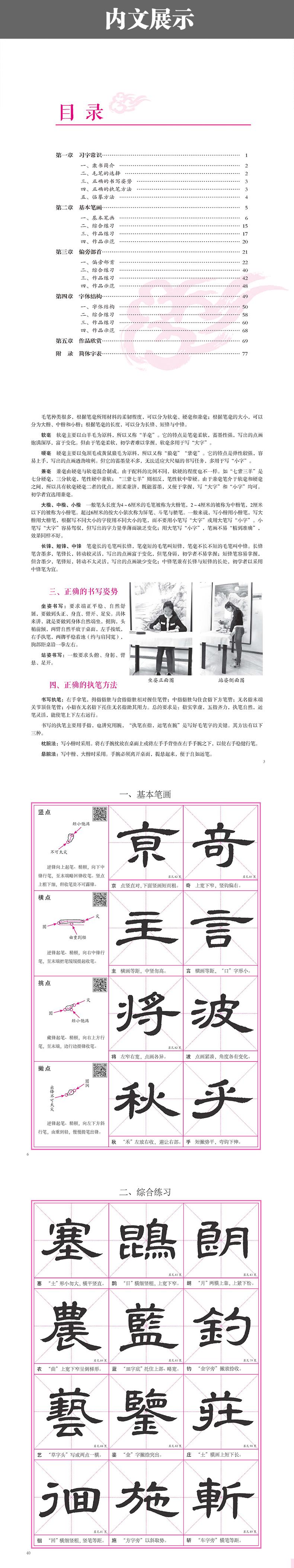 本书属成人书法爱好者及中小学生书法入门教程,为使广大书法爱好者可以更全面,系统地学习书法而编写。全内包括:书法基础知识、基本笔画、偏旁部首、间架结构、章法布局、创作欣赏。以范字为主,在范字中配画了毛笔运笔走势的轨迹,运用笔势图解的方法,使书法教学更为直观明了。范字中加以简单的图示,由浅入深、先易后难、循序渐进,便于老师教学与读者自学。为了能让初级书法爱好者更好地配合学好书法,作者加入了书写过程中的示范和精细讲解的视频,作为辅导学习的工具,让读者能够得到老师手把手的教学,起到事半功倍的学习效果。