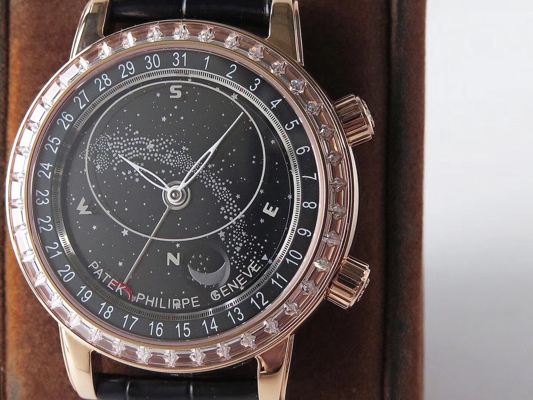 "贵族的标志"百达翡丽 (Patek Philippe) Sky Moon 手表内藏天空全景,将北半球最耀眼的星空,以独特的三层表盘以不同的速度转动,精确显示出星体及月亮在夜空中运转的穹苍全景。星象图由三块不同的圆盘共同组成:两块圆盘分别显示星空背景和月相,另有一块透明水晶圆盘显示星象图和银河 。盘面上时分针采用柳叶形镂空设计,蓝盘配银灰色指针;黑盘配乳白色指针。中心采用原装一致的实心抛光中轴,独家工艺。透明表底可尽览240 LU CL C型珍珠陀机芯风貌,这枚机芯直径38毫米,厚度6.81毫米,共含315个零件,12个夹板,45颗宝石,振频28800次/小时,最大动力存储可达48小时,并配备22K金偏心迷你摆陀。 快拆表带是手工缝制的亮色方形鳞纹表带搭折叠式表扣 。2点位把头调透明星象表盘可同时读取月相时间,透明星象表盘一个月转一圈,4点位把头调星空表盘,圆○窗显示月相,6点位表壳同原装一样包嵌一颗钻石永不掉钻!