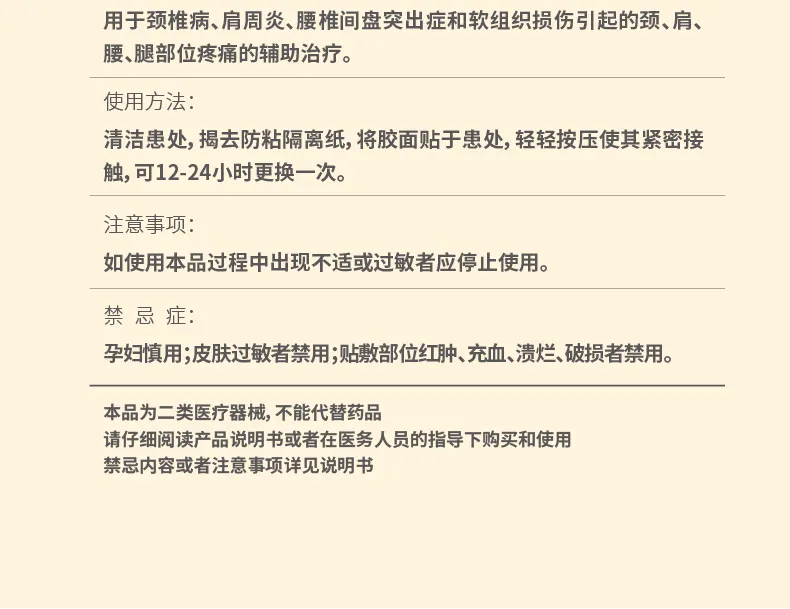 【使用方法】清洁患处,揭去防粘隔离纸,将胶面贴于患处,轻轻按压使其紧密接触,可12-24小时更换一次。