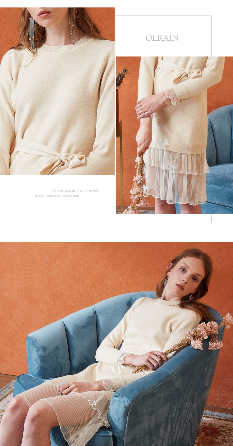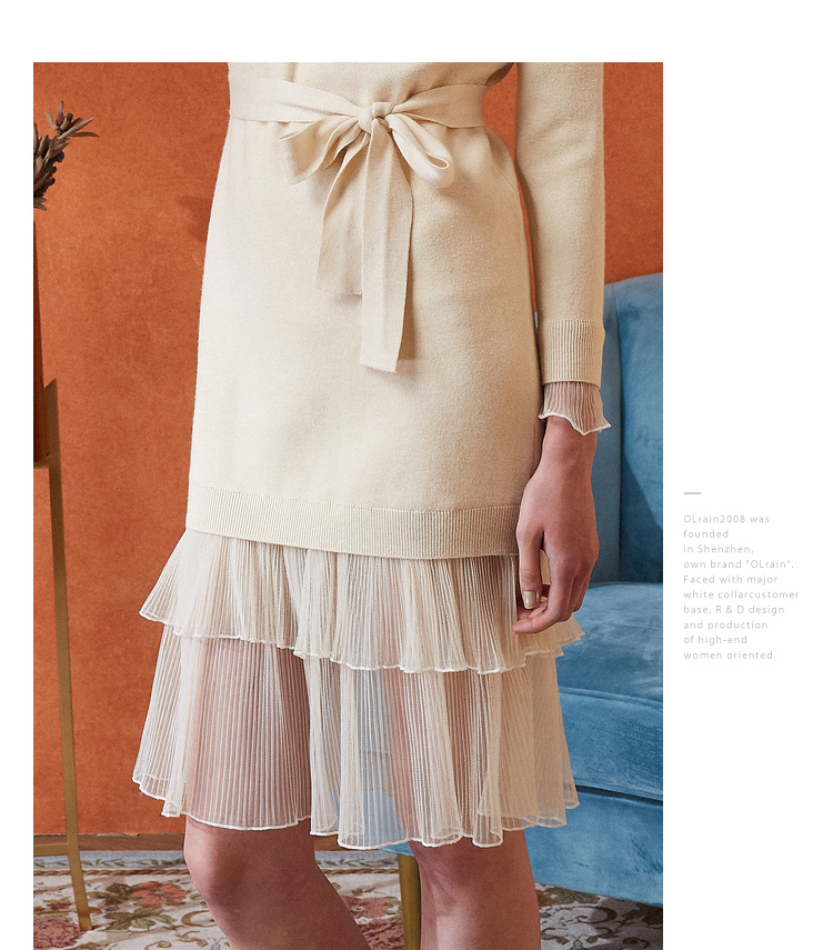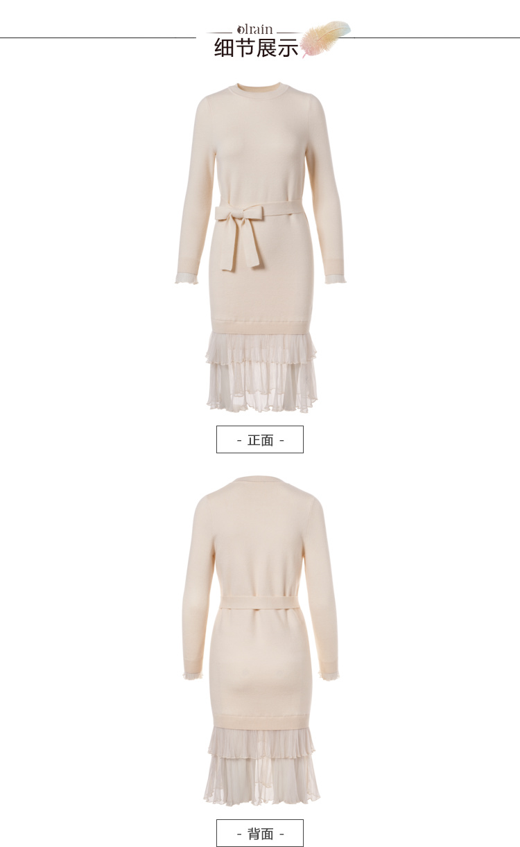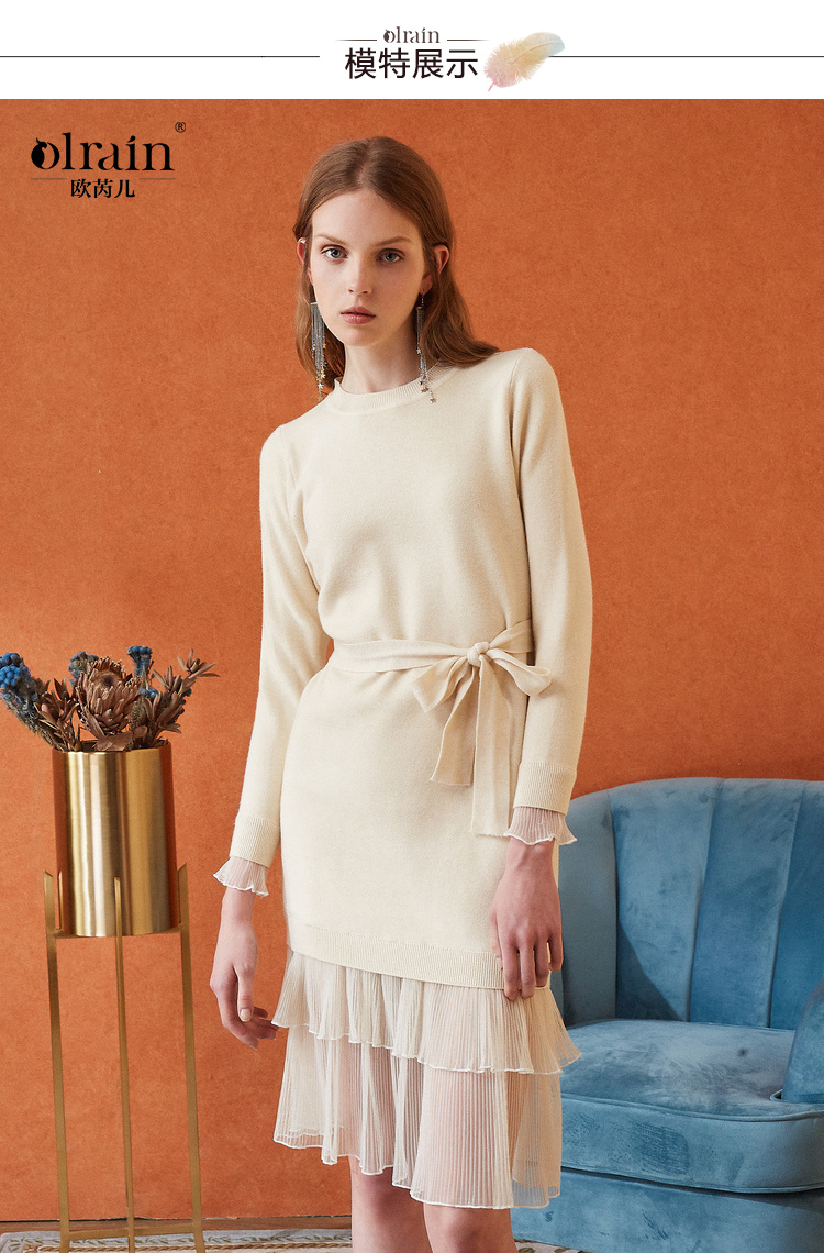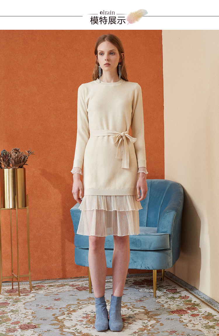 欧芮儿女秋装2018拼接荷叶边收腰毛衣针织连衣裙女中长