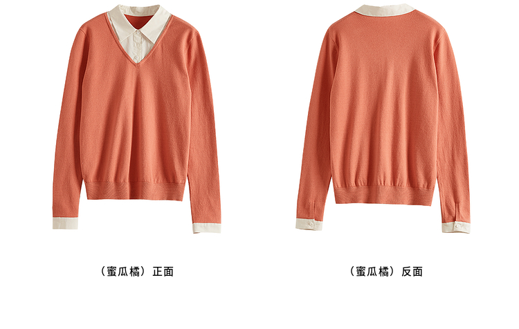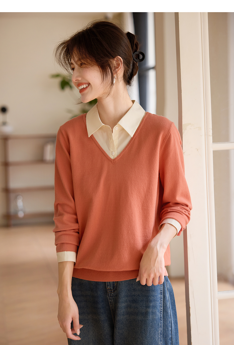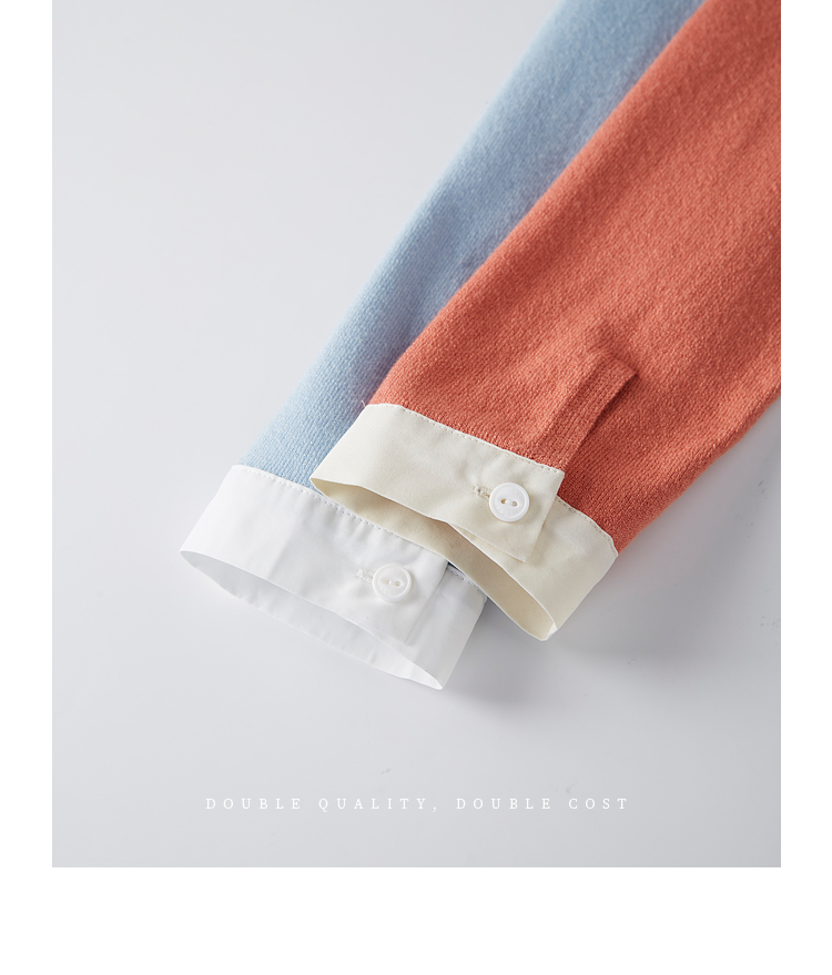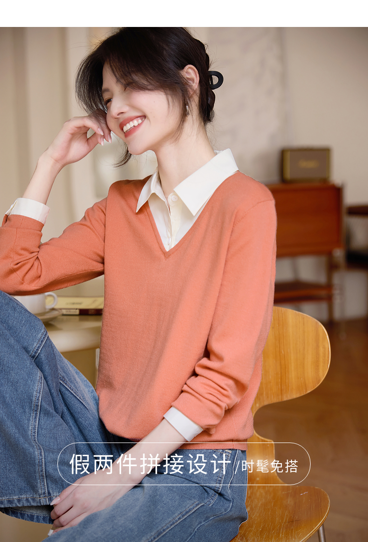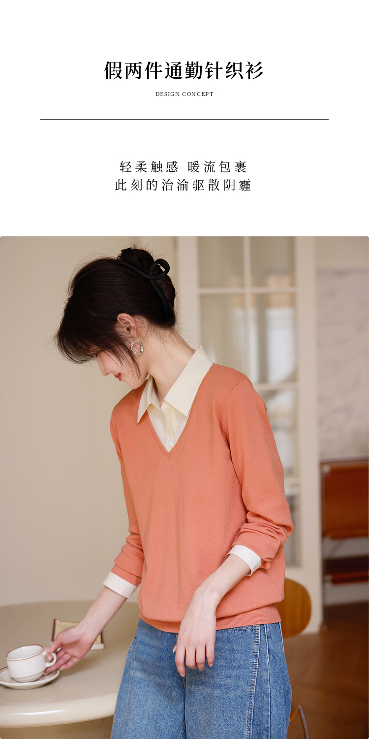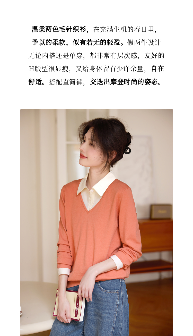 【春夏新品】熙世界衬衫领假两件针织衫女春秋2025新款通勤休闲长袖polo领上衣