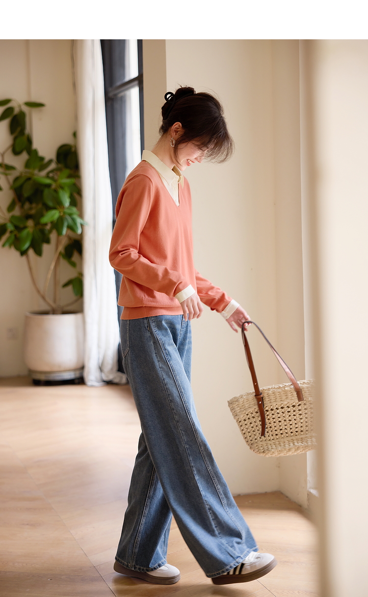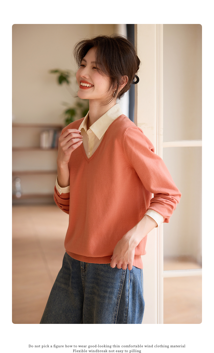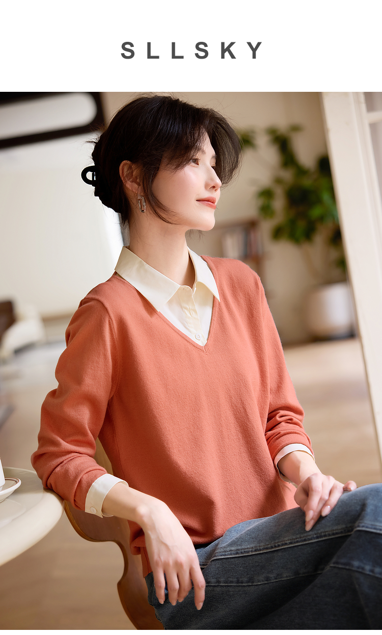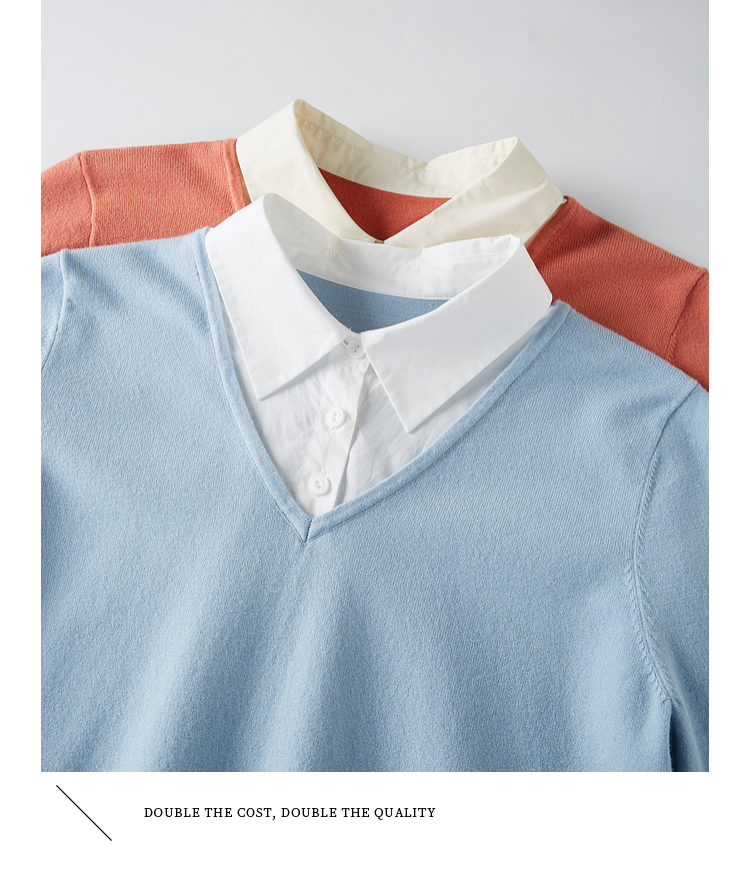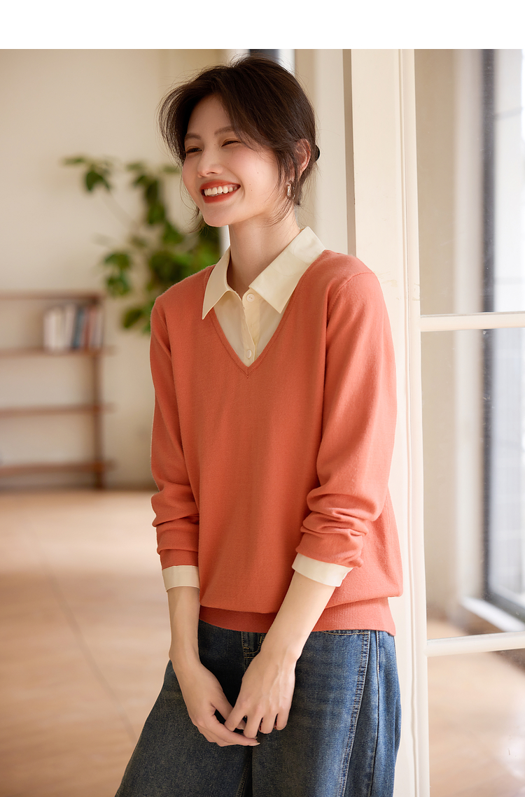 【春夏新品】熙世界衬衫领假两件针织衫女春秋2025新款通勤休闲长袖polo领上衣