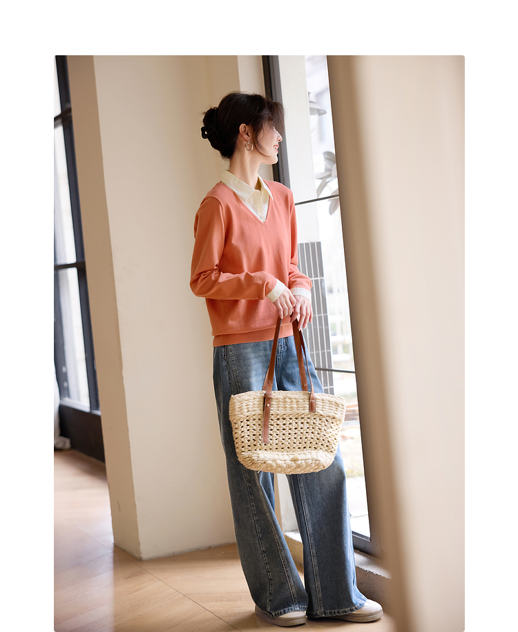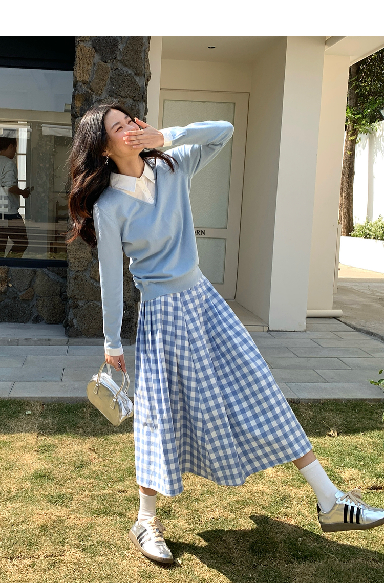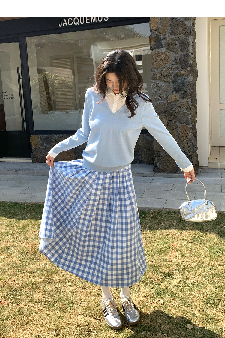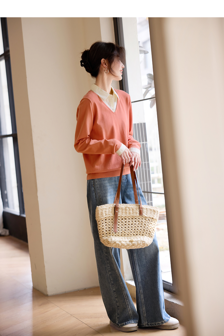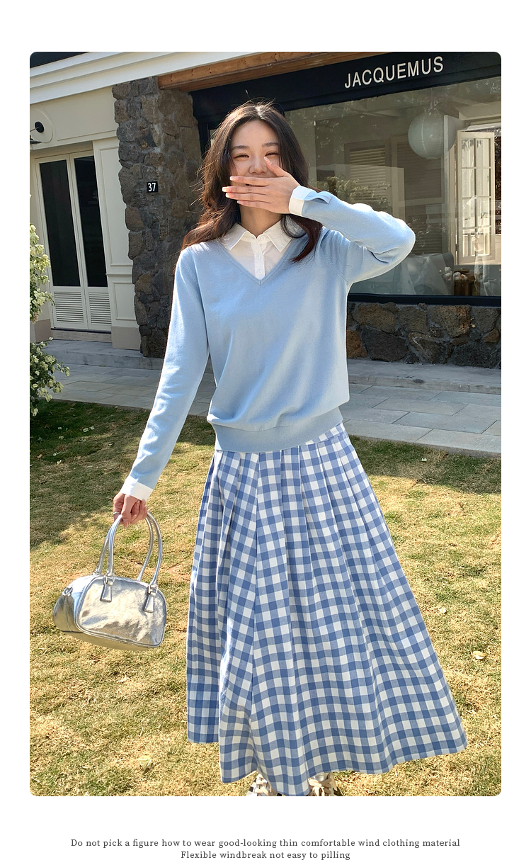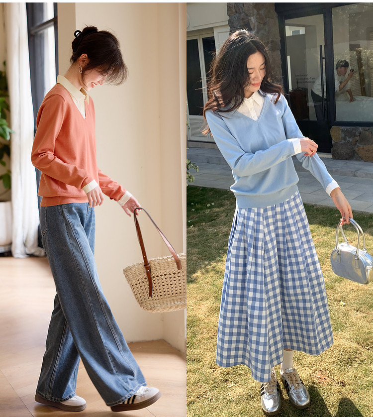 【春夏新品】熙世界衬衫领假两件针织衫女春秋2025新款通勤休闲长袖polo领上衣