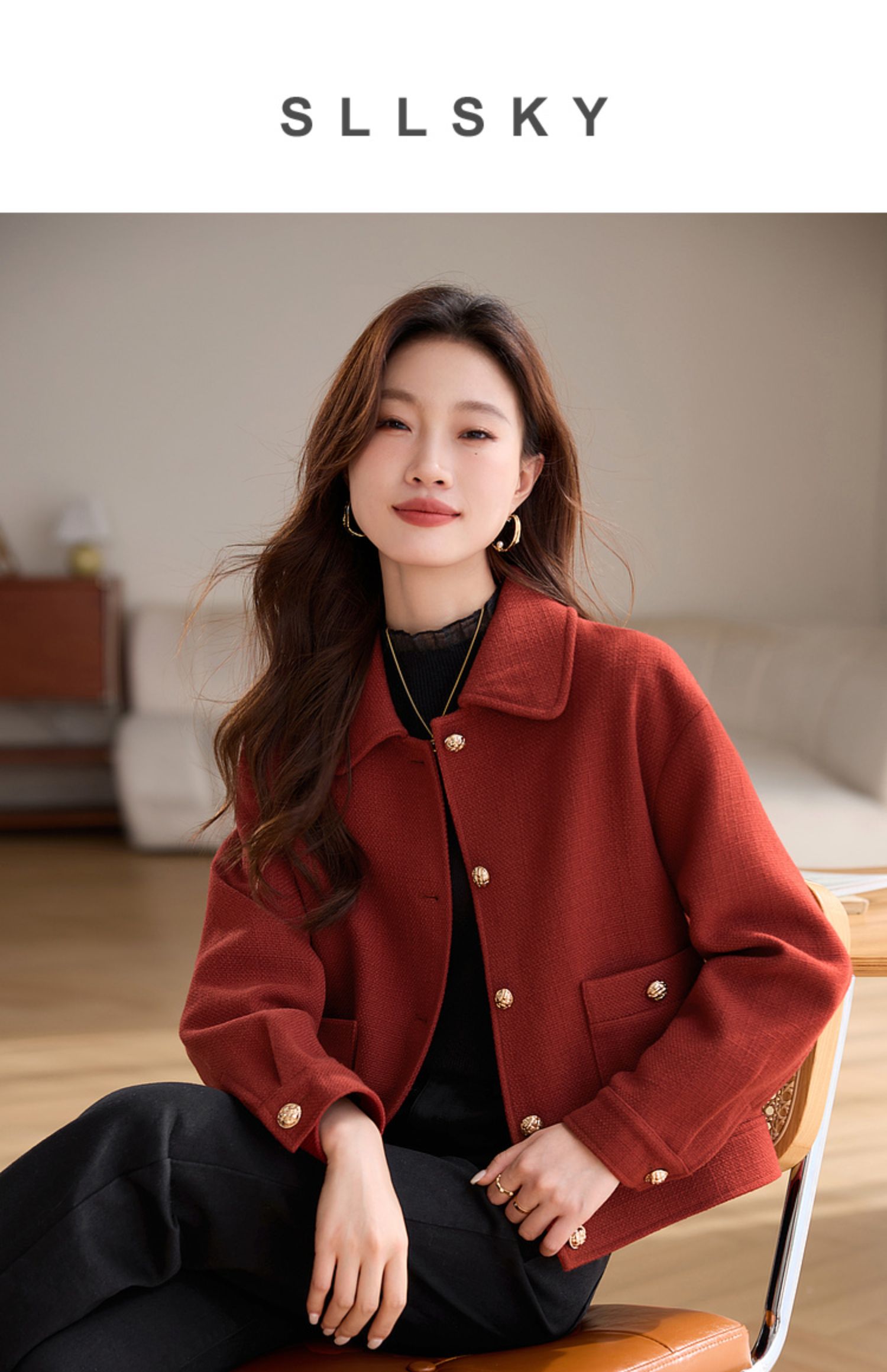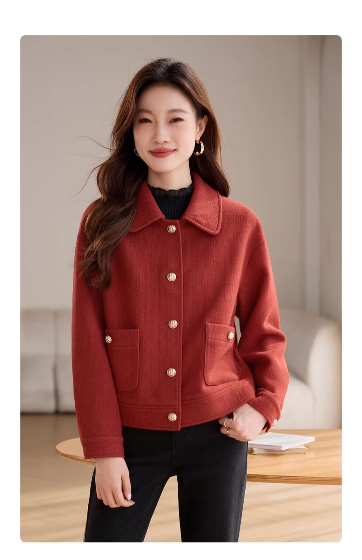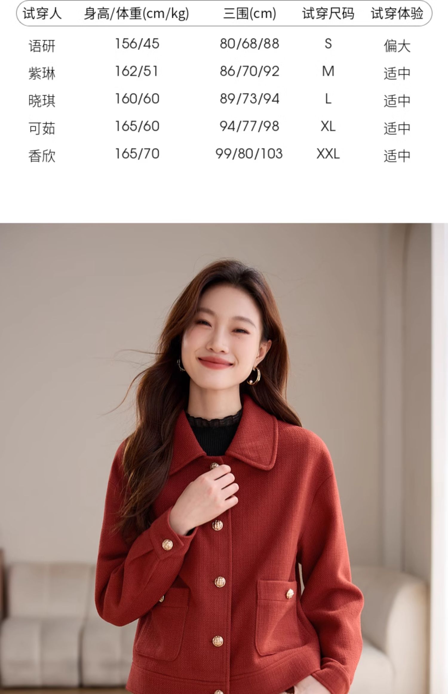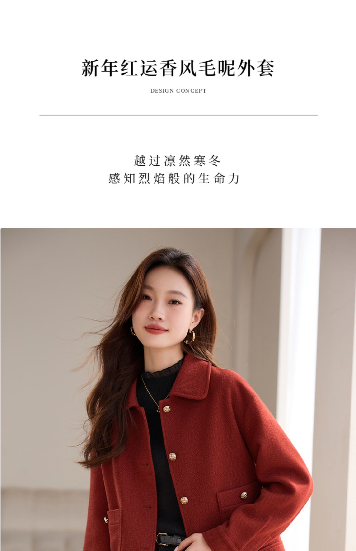 【年货节】熙世界复古红色小香风毛呢外套女秋冬法式气质粗花呢夹克短款上衣