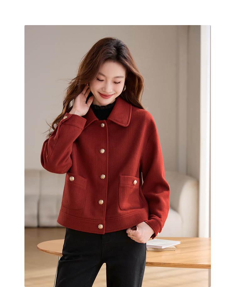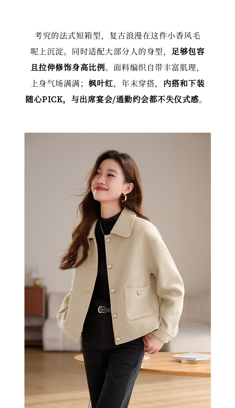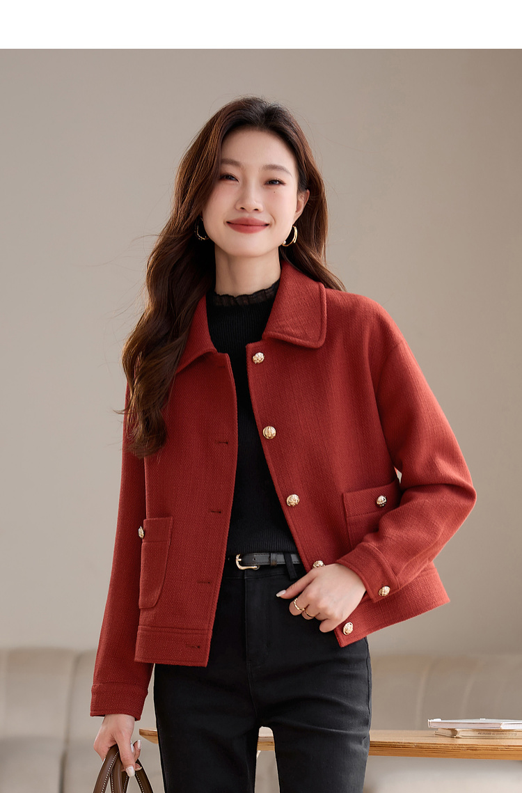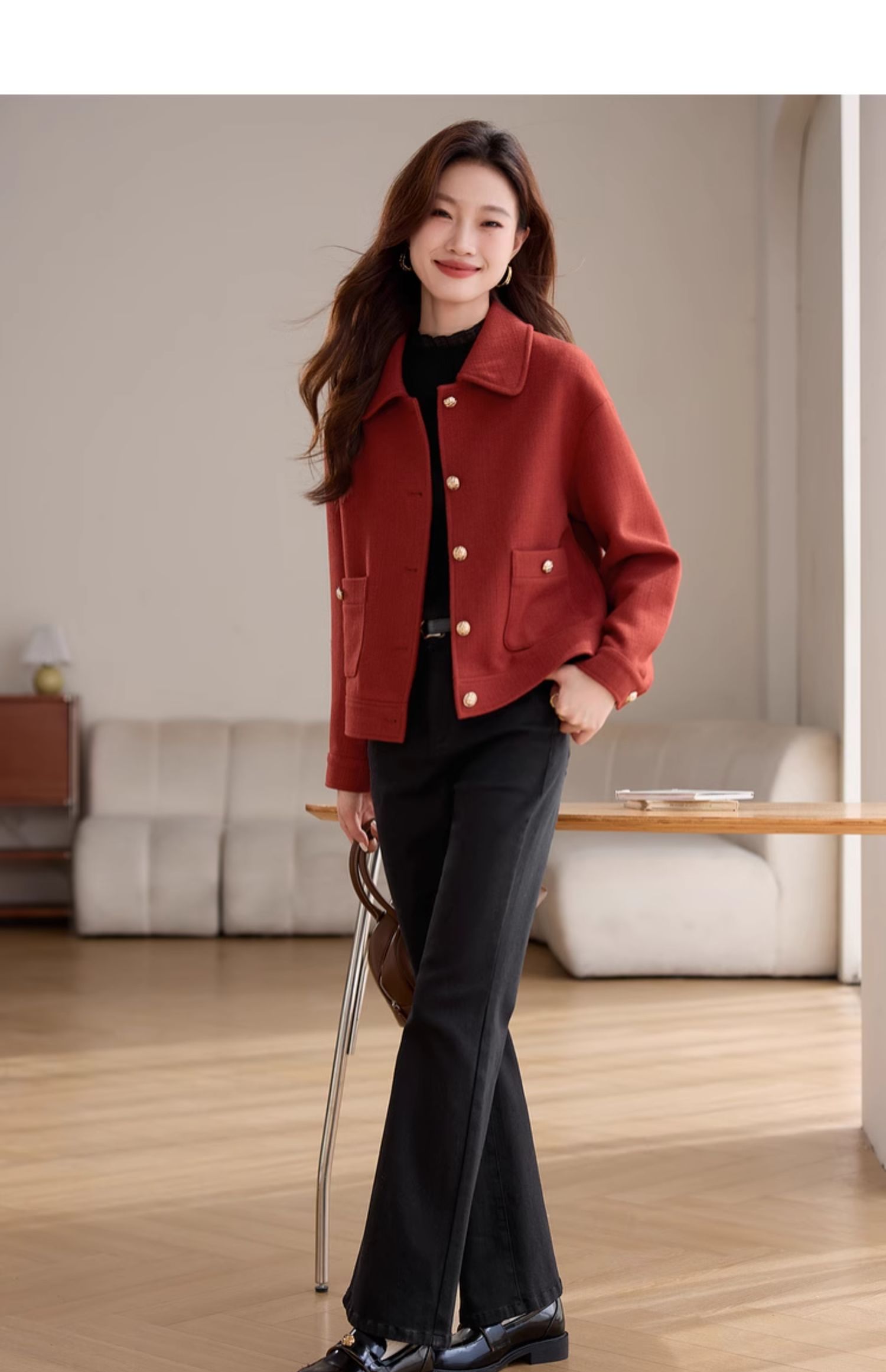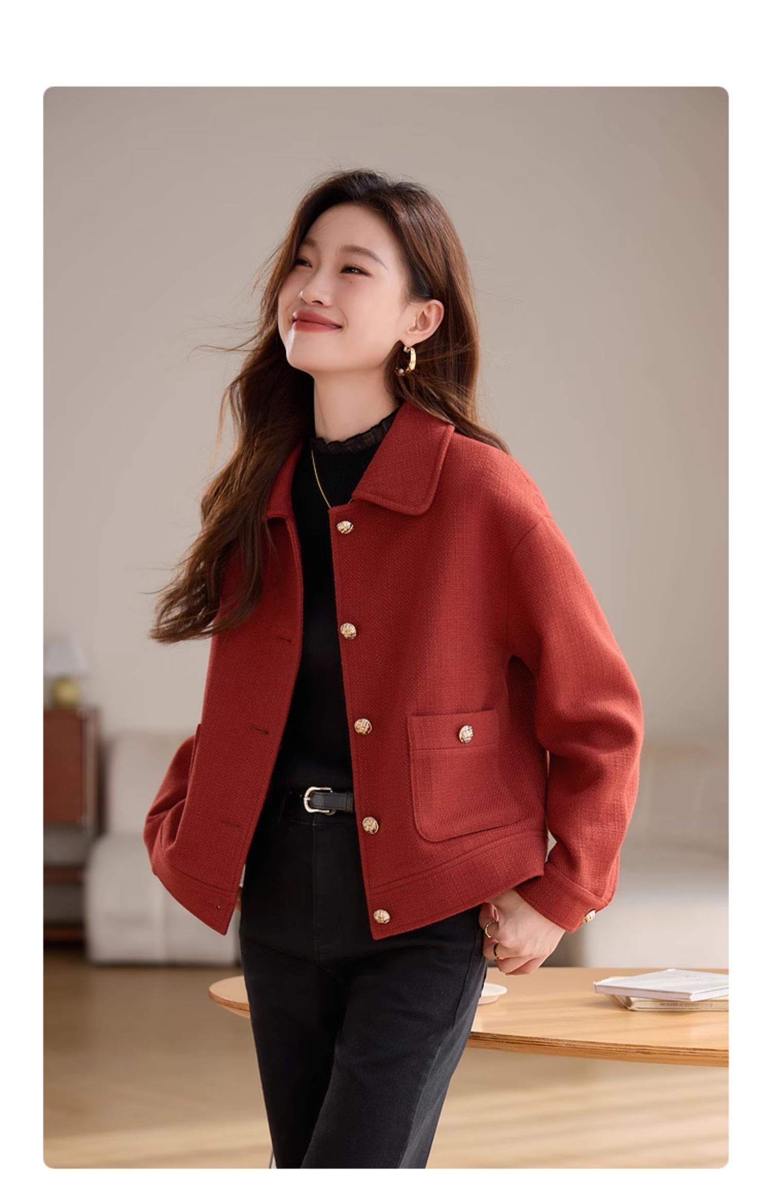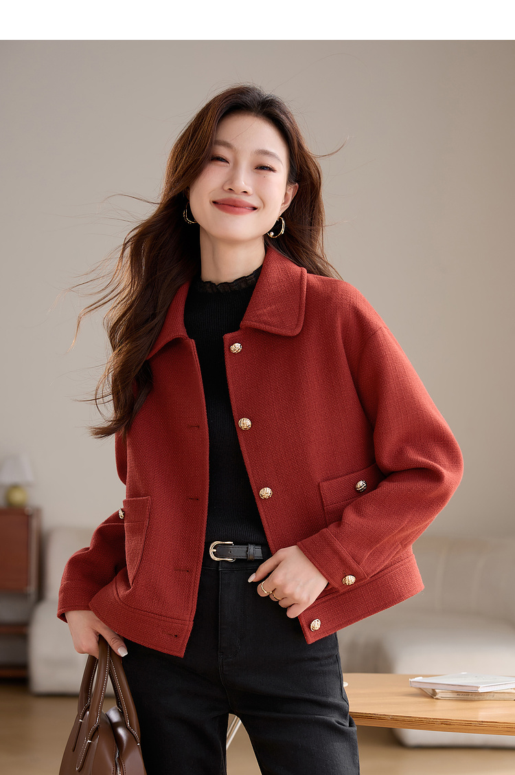 【年货节】熙世界复古红色小香风毛呢外套女秋冬法式气质粗花呢夹克短款上衣