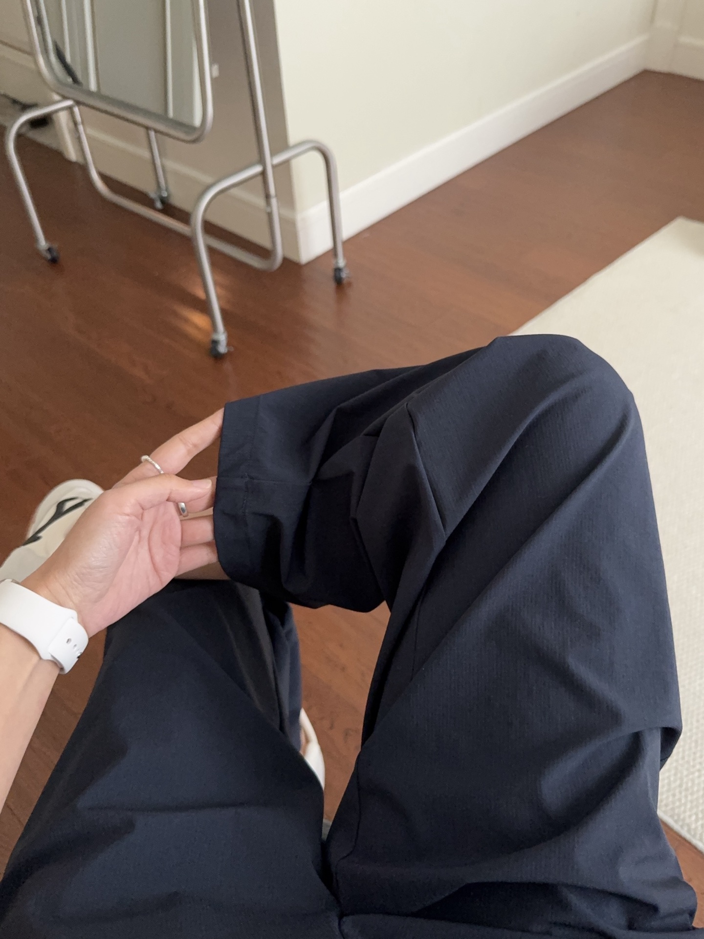 久穿不易皱、不鼓包、不起球,耐穿耐磨,还无静电不粘腿;藏青色还特别不易粘毛