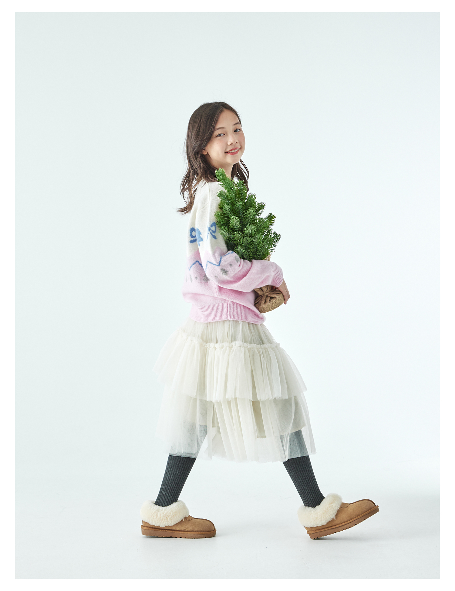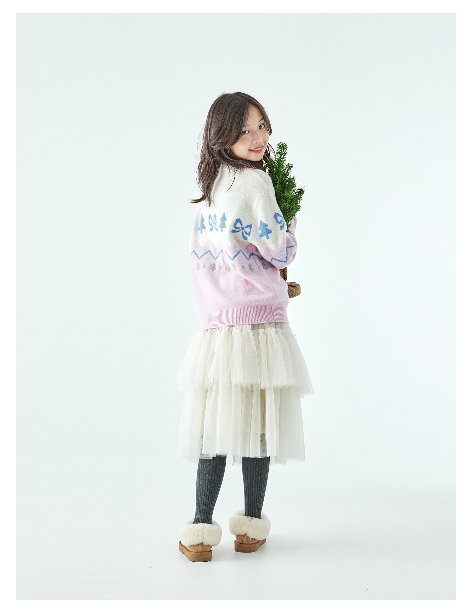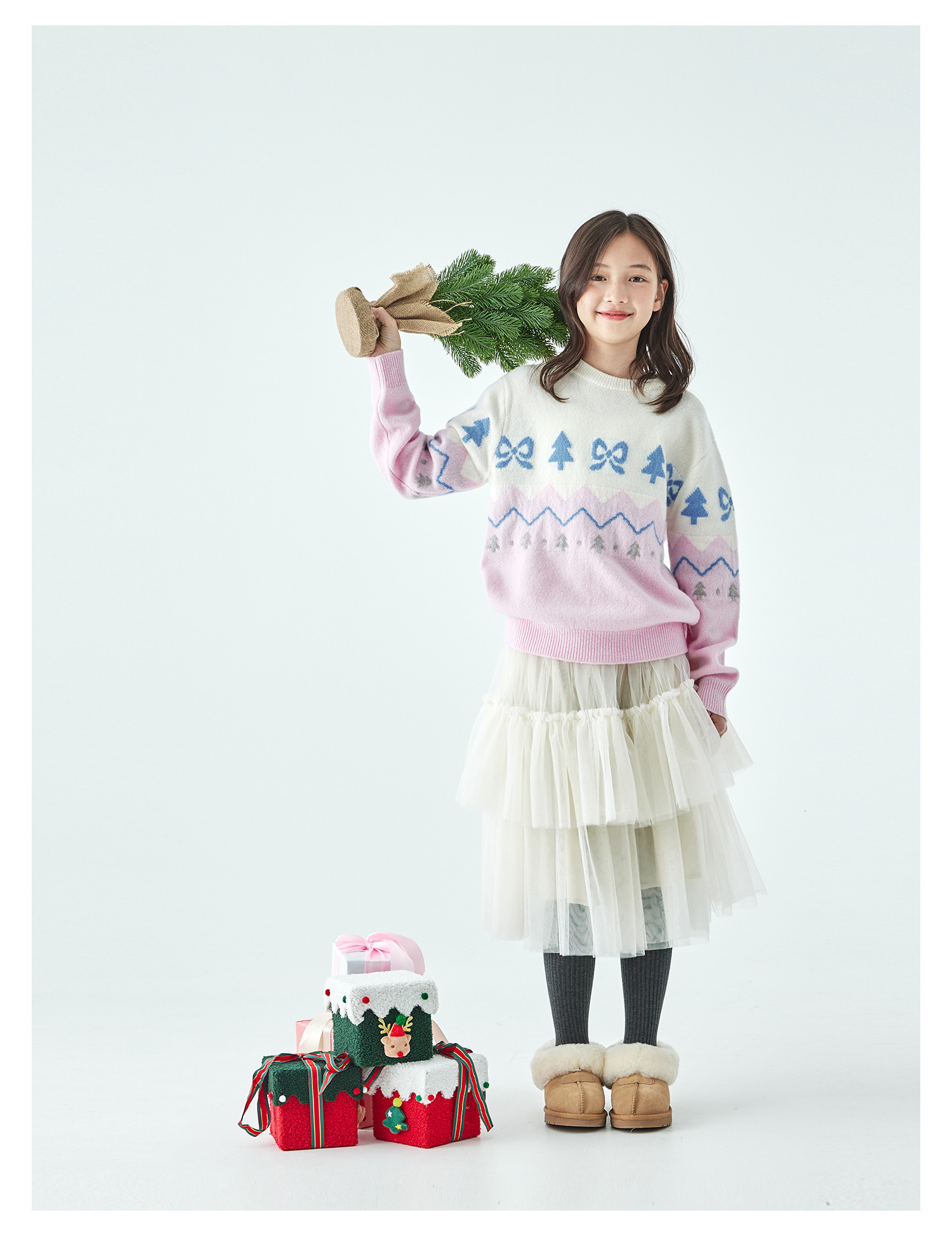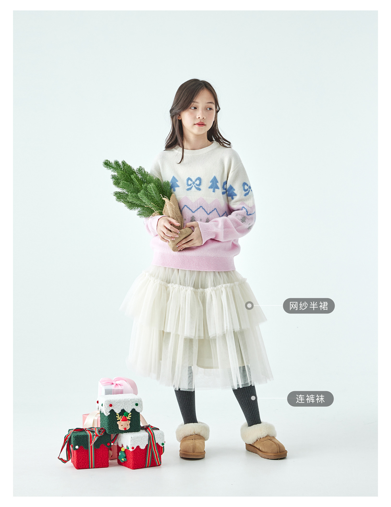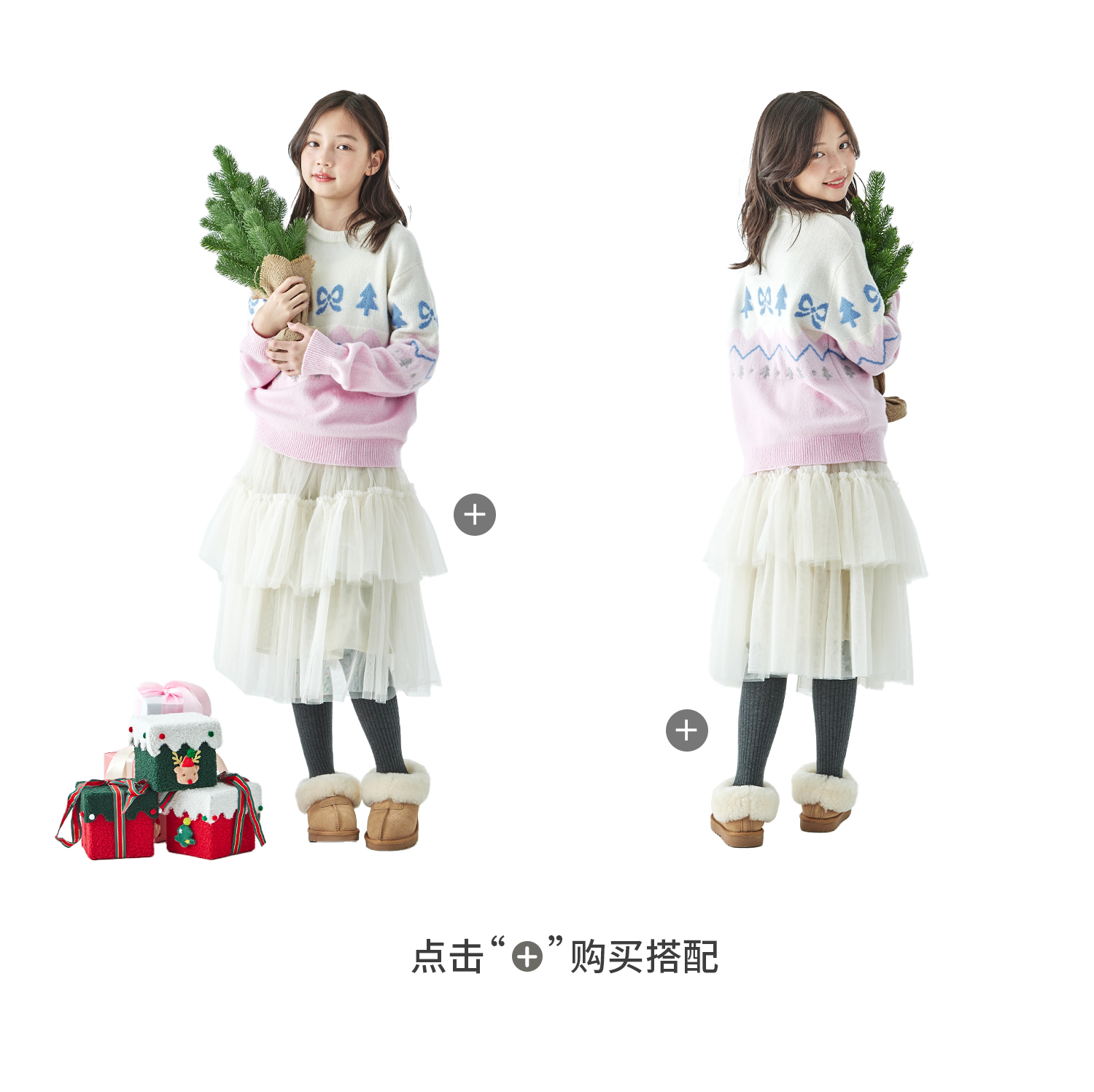 棵初2025年冬季新款亲子中大女童费尔岛几何花纹毛衣纯绵羊毛上衣