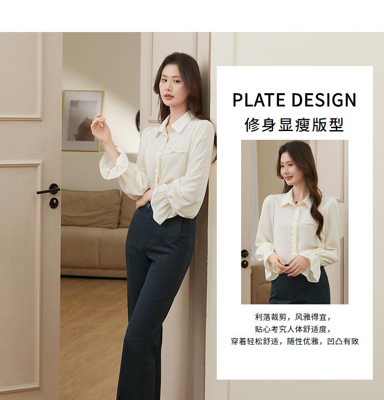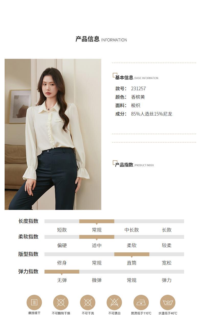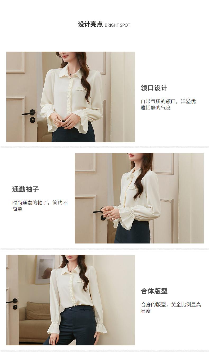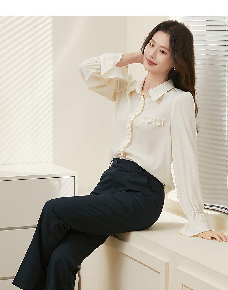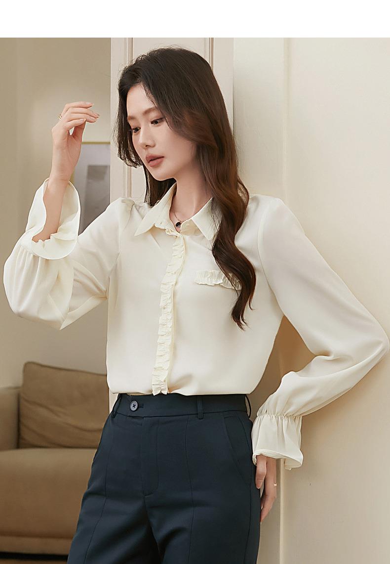 百姿 简约翻领喇叭袖衬衫2023秋季新款百搭甜美长袖雪纺衫231257