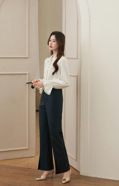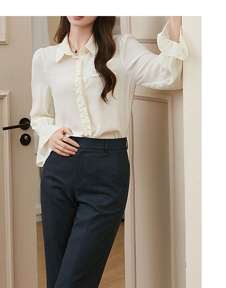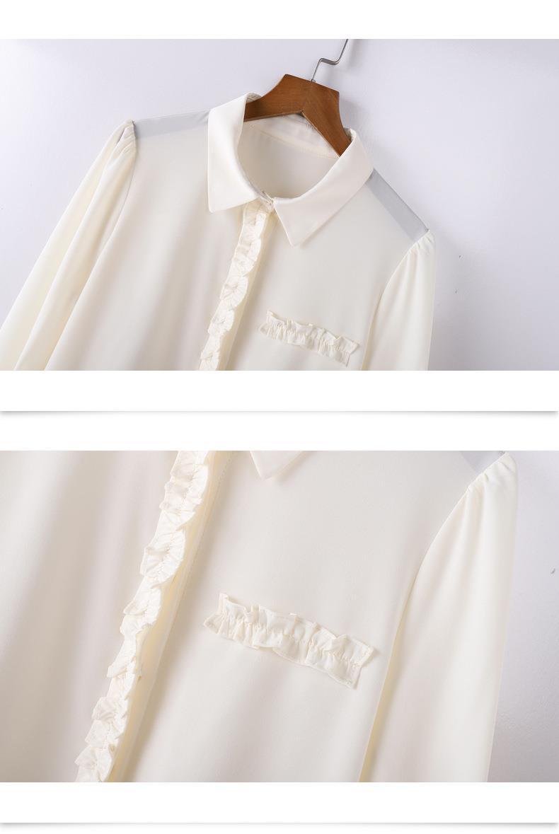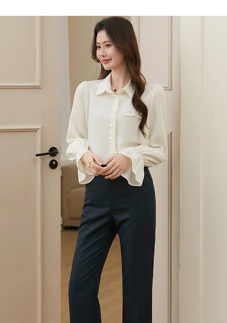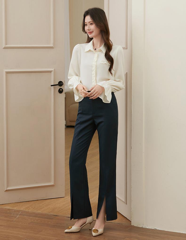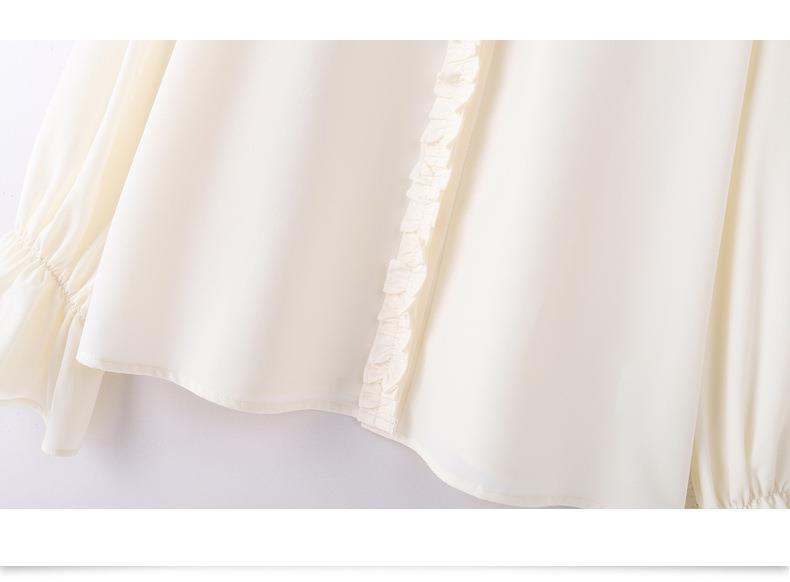 百姿 简约翻领喇叭袖衬衫2023秋季新款百搭甜美长袖雪纺衫231257