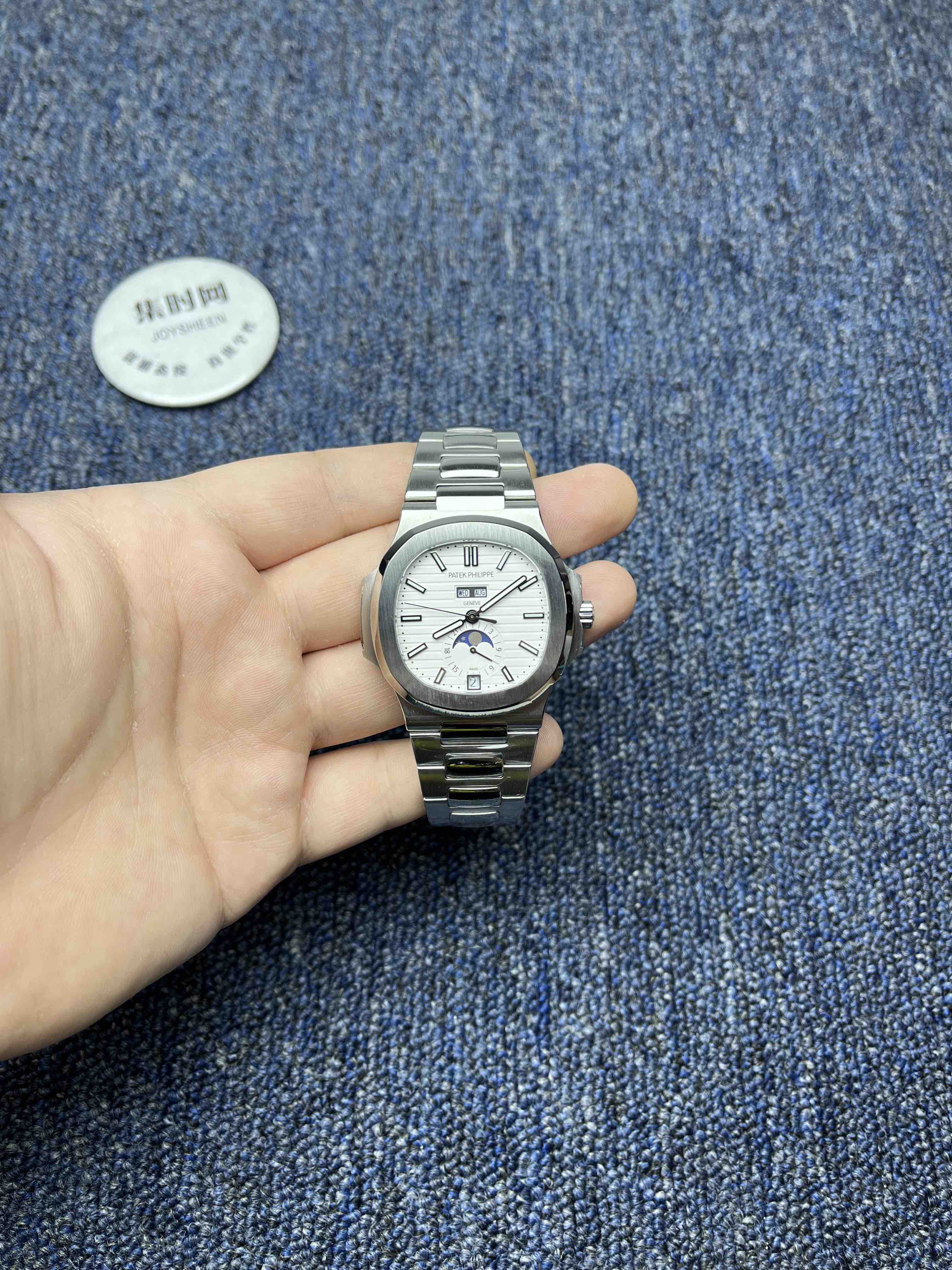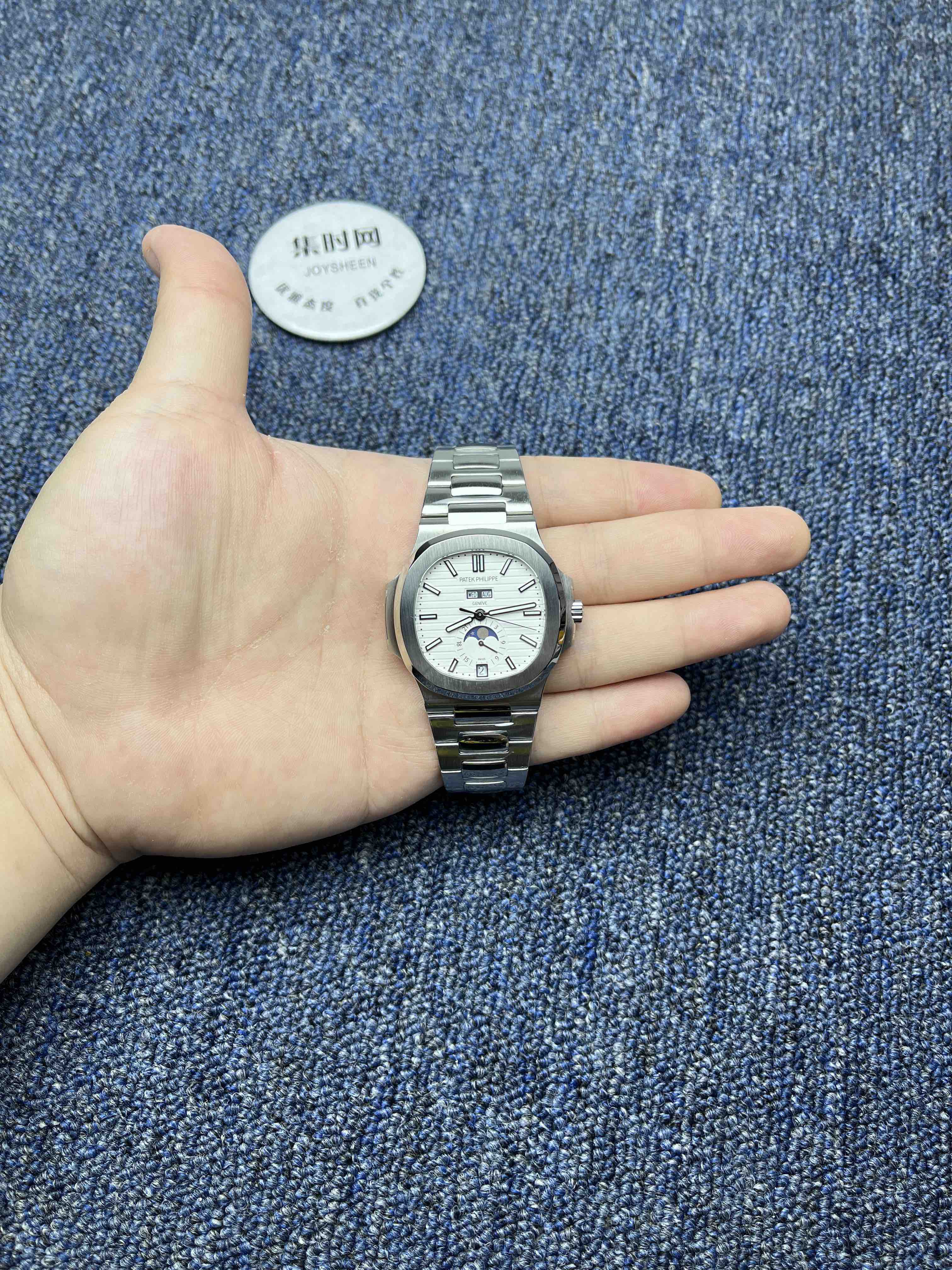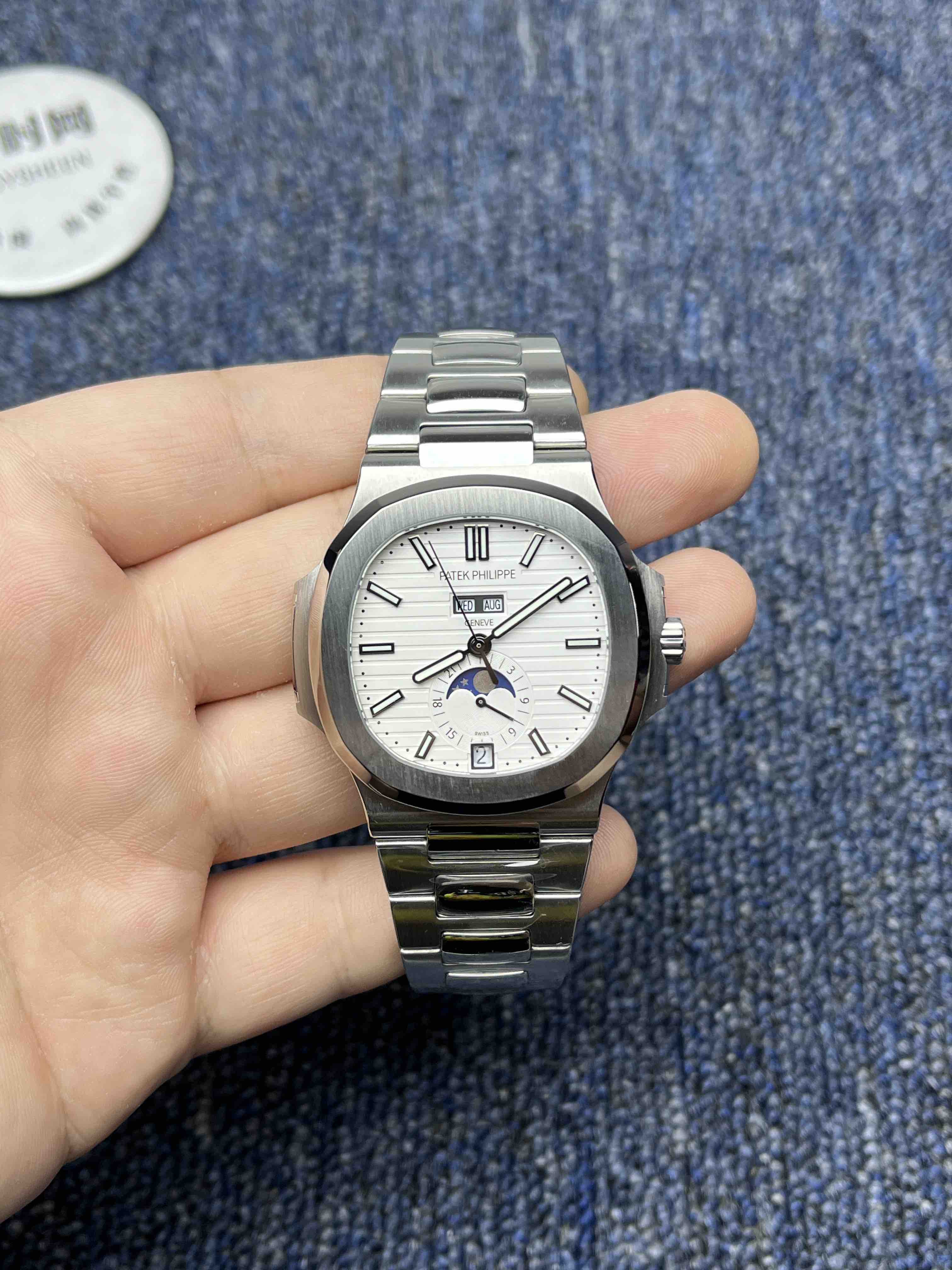 百达翡丽 Nautilus鹦鹉螺5726系列 男士腕表 正式上位 全系列一贯设计的旋窗造型表壳,与正品工艺一致的采用锻纹修饰和抛光工艺处理构成鲜明对比,1:1还原了正品每个细节。盘面深邃并装饰有水平横纹浮雕图案颜色从中央向四周扩散,星期月份双视窗和日期窗黑字白底辨识度高,24小时显示盘附带月相十分高雅,整体给人的感觉是优雅,背面蓝宝石镜面,搭载改Cal.324S QA LU 24H/303全自动一体机械机芯,金陀让上链效率更高,红宝石轴承日内瓦纹下方的鱼鳞纹精致无比,机芯打磨依旧是业内标杆级别。