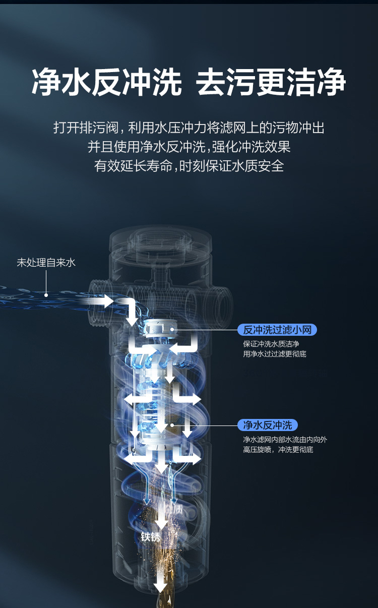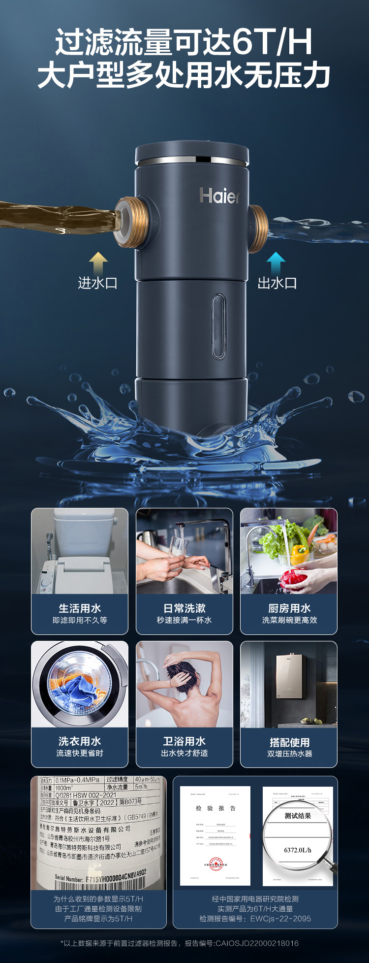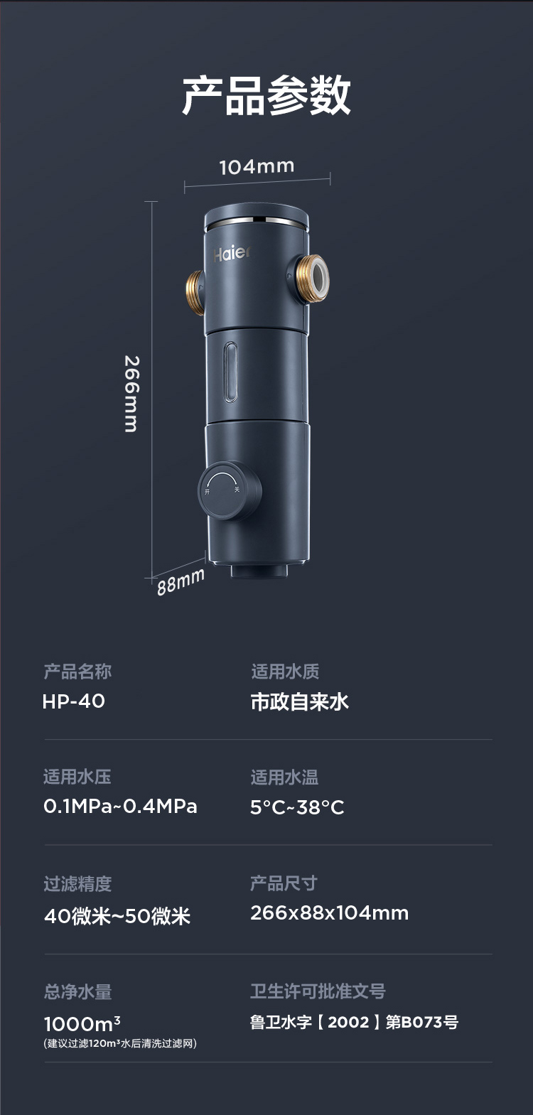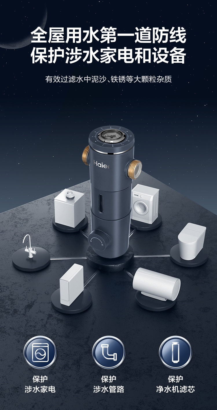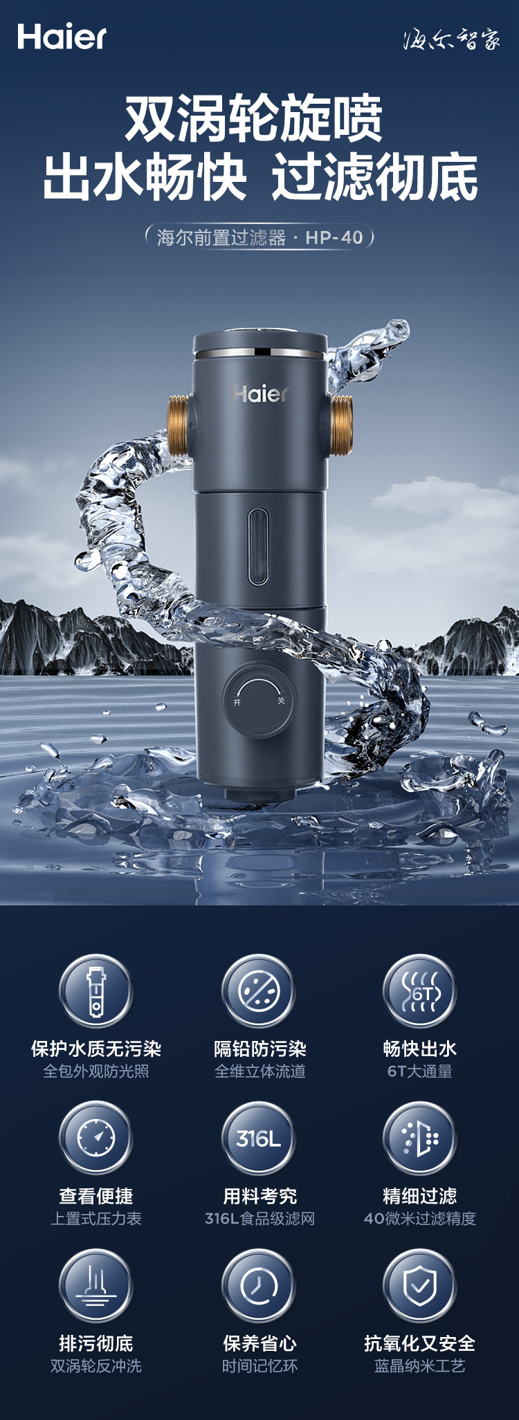 海尔(510530)(Haier)前置过滤器6T大通量家用商用自来水净水器全屋智能反冲洗40微米中央管道中央净水机 前置过滤器大通量HP-40