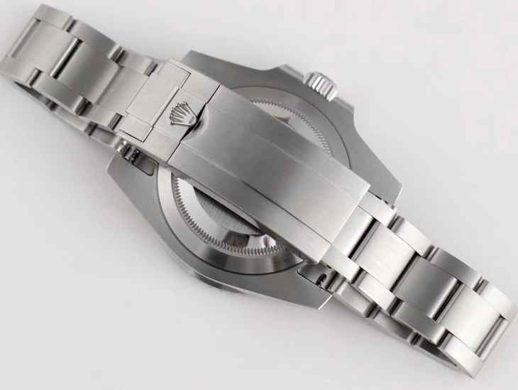 说到表扣,不妨给大家发点干货。如果你是一个门外汉,手上也没放大镜,想知道一支表的品质怎么办?你哪里都不用看,就看表扣,表扣的隐蔽倒角打磨还有细节处理就可以出卖整只手表的品质。特别是劳力士这种复杂保险扣,想做到和原装一样,工序比表壳还复杂,想知道水鬼做得怎么样,看看表扣中间拱形桥的铆钉周边是否平整就可以了,大部分厂家这个部位从侧面看过去都能看到很多明显的皱褶,当然原装也不是完全没有,仔细看还是能看到的,因为这毕竟是拱形的部位加之中间又连体铆钉,V9工厂突破市场复刻瓶颈,表扣铆钉周边几乎和原装一样平整光洁,克服了某厂大量波浪纹一眼假的问题,表扣皇冠一体成型不易掉,五指精致闪亮;