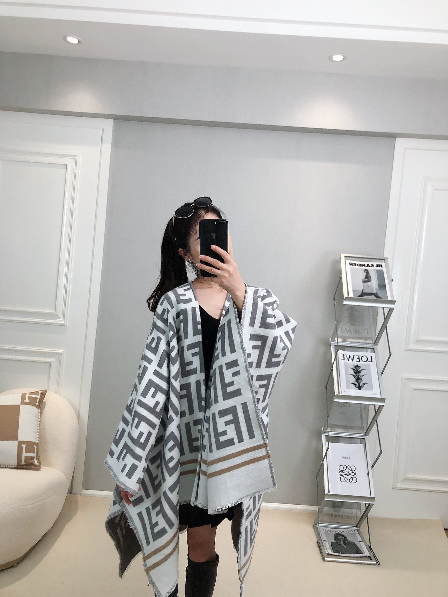 秋冬特惠💰170 芬迪围巾斗篷!简单内搭披上这个斗篷,配个靴拎个包,妥妥的贵妇穿搭!!有钱有颜有品味!!这款斗篷实物真人随便搭都好看,非常显腿长,显时髦感的!不挑人,人人人人都可以驾驭得时髦感!尺寸规格:140cm*140cm