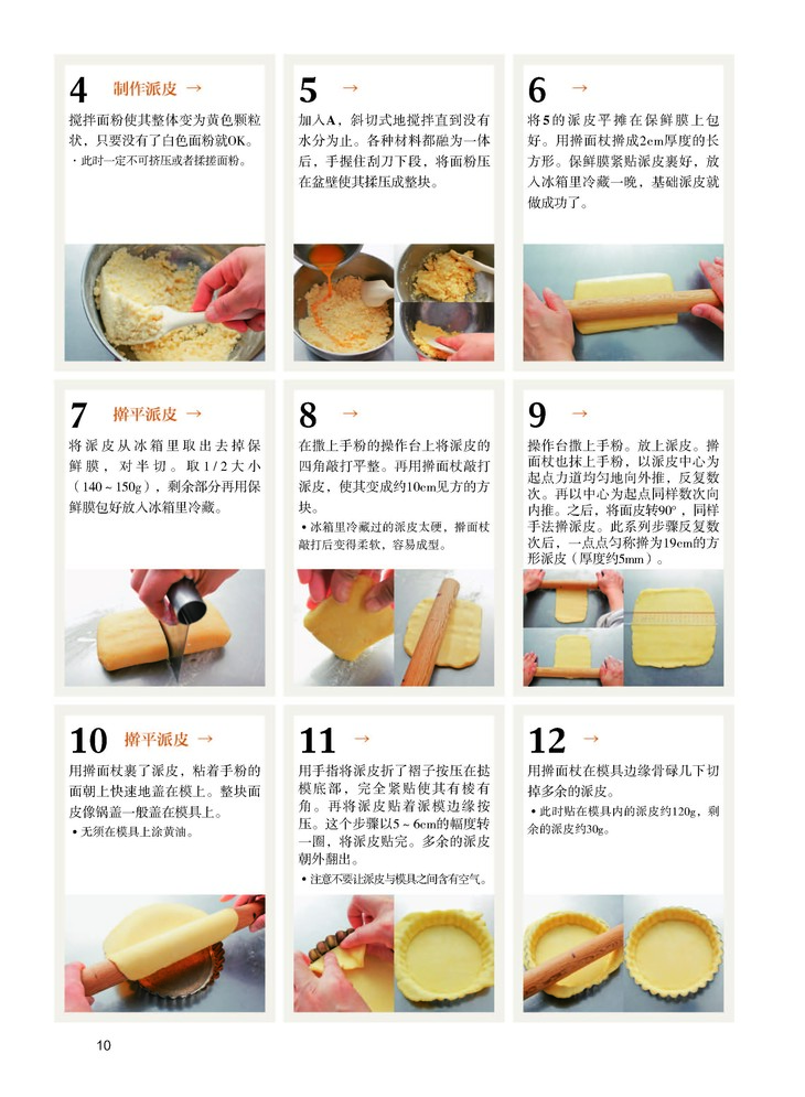 本书介绍的各种派皮都下了许多功夫。比如“折叠派皮”是用一种简单省力的方法,即便是缩短时间和简化手法,通过反复折叠派皮,也会使成品的口感如同经典派皮一样的分层,酥脆。