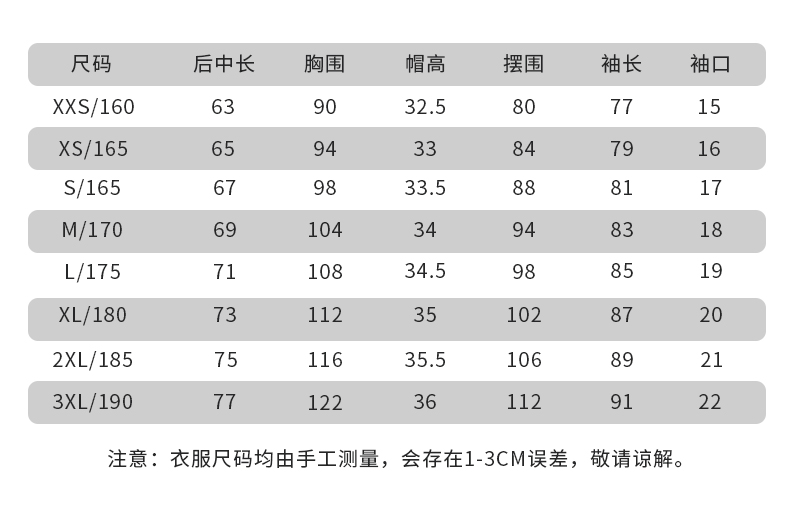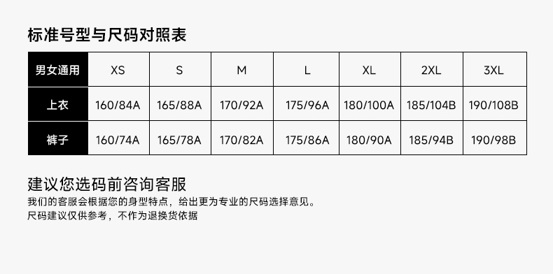 160\XS,165S,170M,175L