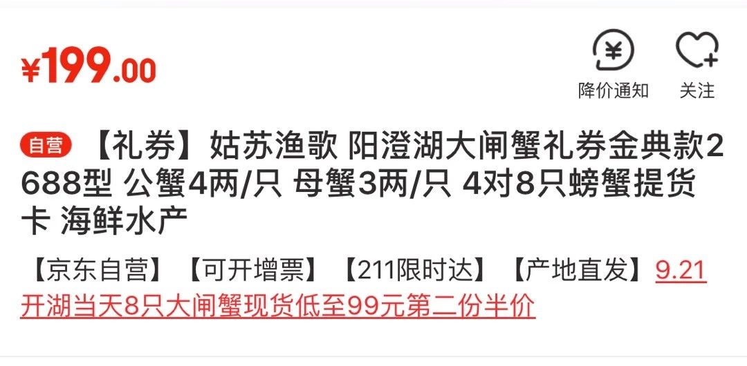 至于这些螃蟹的价格更加吓人,8只螃蟹总计快3斤了才只卖199,第二份还半价,真把阳澄湖大闸蟹当湖水卖呢?