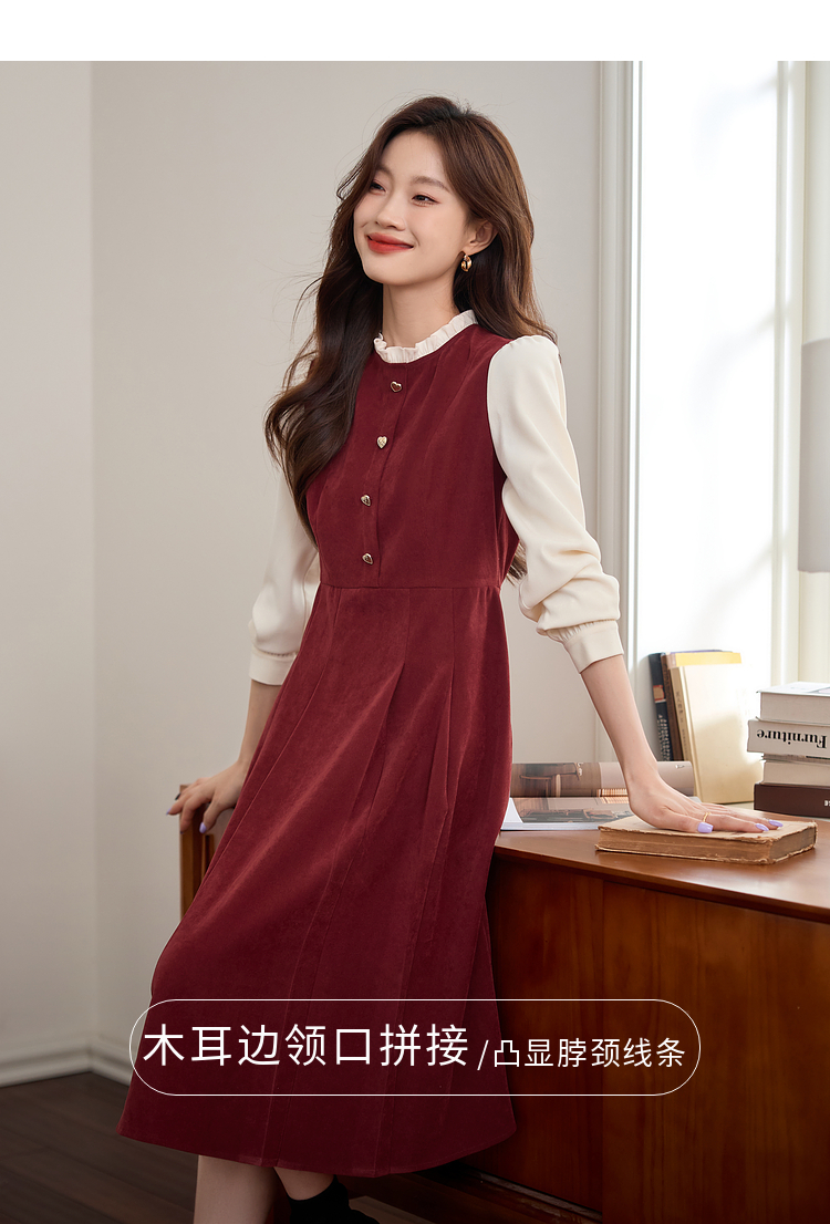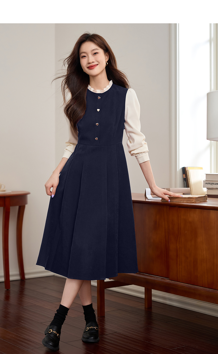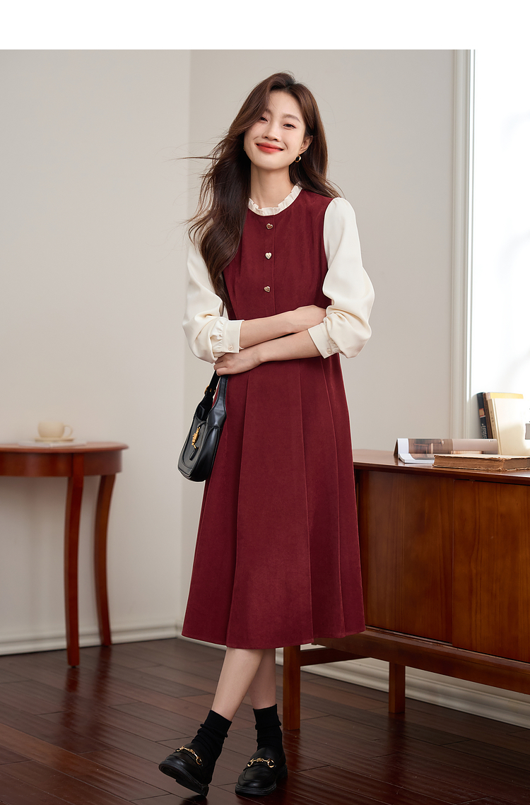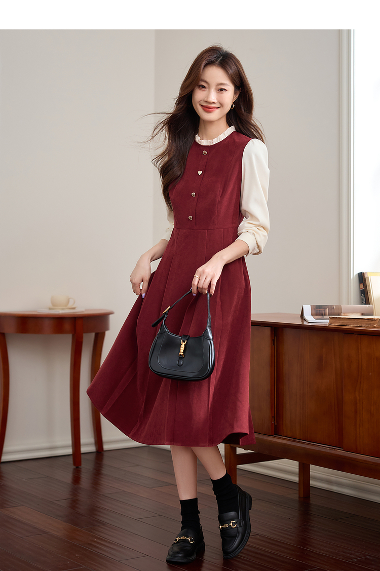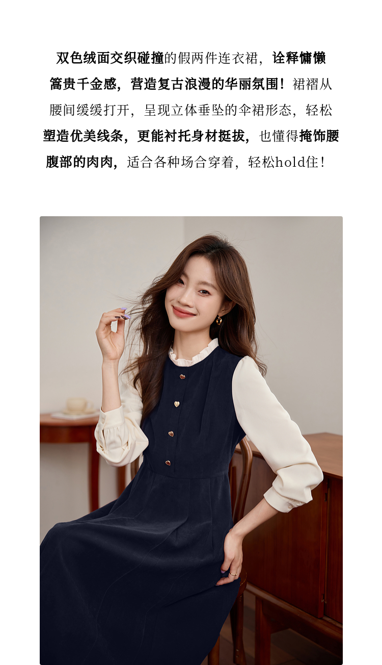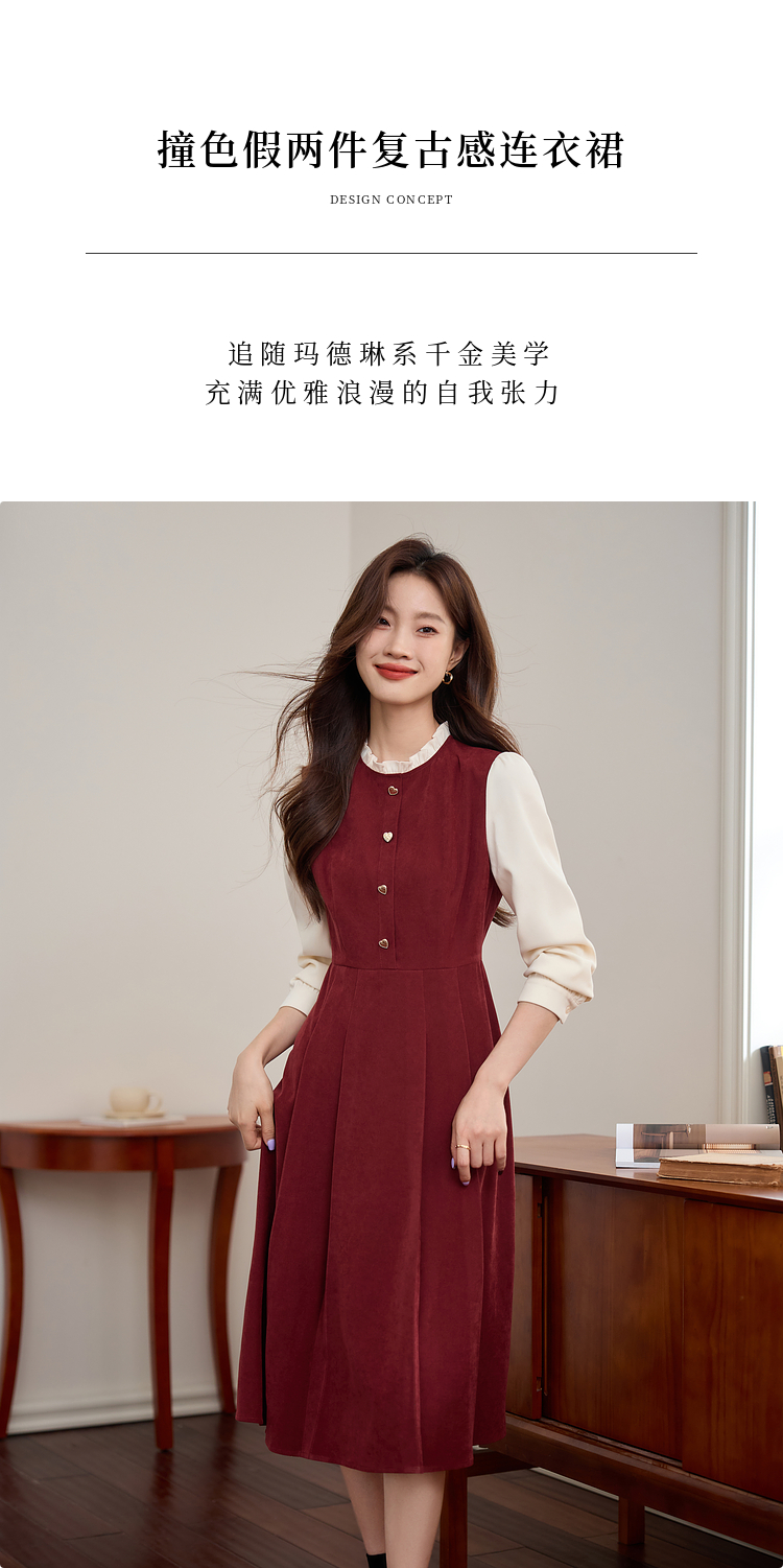 【专属特价】熙世界法式赫本小香风连衣裙秋季新款复古感长袖拼接假两件裙子