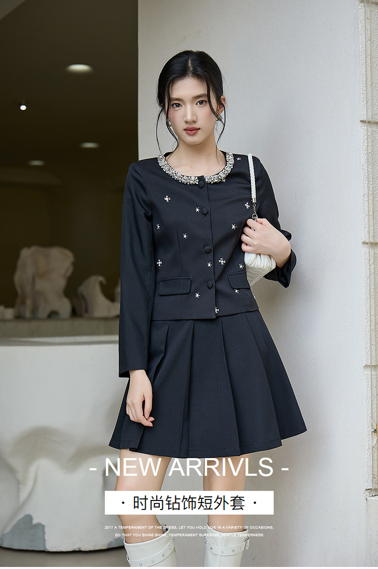奢姿大码女装2025秋季胖妹妹减龄钻饰圆领假口袋设计时尚短外套9953353621A