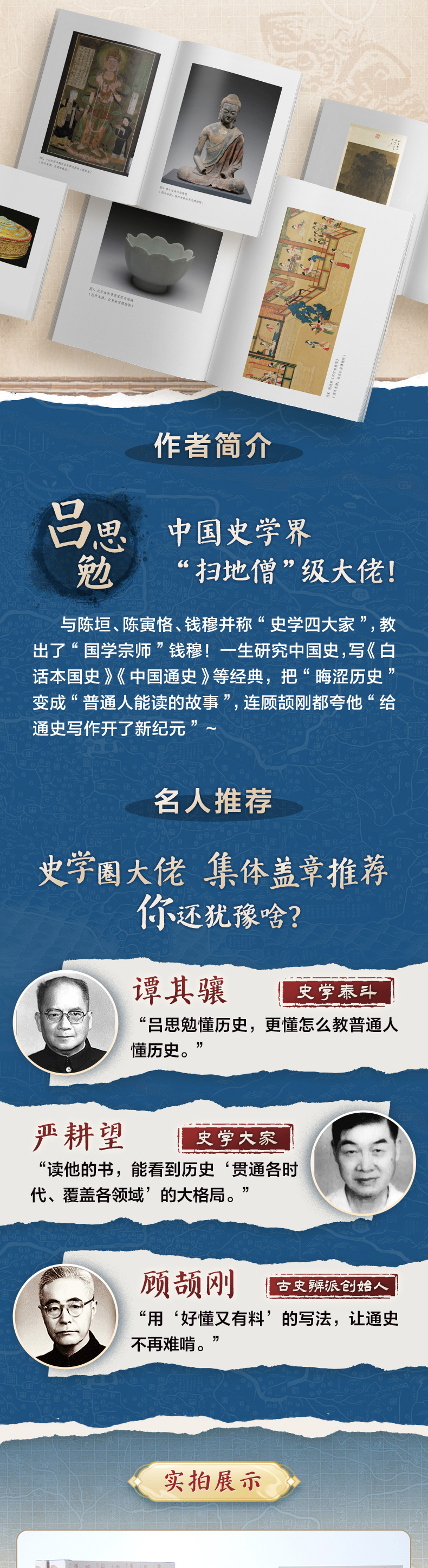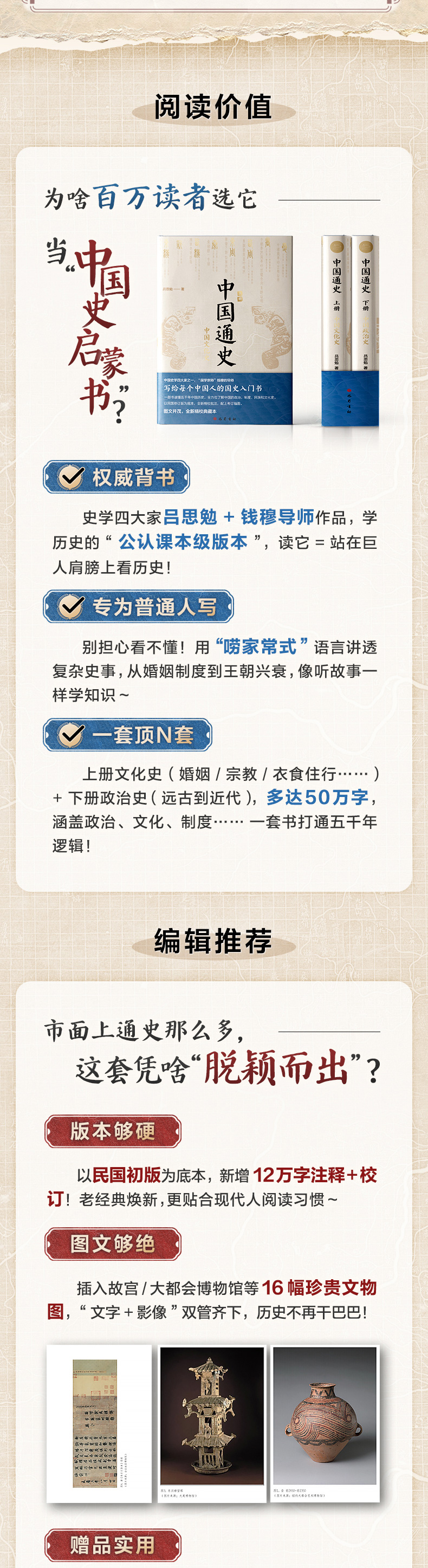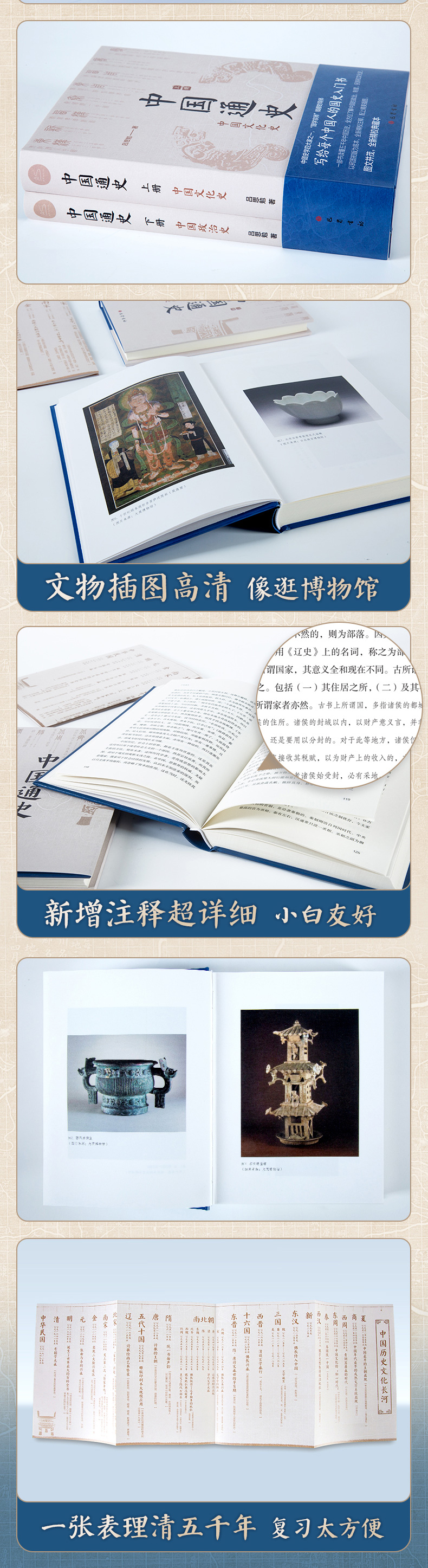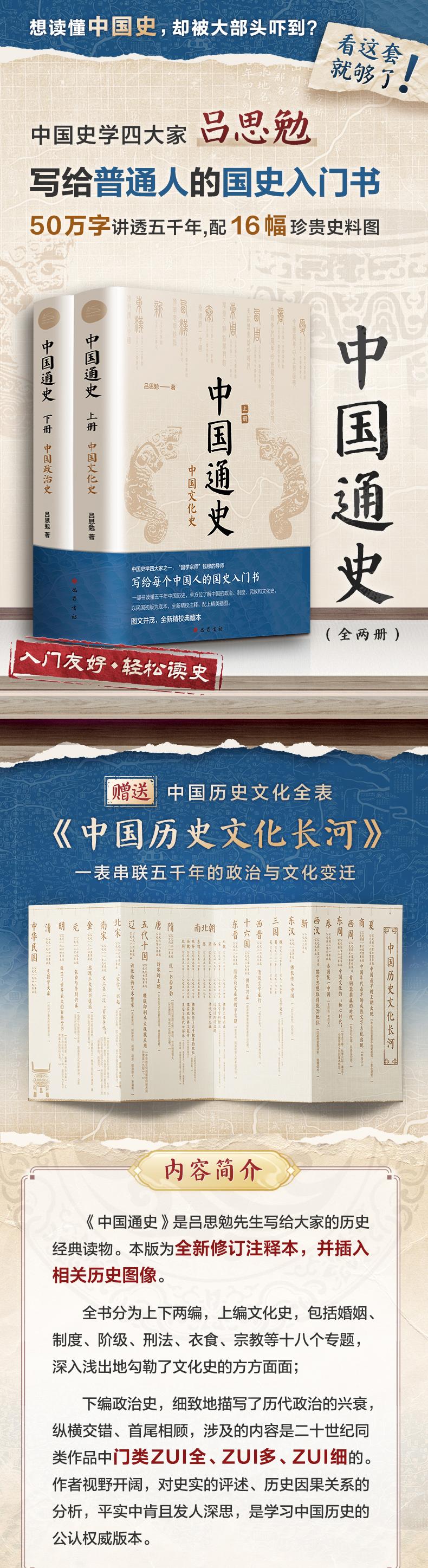 《中国通史》,是吕思勉先生写给大家的历史经典读物。本版为全新修订注释本,并插入相关历史图像。全书分为上下两编,上编文化史,包括婚姻、制度、阶级、刑法、衣食、宗教等十八个专题,深入浅出地勾勒了文化史的方方面面;下编政治史,细致地描写了历代政治的兴衰,纵横交错、首尾相顾,涉及的内容是二十世纪同类作品中门类最全、最多、最细的。作者视野开阔,对史实的评述、历史因果关系的分析,平实中肯且发人深思,是学习中国历史的公认权威版本。初本38万字,本版修订注解增补12万字,共50万字,644页。汇成一套全面、准确的吕著中国通史。并且插入故宫博物院、纽约大都会博物馆、大英博物馆等重点博物馆珍贵藏品影像,图文再现五千年历史的华彩。赠送中国历史文化全表--《中国历史文化长河》一表串联34个王朝的政治与文化变迁。"