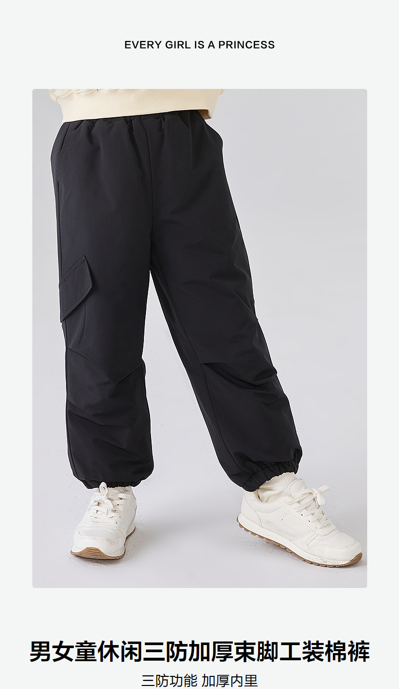 笛莎Deesha 2025冬季男女童休闲三防加厚束脚工装棉裤