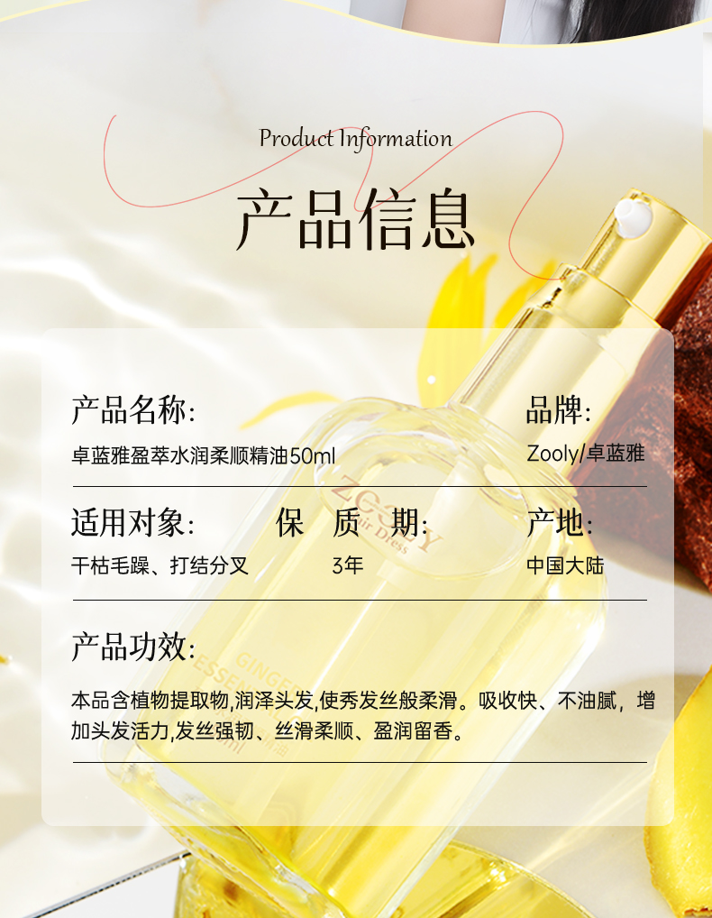 【功能四合一】卓蓝雅盈萃水润柔顺生姜护发精油50ml(20号)