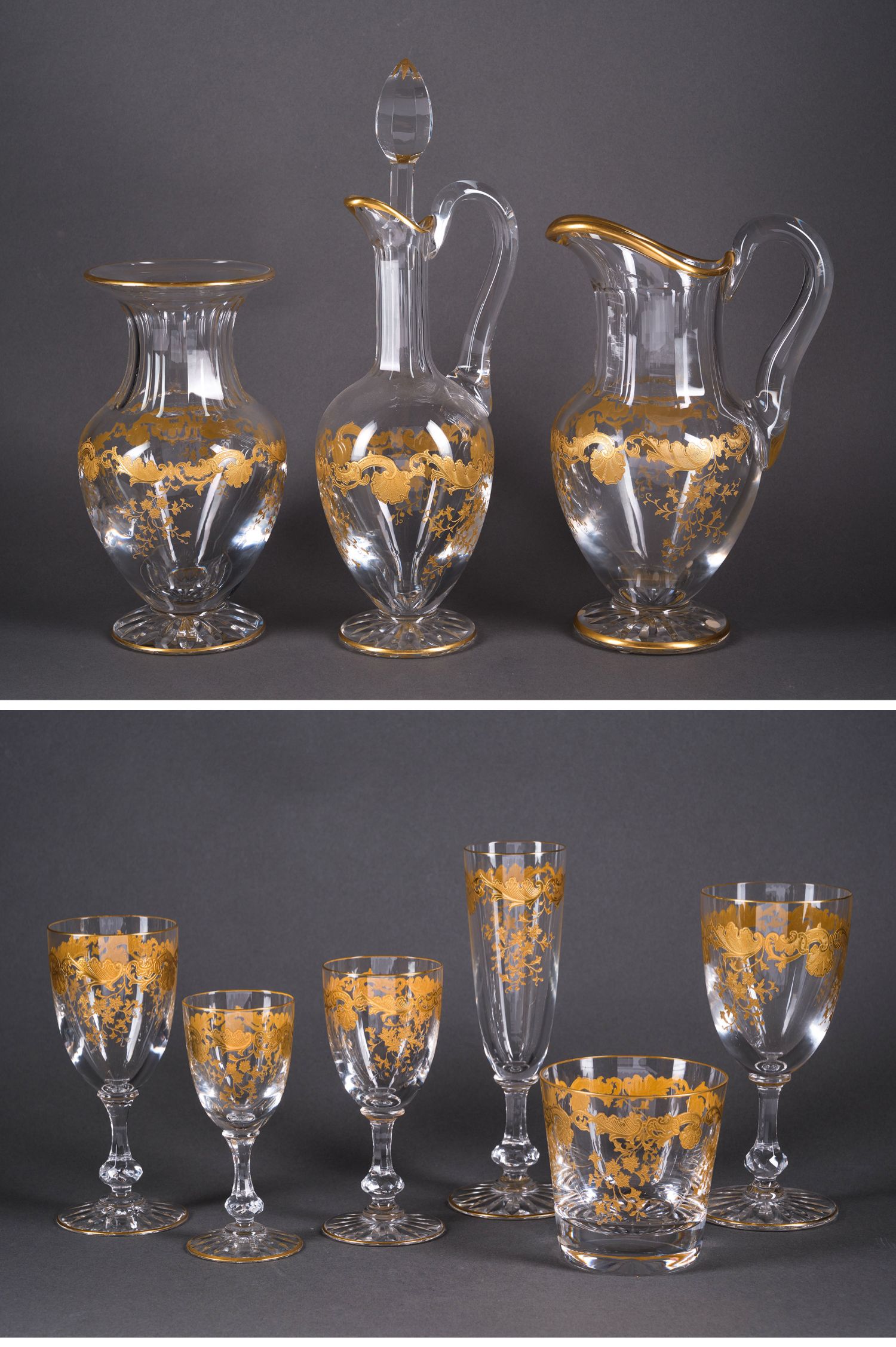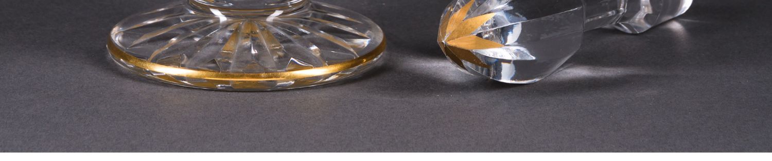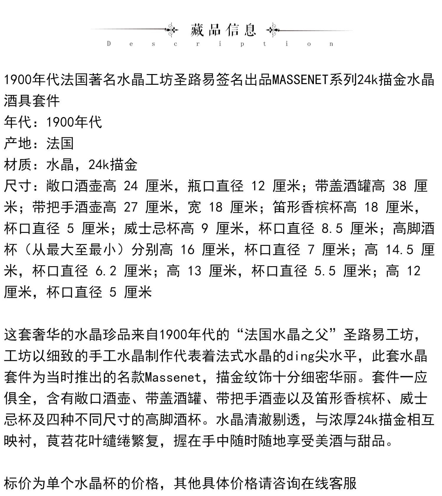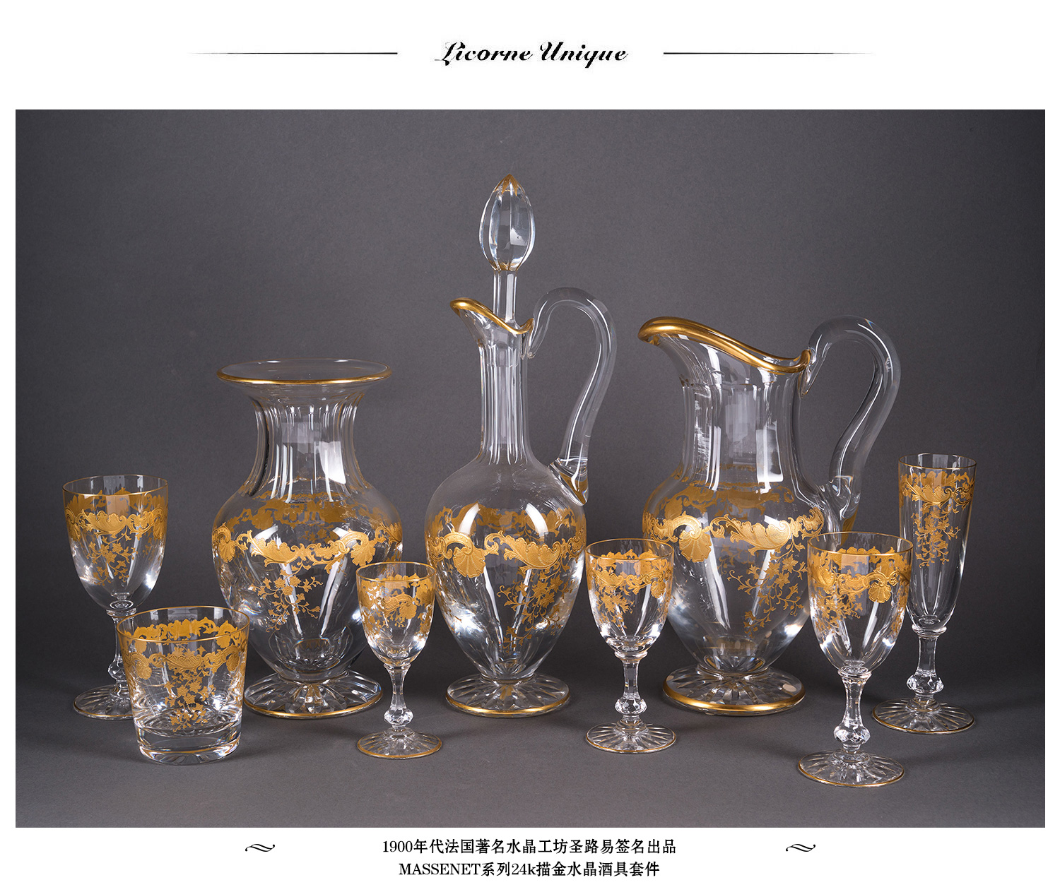独角鹿西洋古董法国圣路易签名MASSENET系列24K描金水晶酒具套件