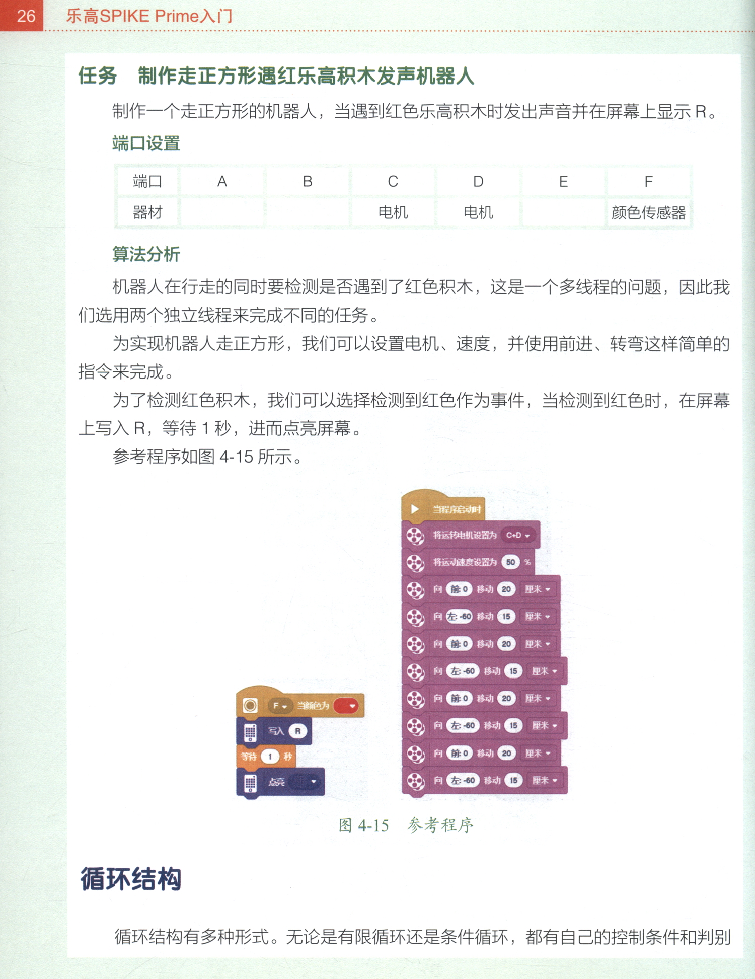 本书是一本选用乐高Prime科创套装作为载体学习编程的教材,希望通过将机器人硬件与编程相结合,培养学生的动手能力和创新思维,选择乐高器材是因为经过多年的探索我们发现乐高产品对不同年龄的学生都有很好的针对性,适合学生的心理和智力发展,而且乐高教育的产品贯通于学生的各年龄段,每个年龄段学生的课程都会成为下一阶段学习的基础。选用乐高Prime产品,可以使教育具有很好的可持续性。同时乐高Prime具有广泛的兼容性,与国际品牌的传感器和主流的编程环境兼容,学生通过学习乐高机器人,可以融入世界机器人教育的发展中,对学生们开阔视野具有很重要的意义。