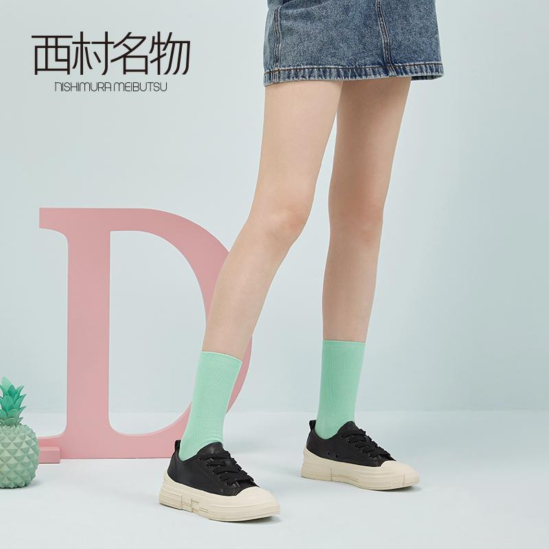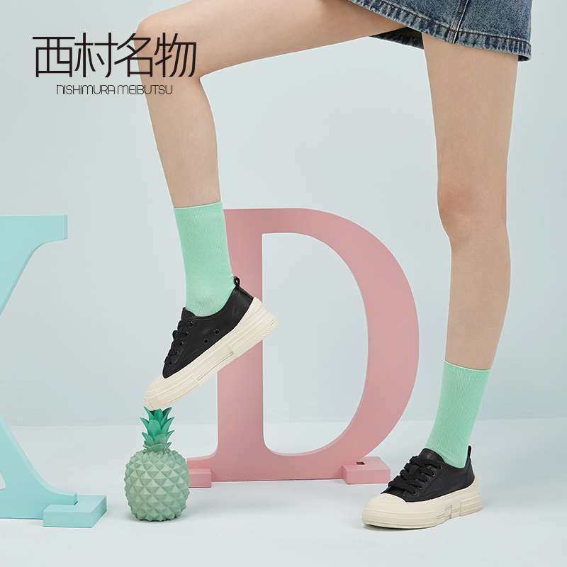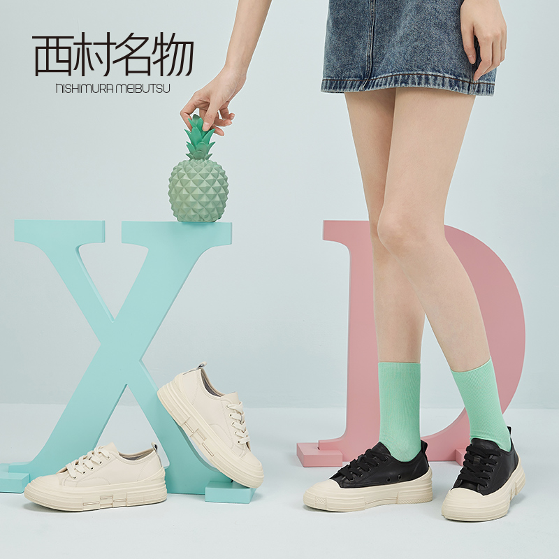 西村名物牛皮厚底运动休闲鞋女2020新绑带小白学生风贝壳鞋16271