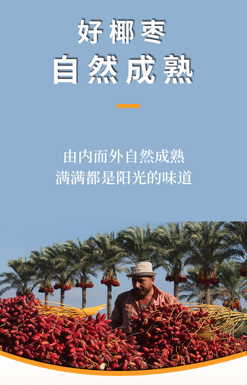 中东地区气候干旱、温度高,新鲜的椰枣成熟后,会在树上自然风干,形成我们看到的椰枣果干。