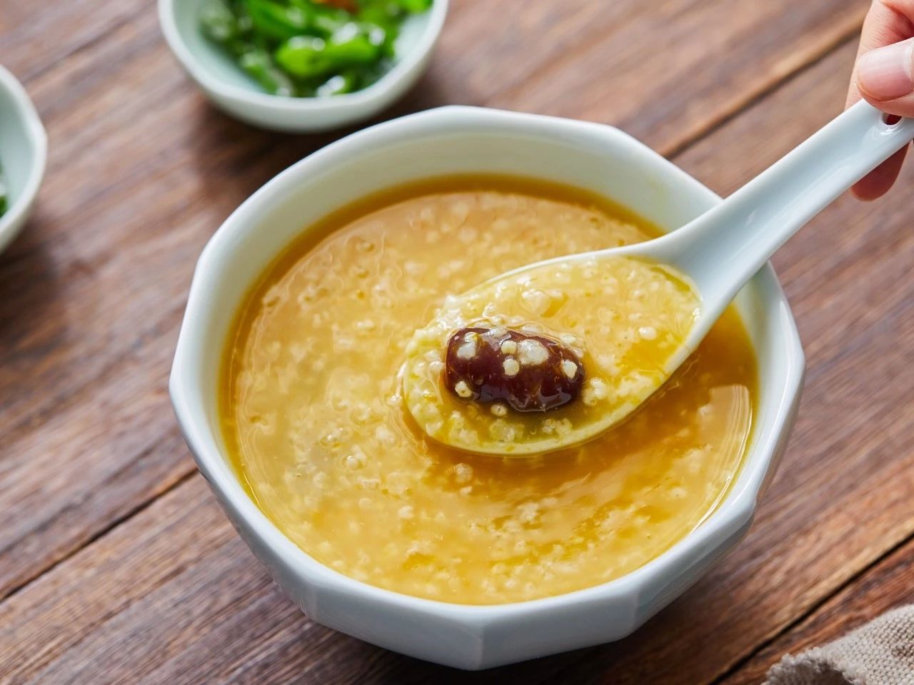 煮南瓜小米甜粥时,不需要加糖,多放几颗椰枣进去就很清甜了。