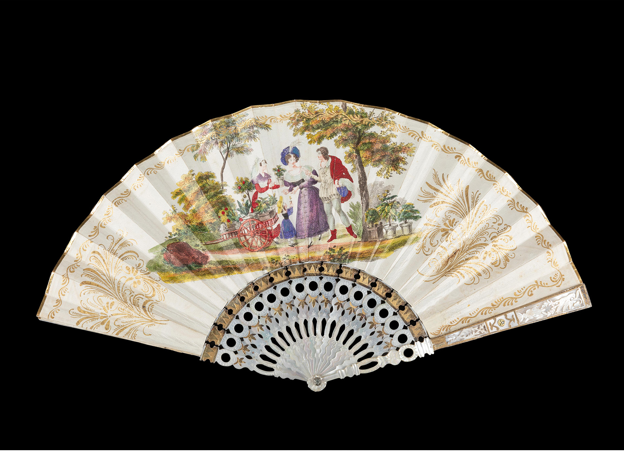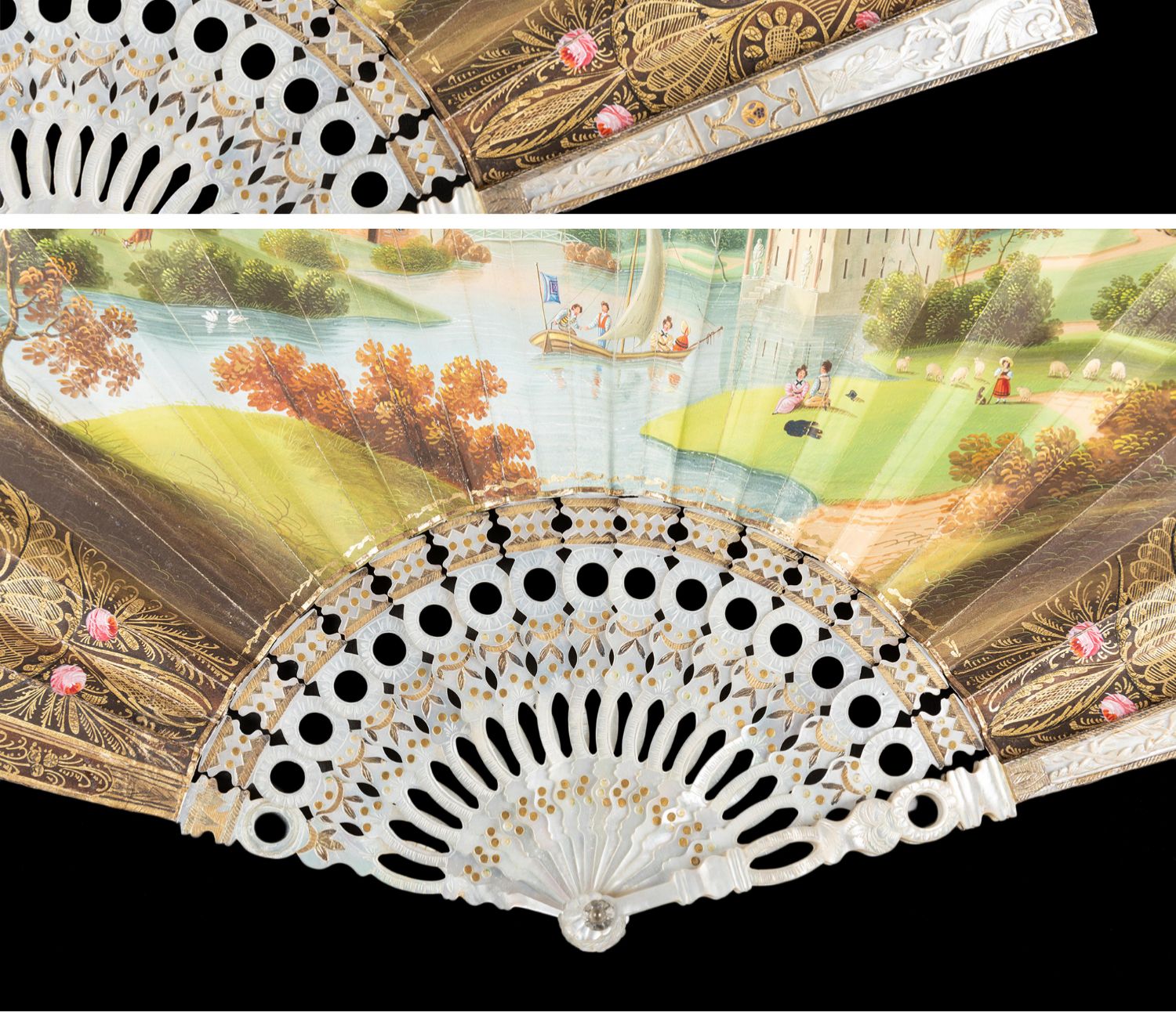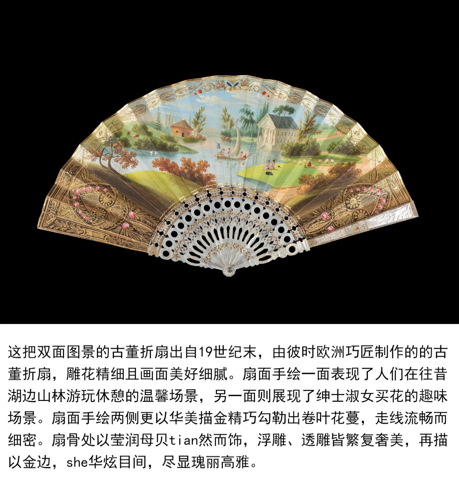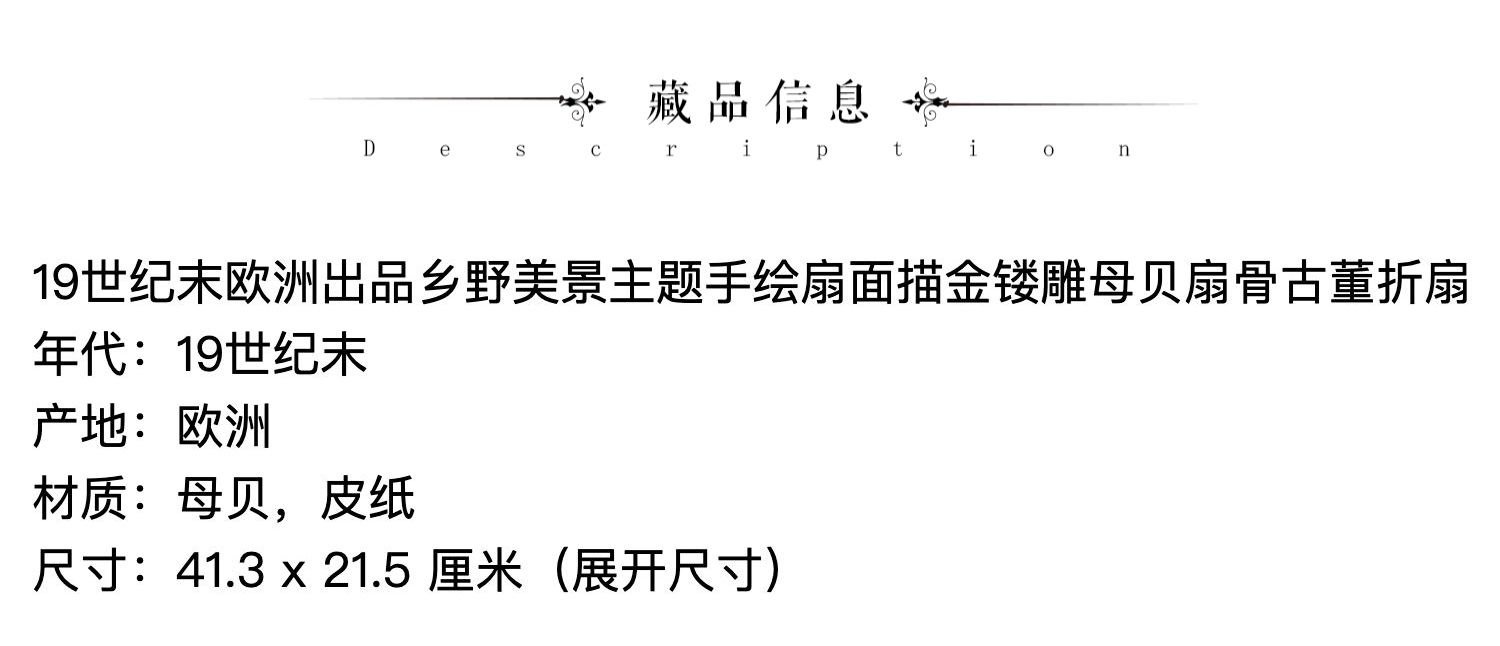 独角鹿西洋古董欧洲乡野美景手绘扇面描金镂雕母贝扇骨折扇
