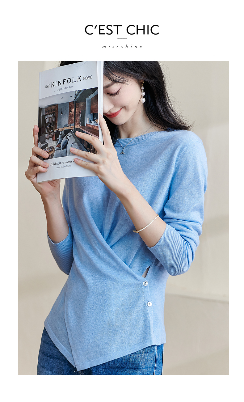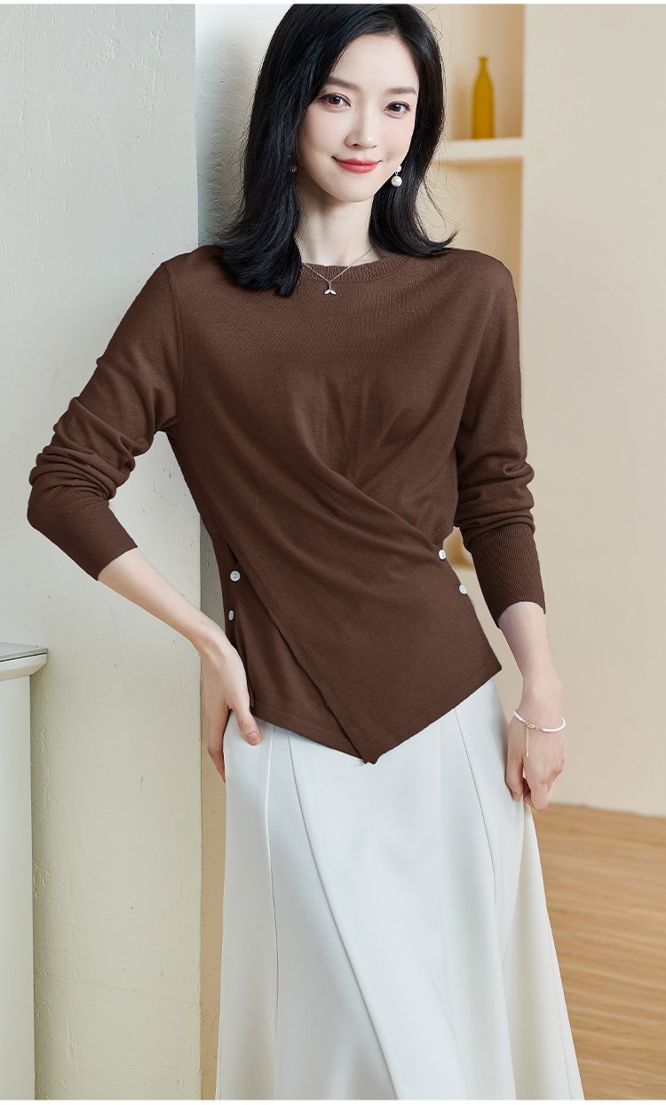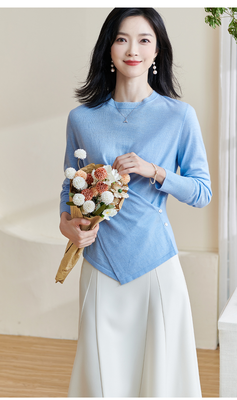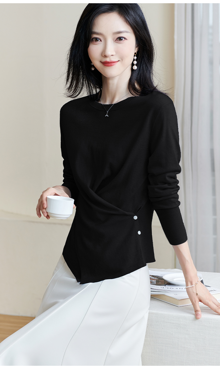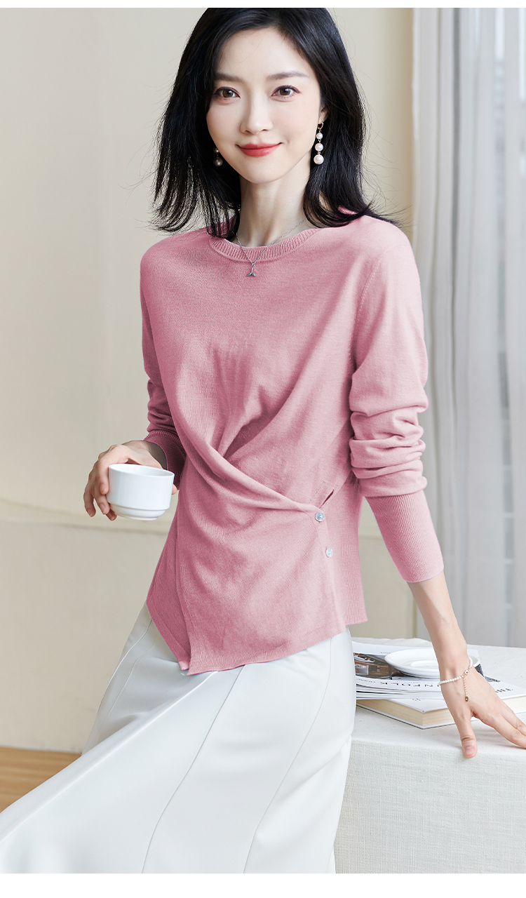 【羊毛设计感针织衫】米思阳2026春季新款时尚设计感纯色针织衫圆领长袖羊毛上衣女2372