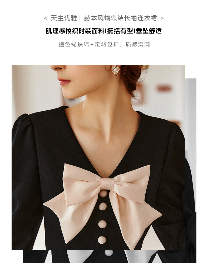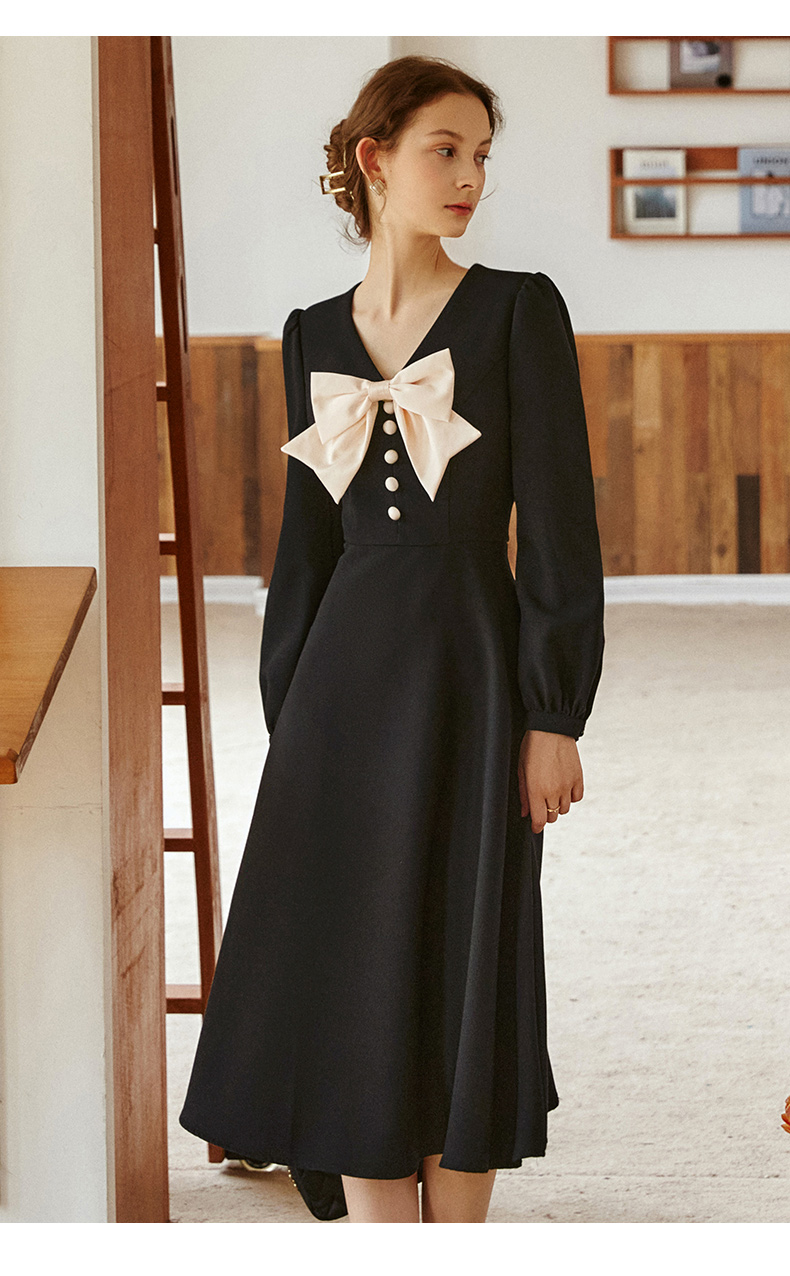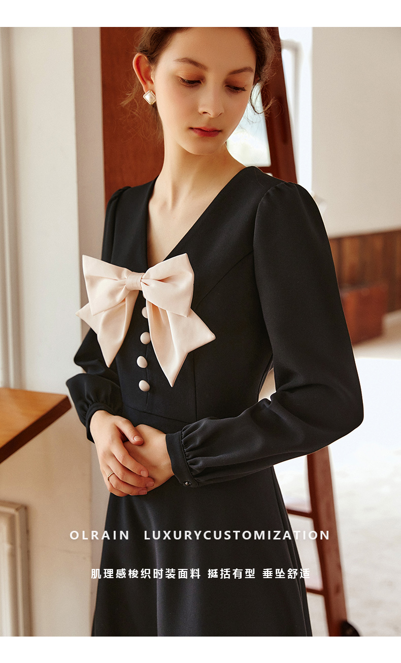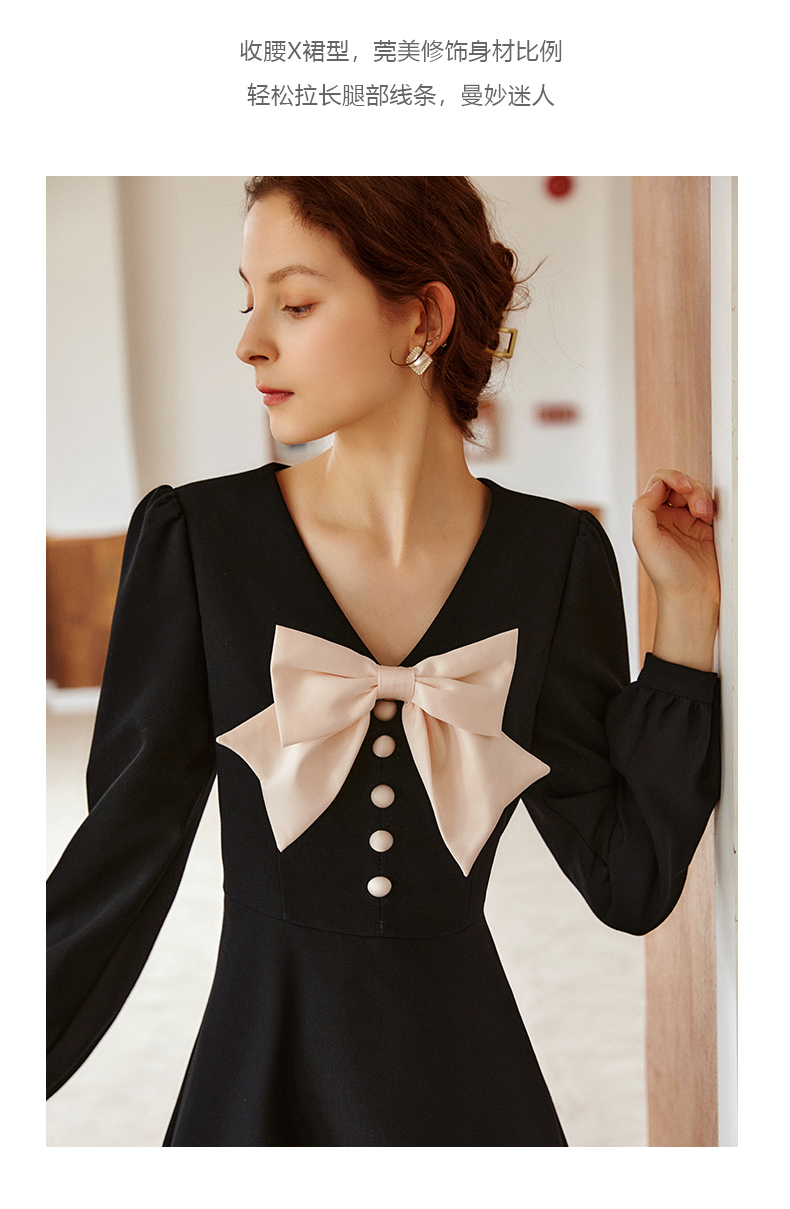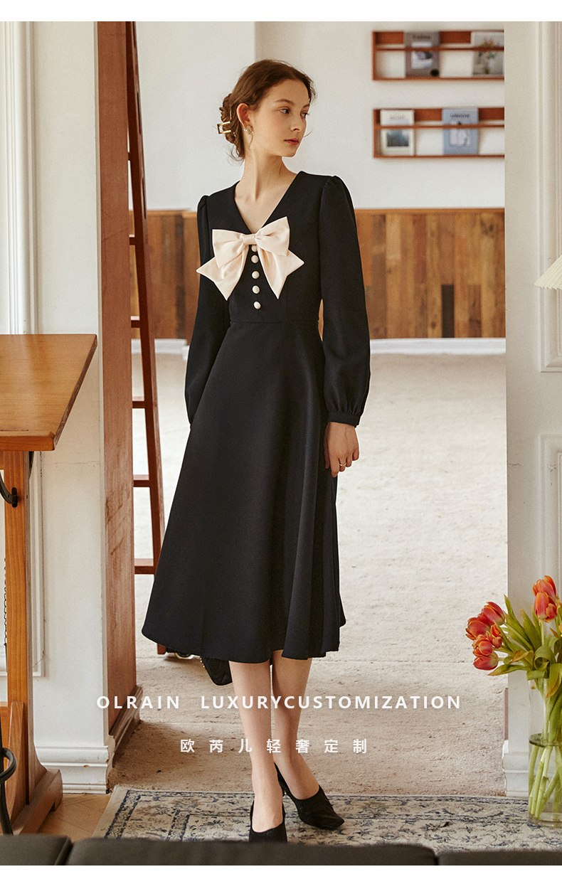 欧芮儿赫本风连衣裙女新款2021收腰法式小个子蝴蝶结黑色裙子