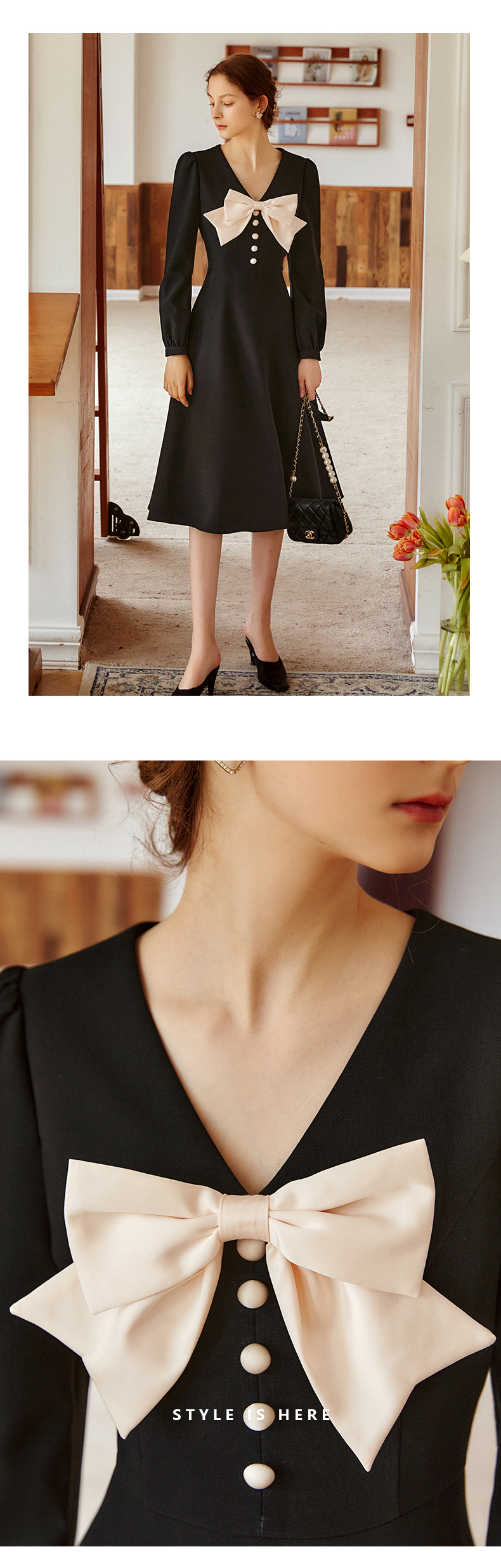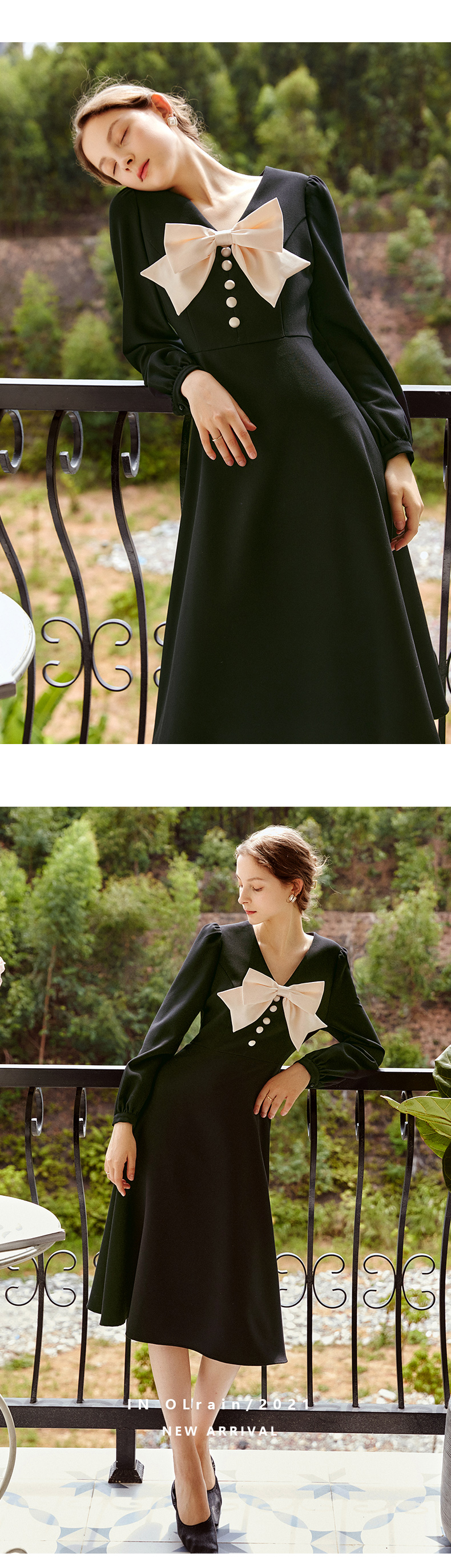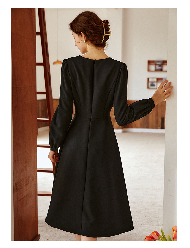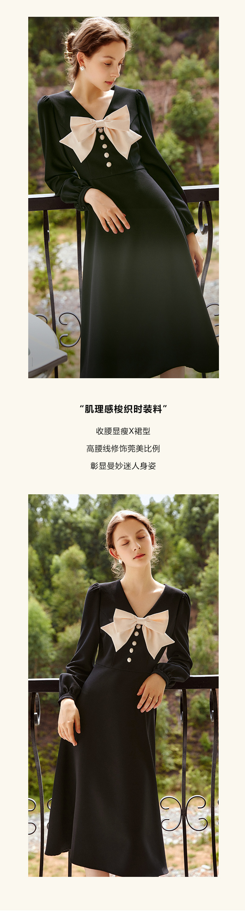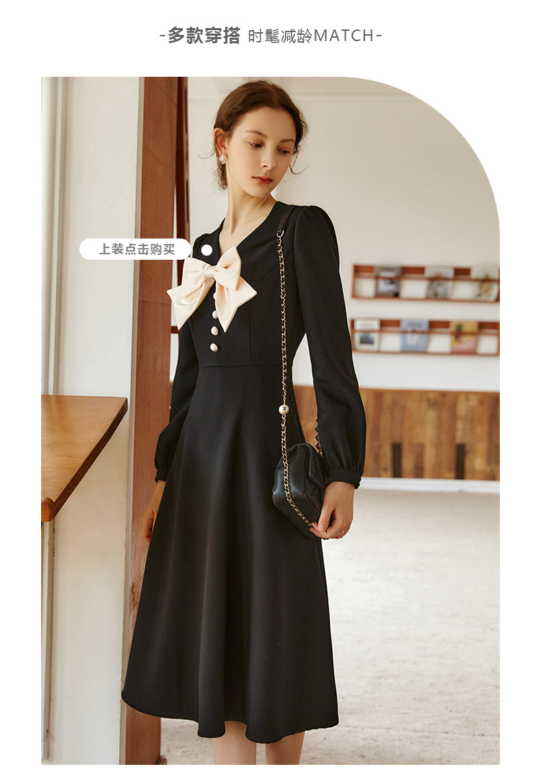 欧芮儿赫本风连衣裙女新款2021收腰法式小个子蝴蝶结黑色裙子