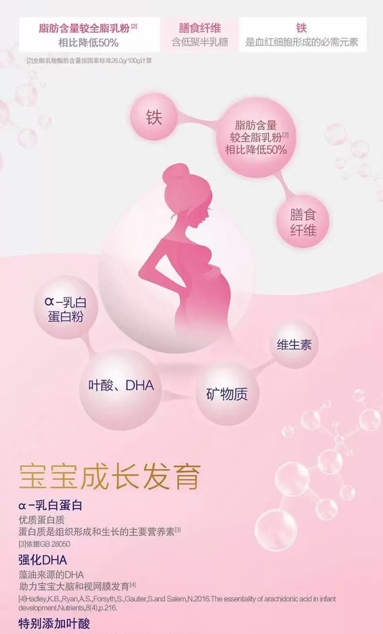 ②特别添加α乳白蛋白粉、钙、铁,促进胎儿发育;