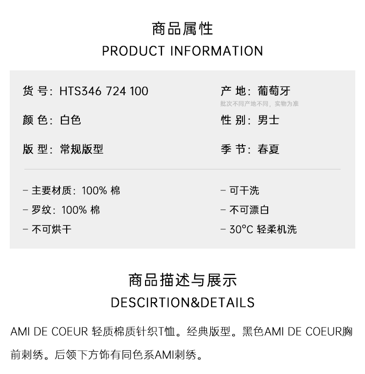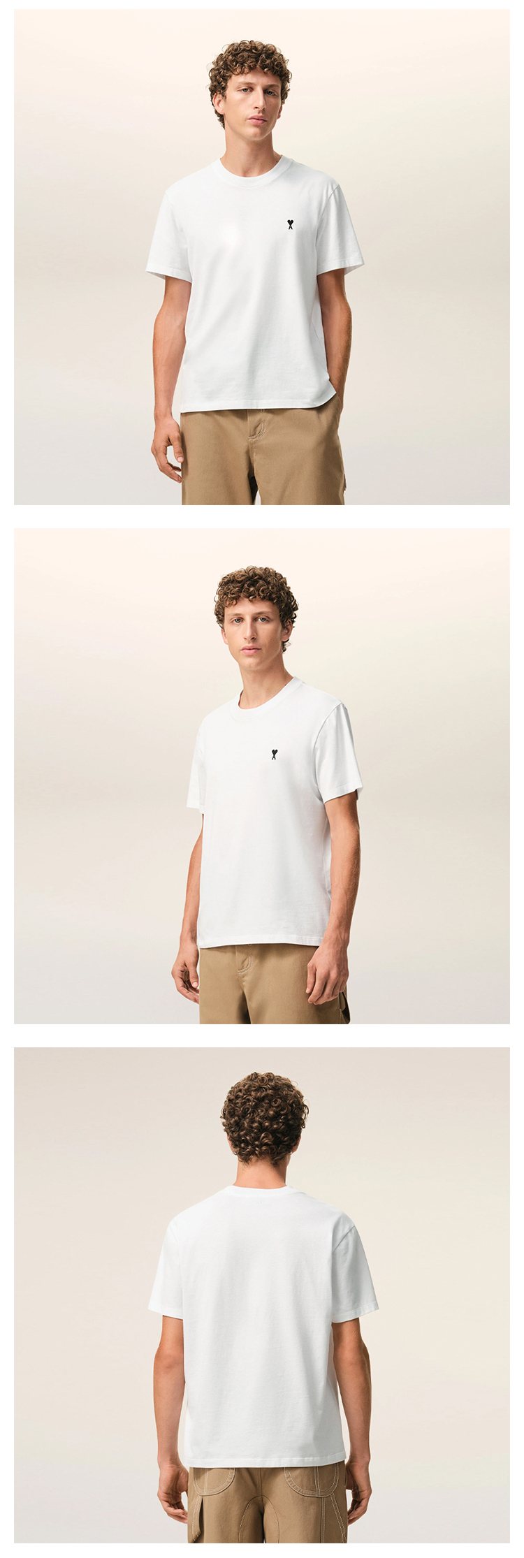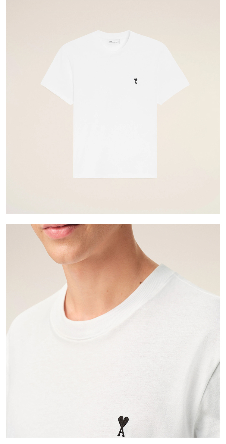 AMI PARIS 男士心形徽标刺绣棉质圆领短袖T恤 白色 HTS346 724 100