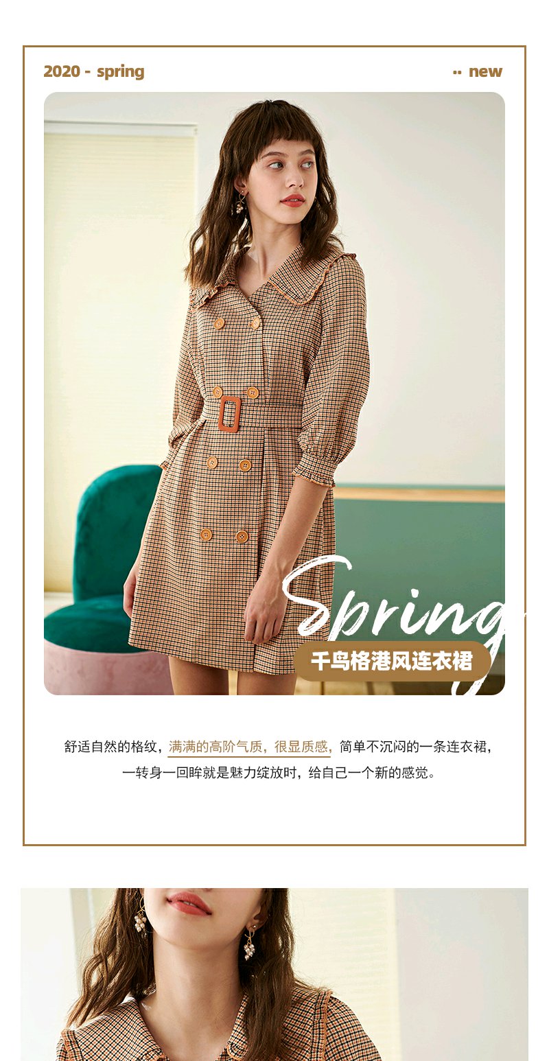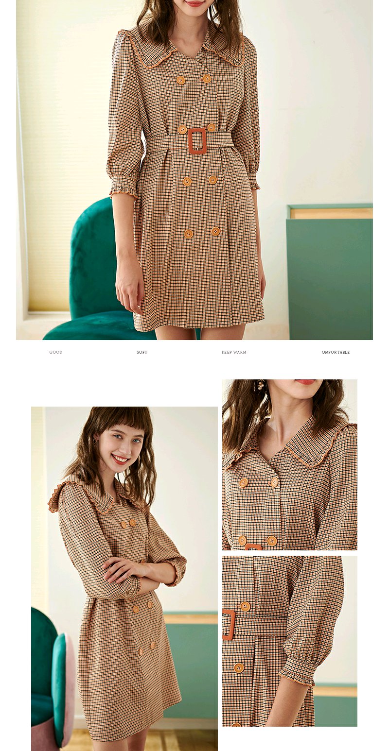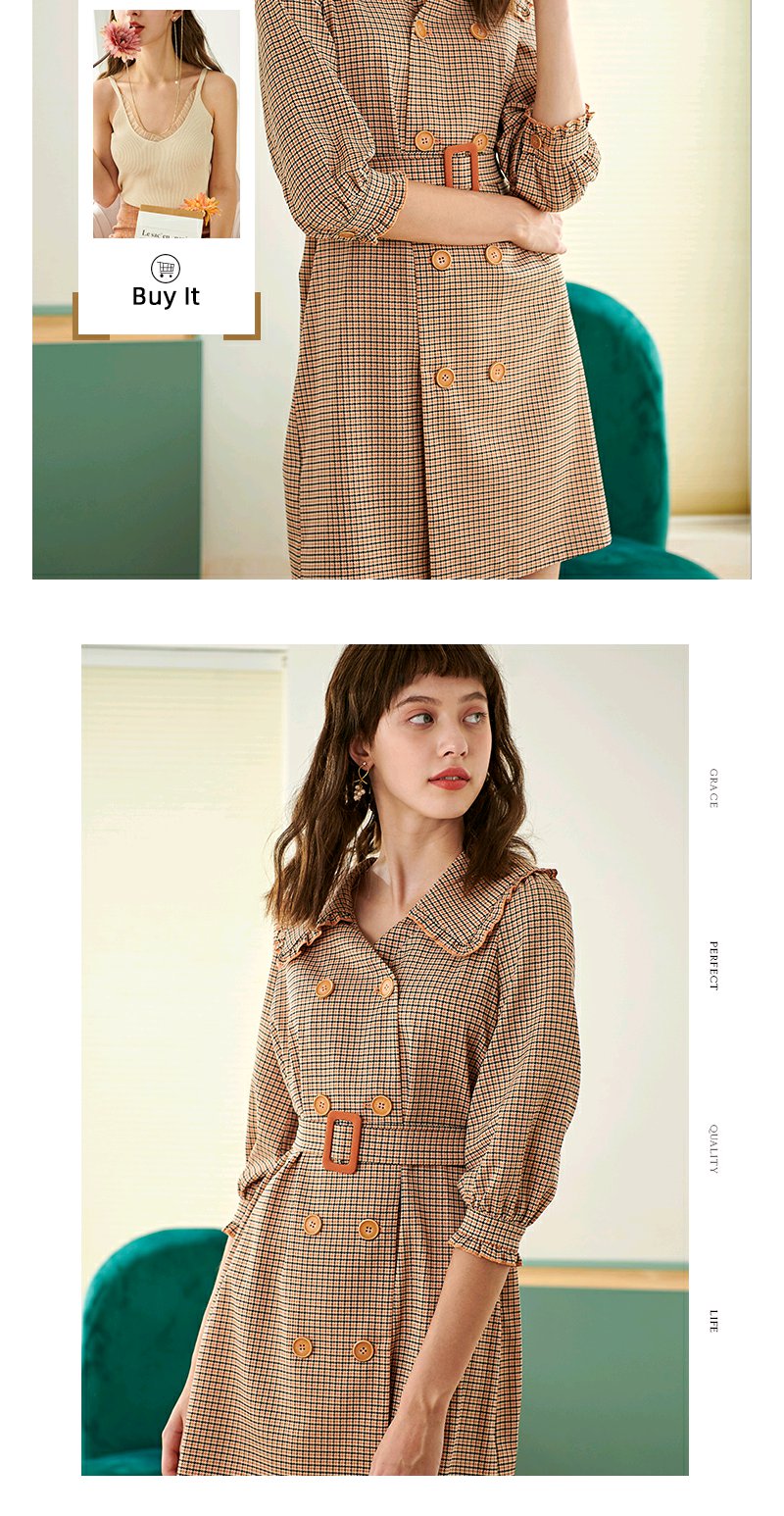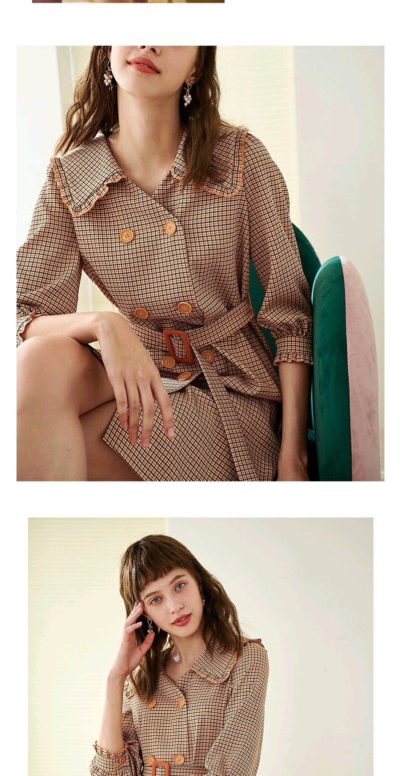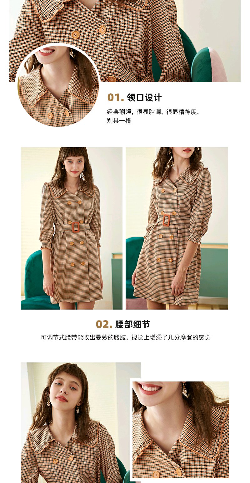 欧芮儿春新款七分袖格子连衣裙女中长款收腰双排扣A字裙