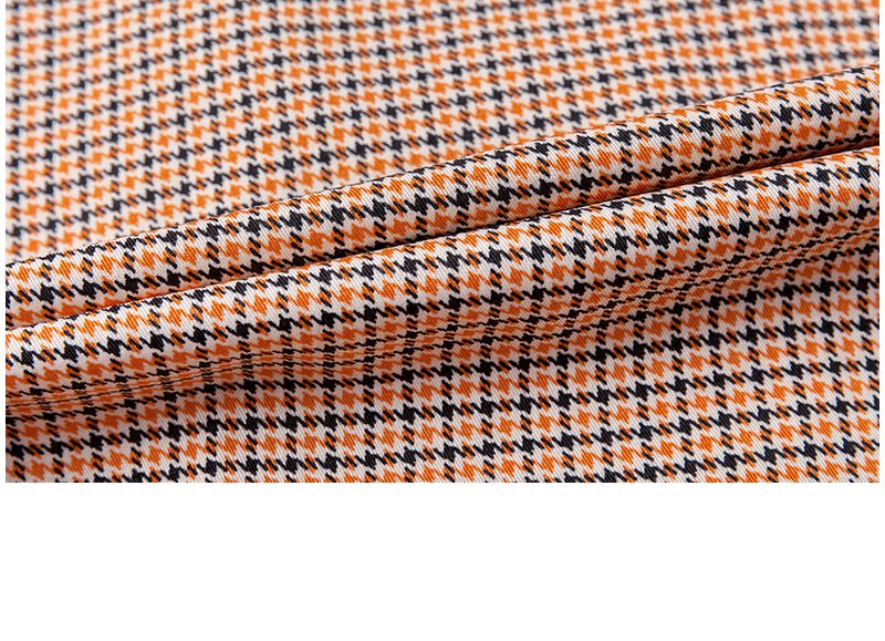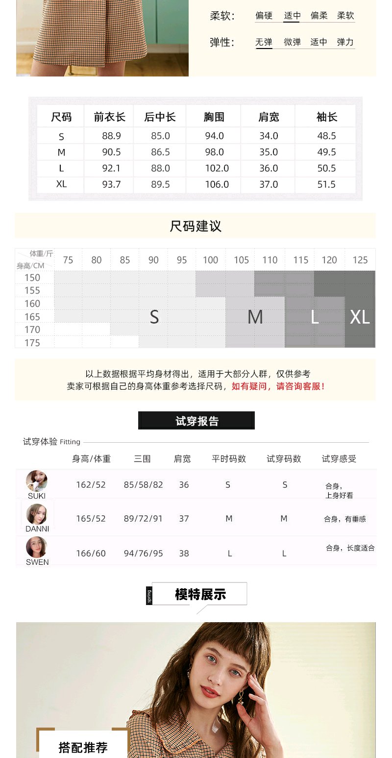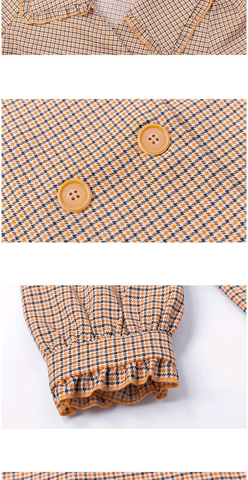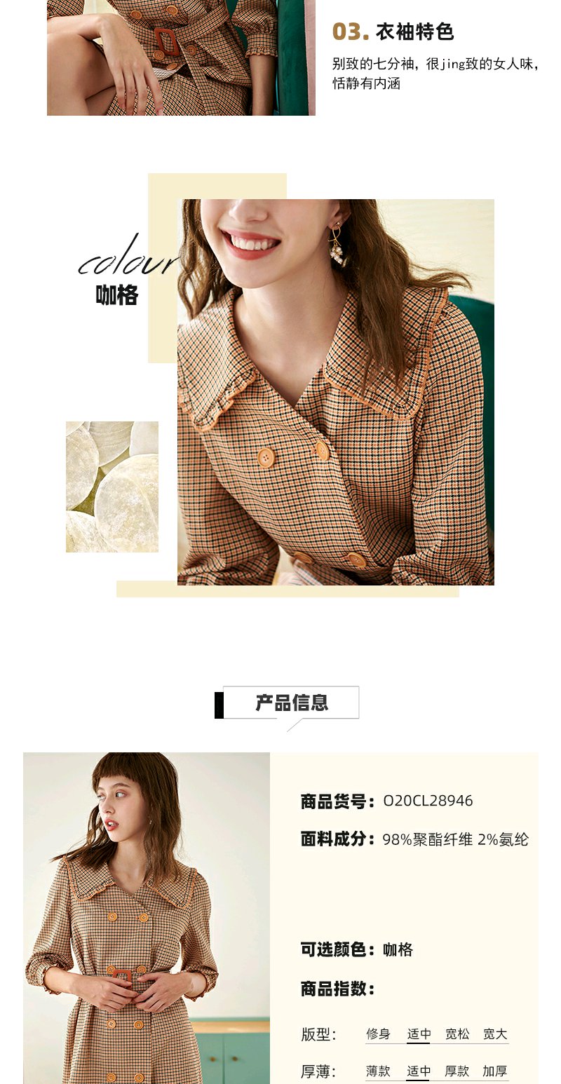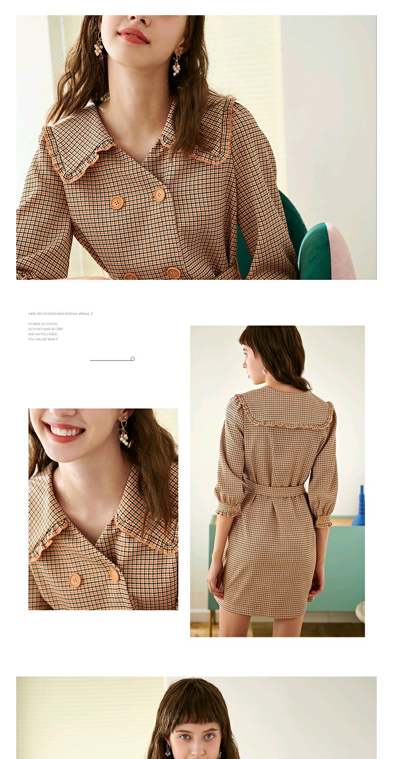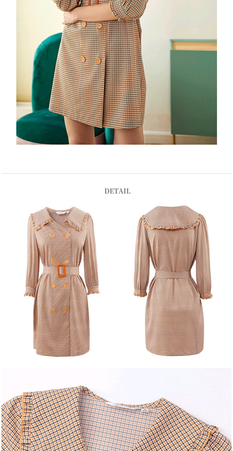 欧芮儿春新款七分袖格子连衣裙女中长款收腰双排扣A字裙