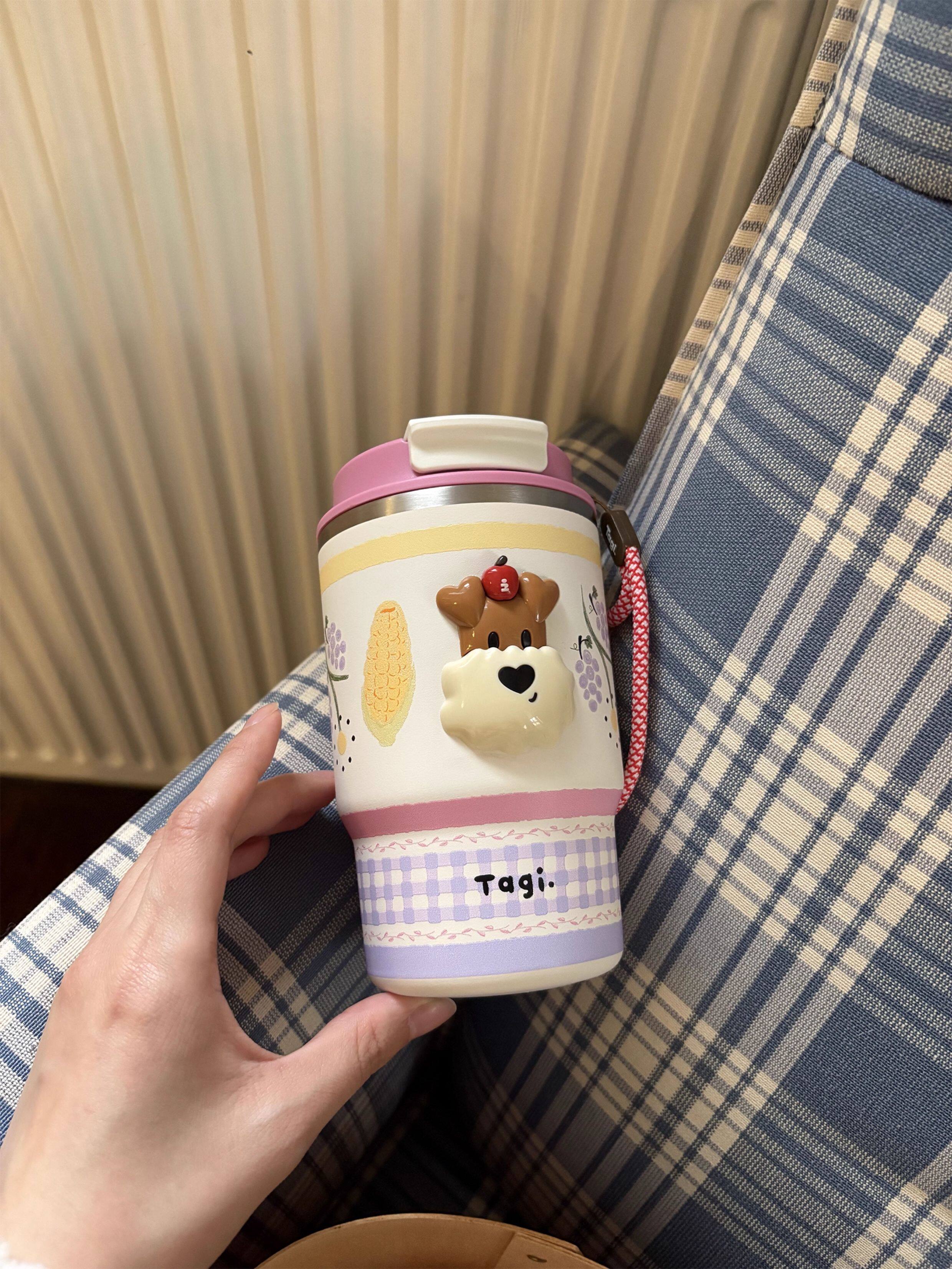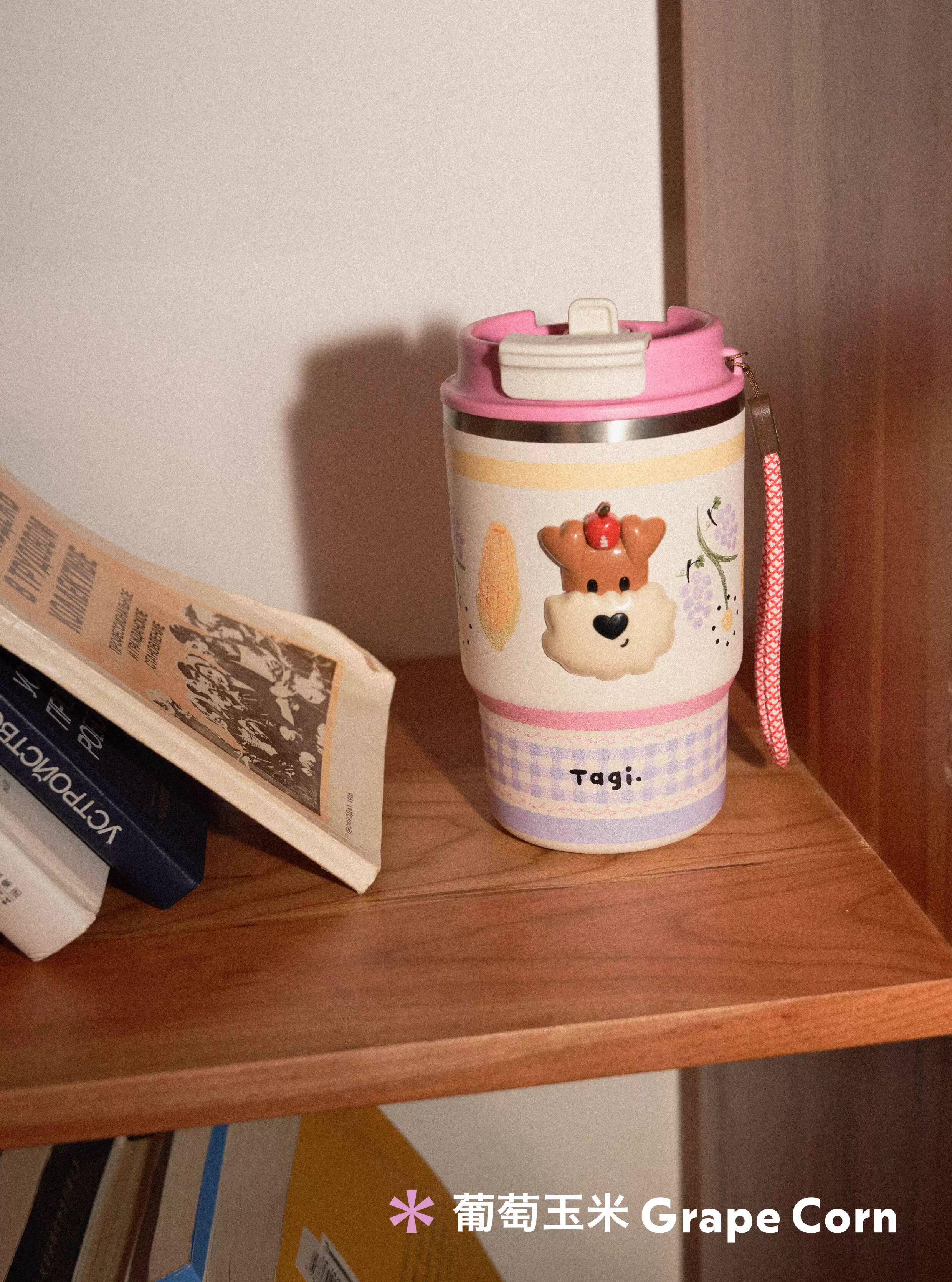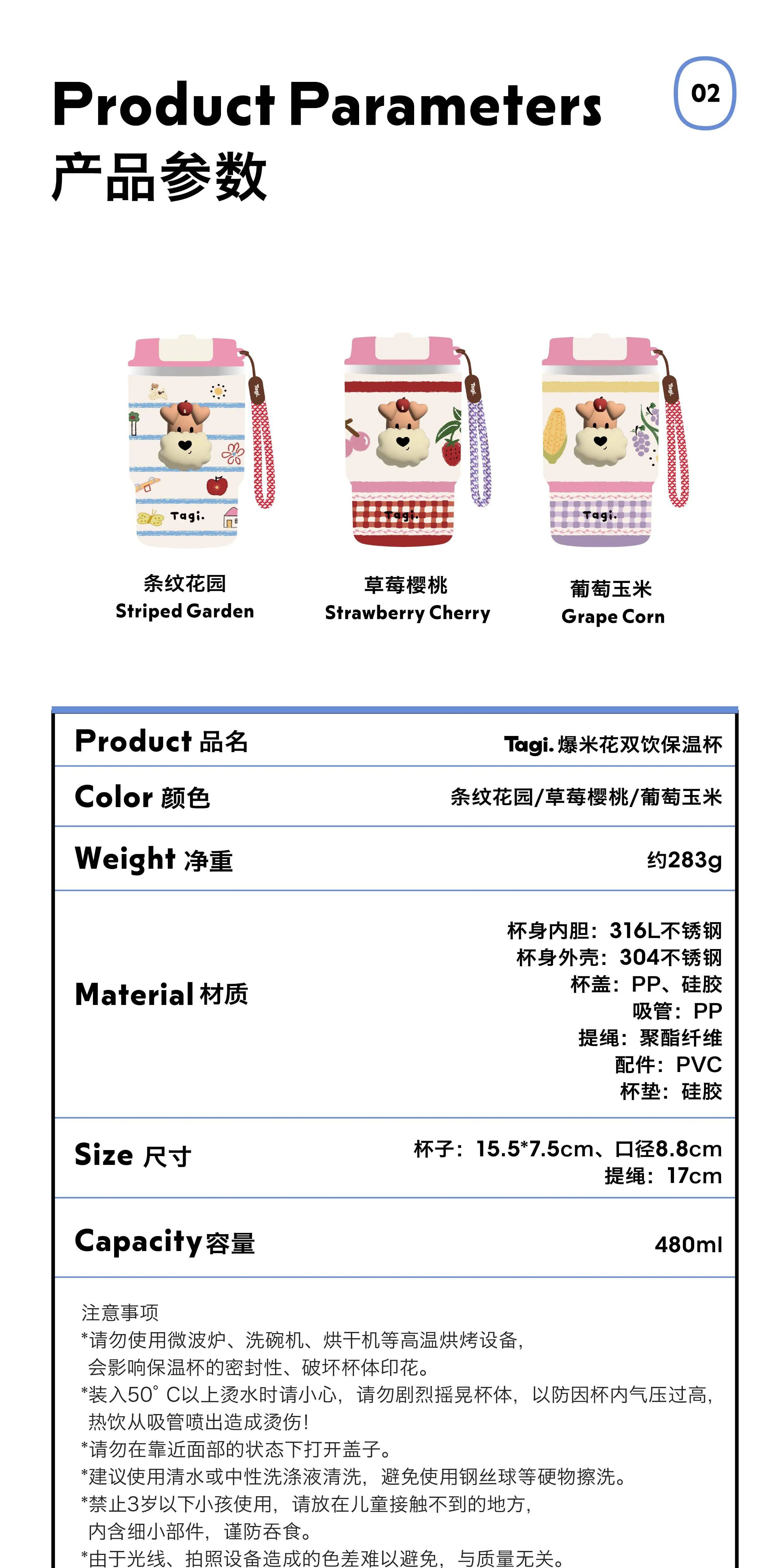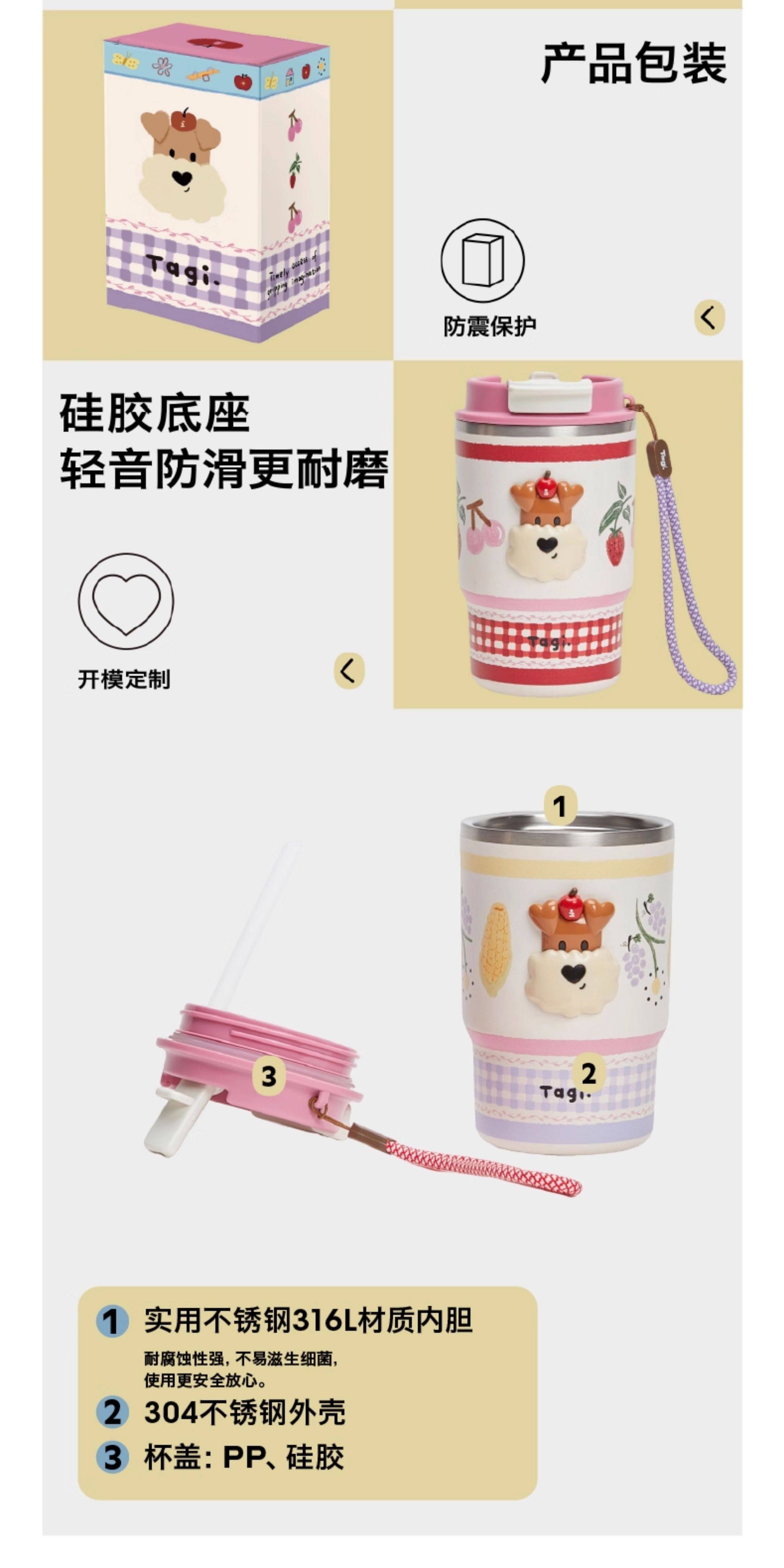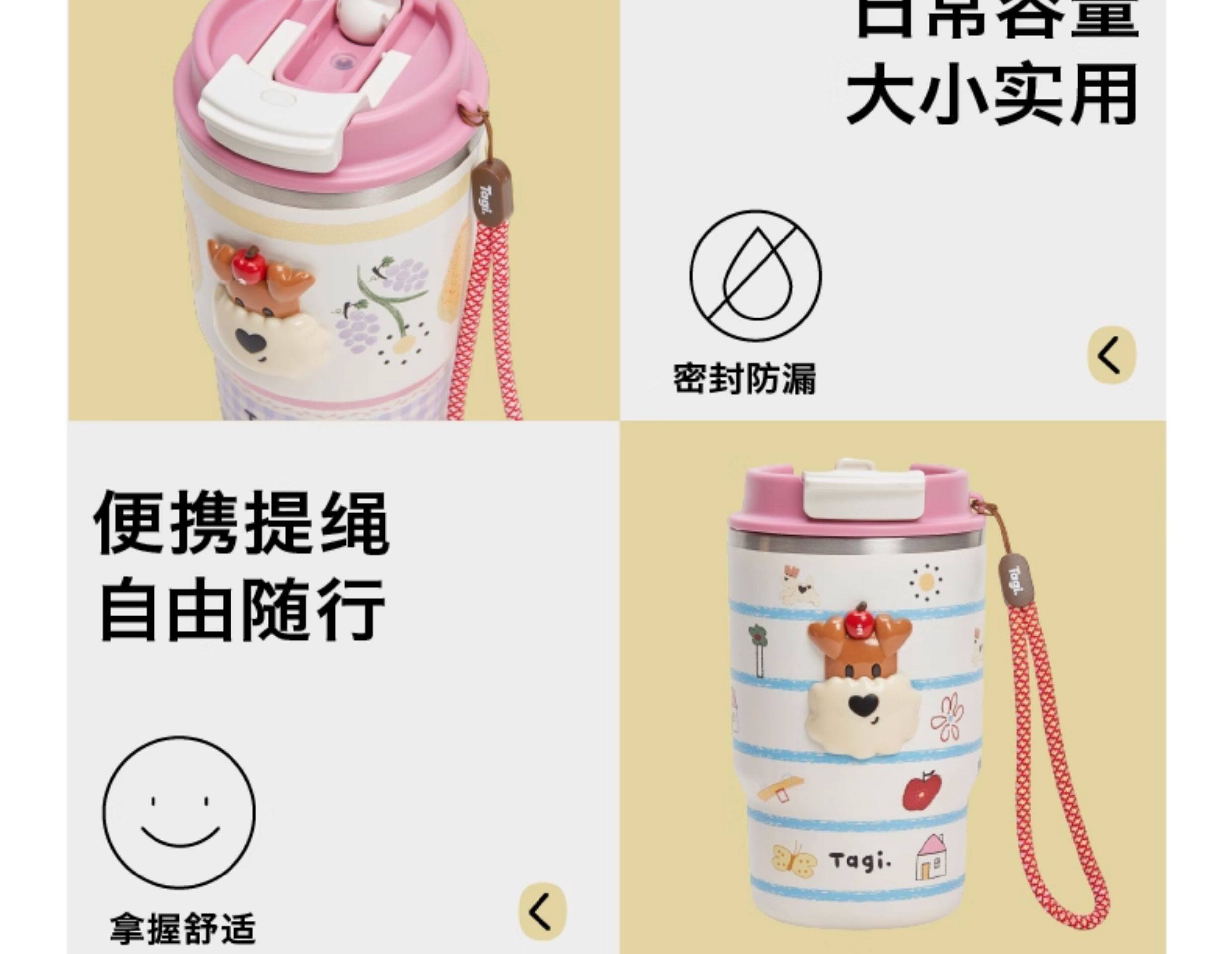 Tagi 爆米花双吸管咖啡保温杯 双饮吸管便携手拎不锈钢随行保冷保温杯随行杯