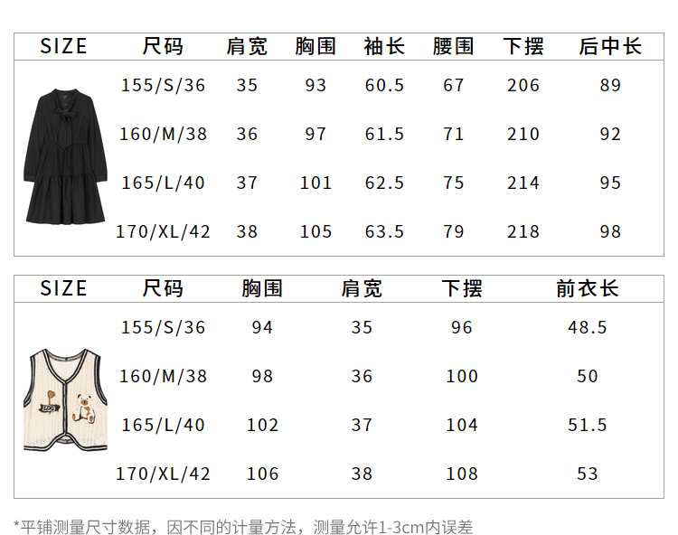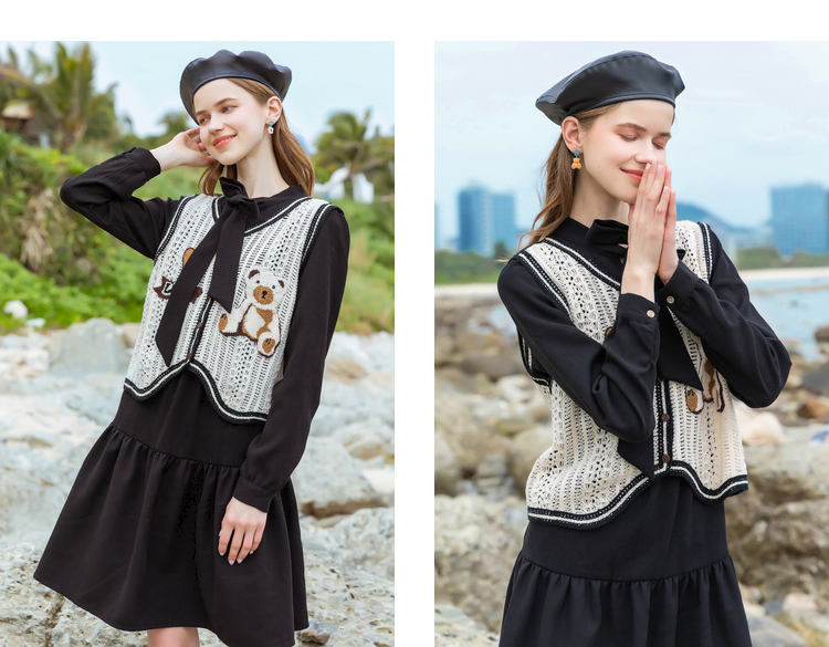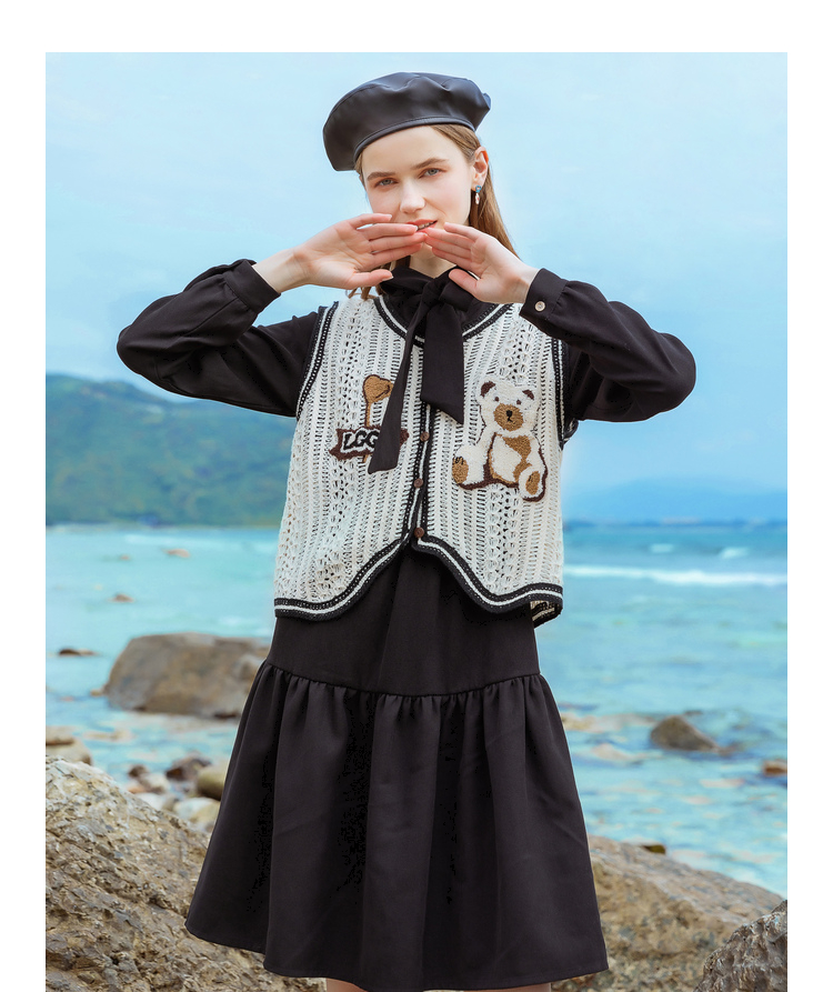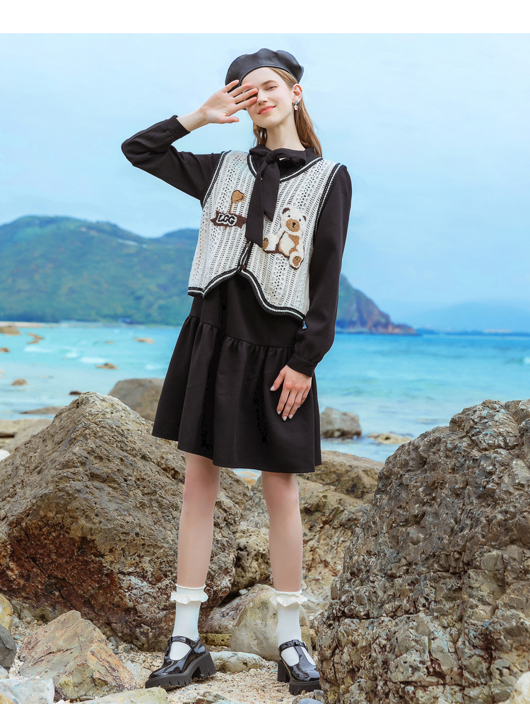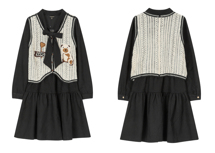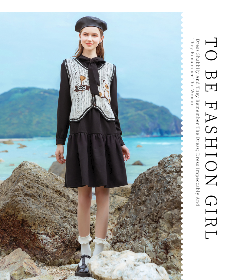 Lagogo拉谷谷2022春季新款学院风马甲黑色高腰V领连衣裙两件套女LALL832A61
