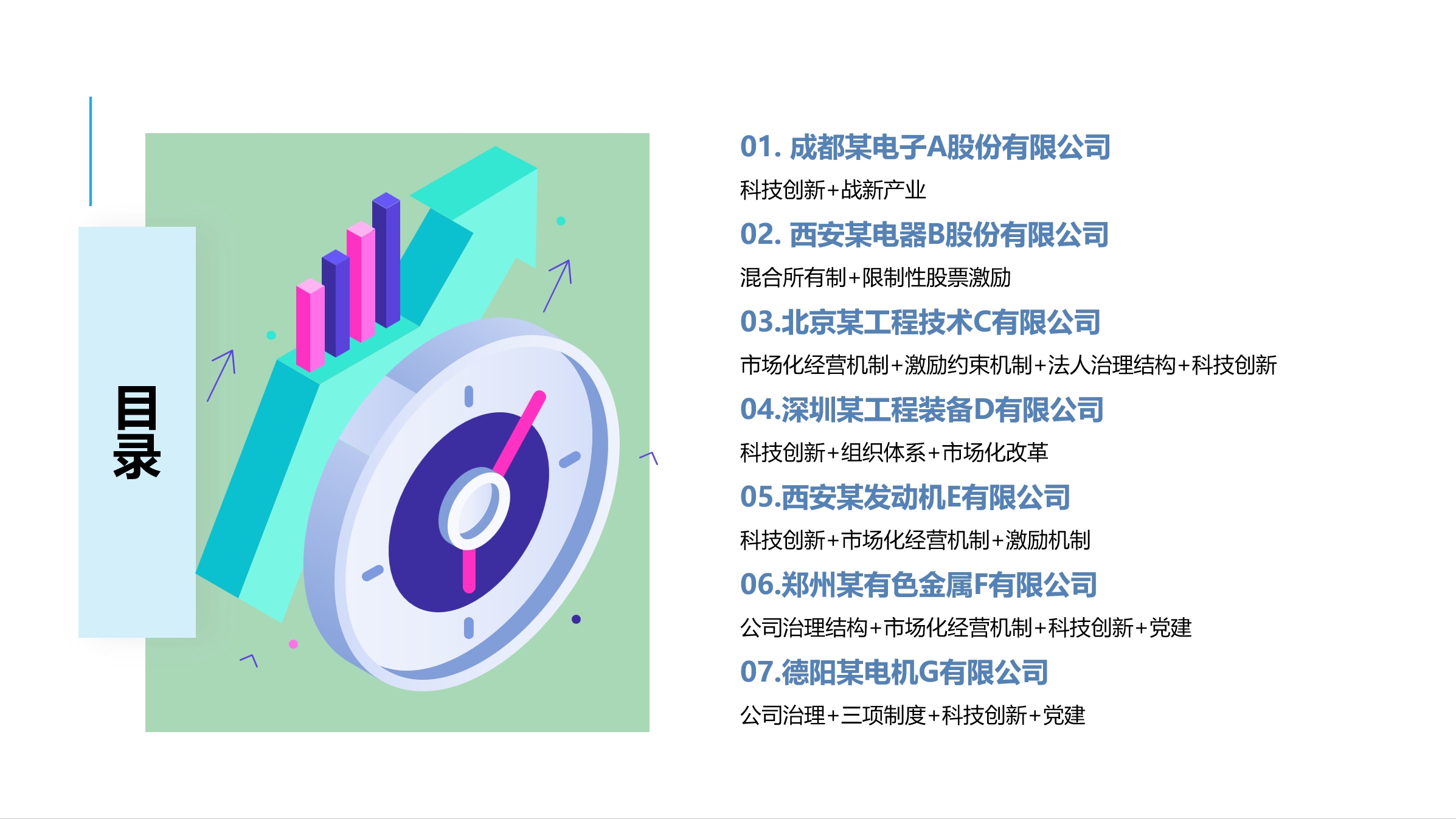 从改革重点举措看,成都某电子A股份有限公司重点改革科技创新体系和战新产业;西安某电器B股份有限公司重点进行混合所有制改革与限制性股票激励;北京某工程技术C有限公司重点针对市场化经营机制、激励约束机制、法人治理结构以及科技创新进行改革;深圳某工程装备D有限公司在科技创新体系、企业组织体系与市场化改革方面持续深耕改革;西安某发动机E有限公司重点在科技创新、市场化经营机制以及激励机制方面进行改革;郑州某有色金属F有限公司在公司治理结构、市场化经营机制、科技创新体系以及党的建设方面进行重点改革;德阳某电机G有限公司在公司治理、三项制度改革、科技创新体系和党的建设方面进行改革。
