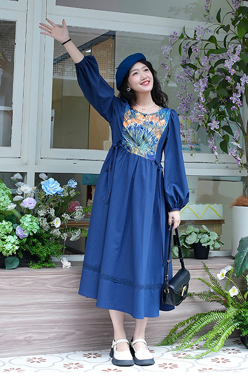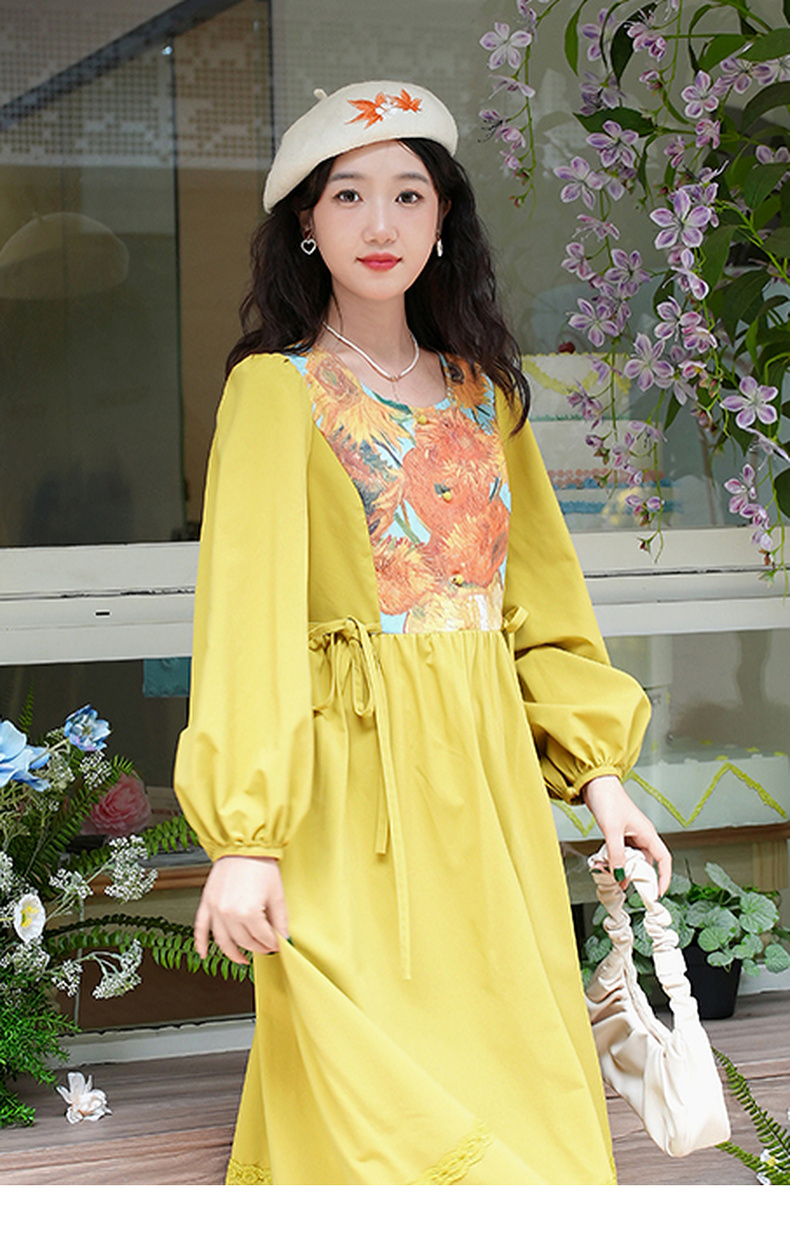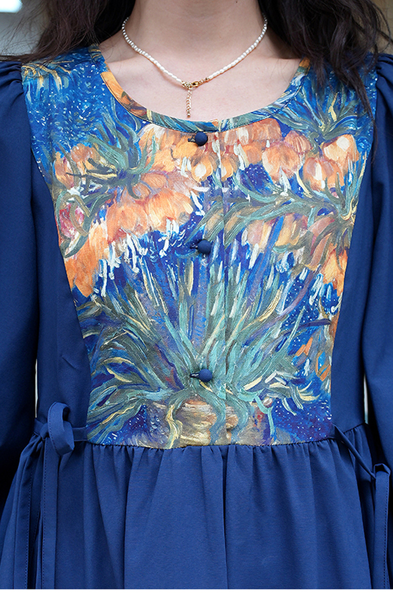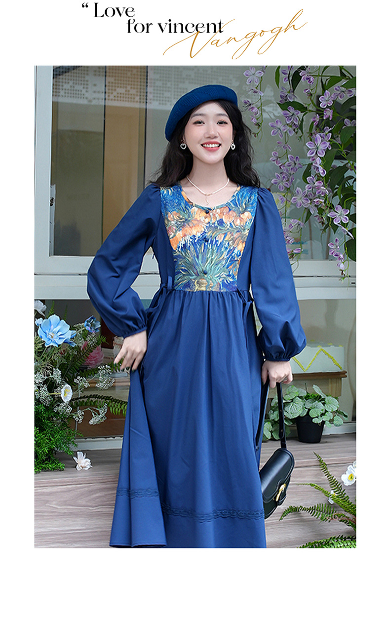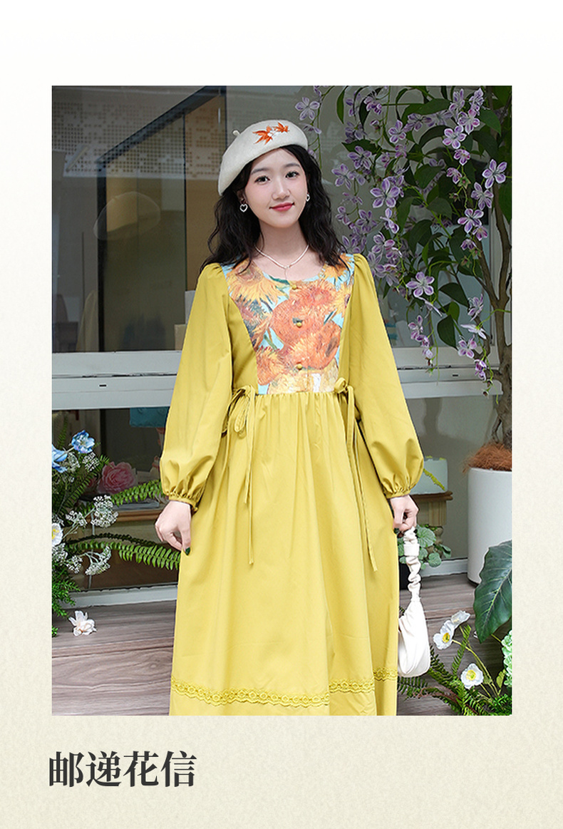 两三事梵高文艺邮递花信 2025秋季新款复古印花拼接a字连衣裙