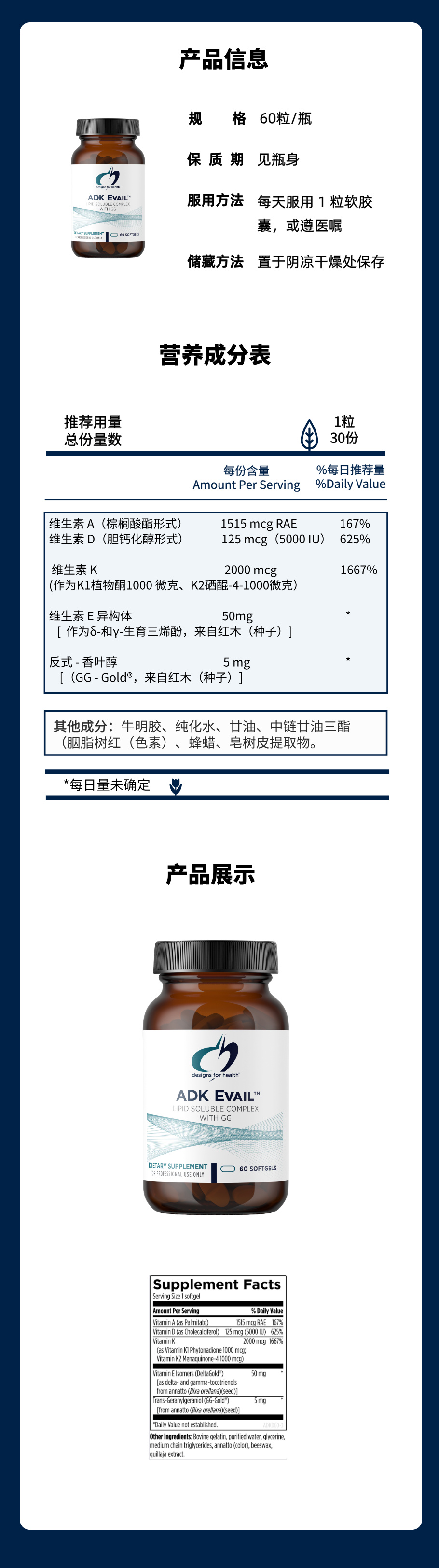 【香港直邮】【效期为26.08】健康设计ADK Evail维生素胶囊 60粒/瓶