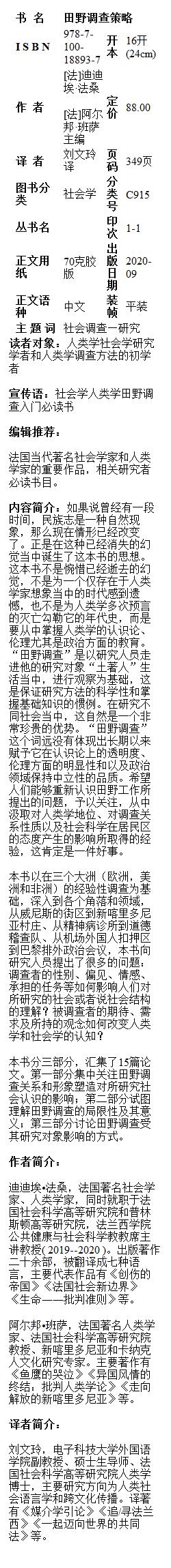 田野调查策略 [法]迪迪埃·法桑 [法]阿尔邦·班萨 主编 刘文玲 译 商务印书