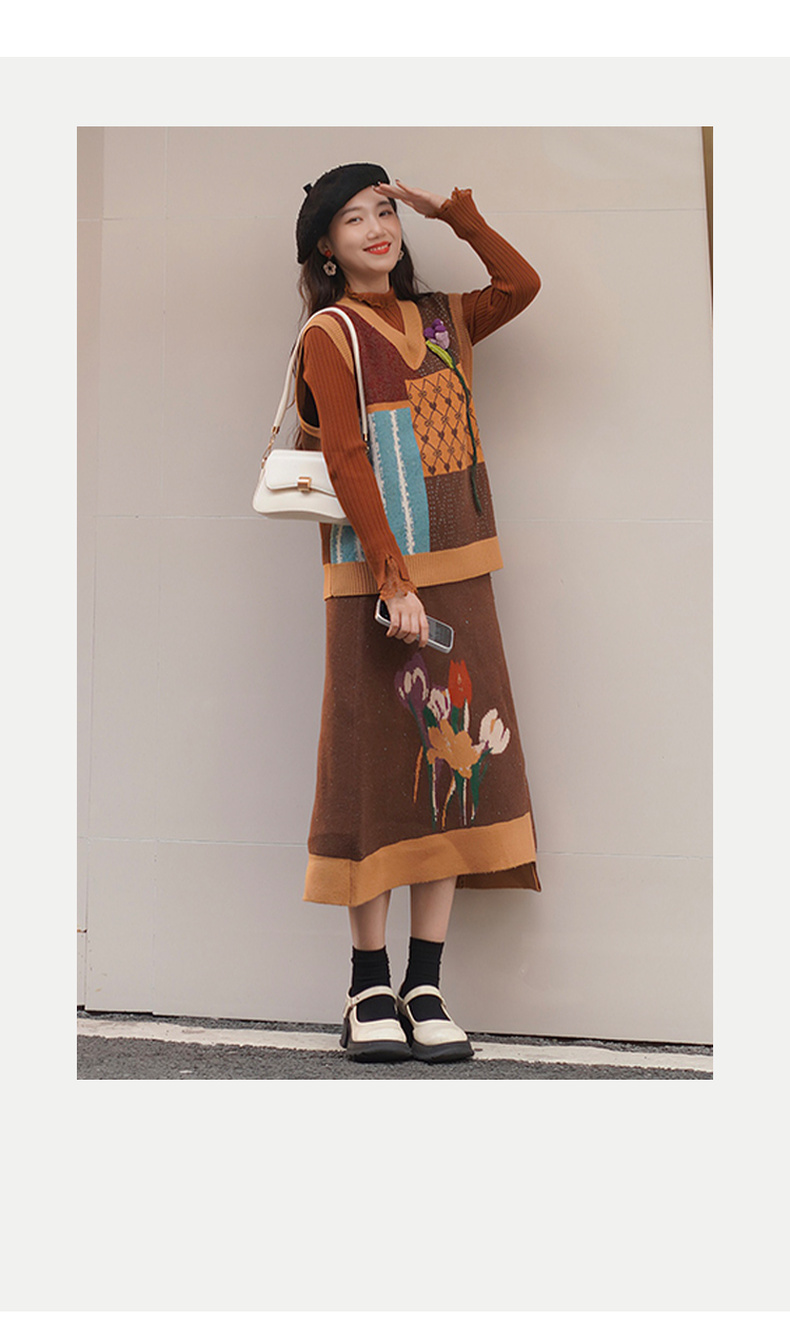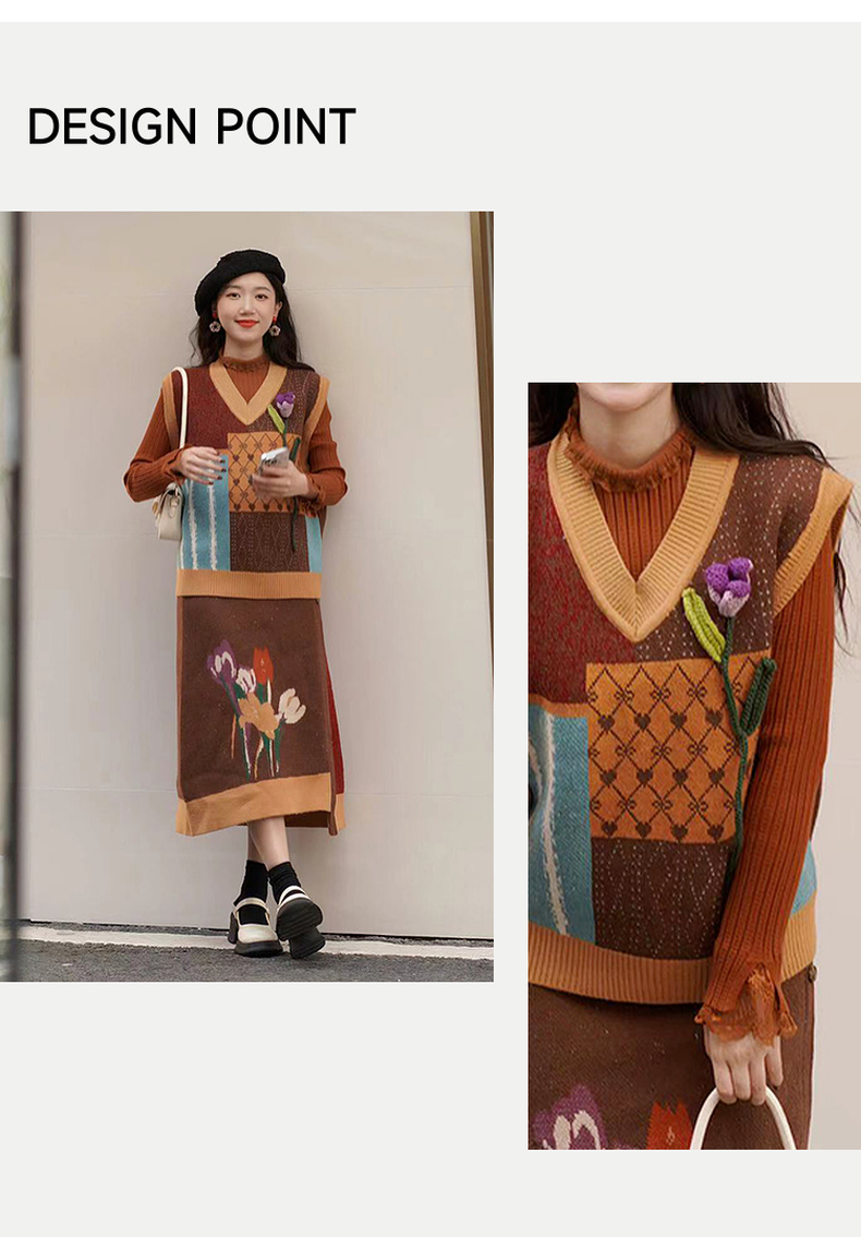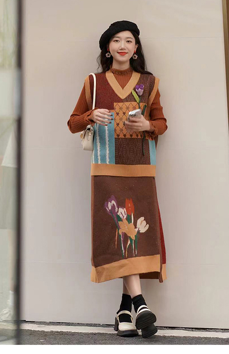 两三事梦境织语 冬季新款森女风立体花朵针织两件套女时尚套装
